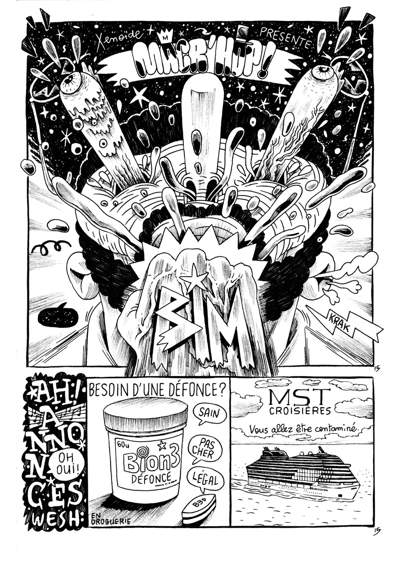 Trouvez ci dessous la double page titre accompagnées de leurs strips (chaque page est composée d’une BD format carré comportant 1 à 12 cases, suivie d’un strip, connecté à la BD mais indépendant, élargissant et éclaircissant l’univers.