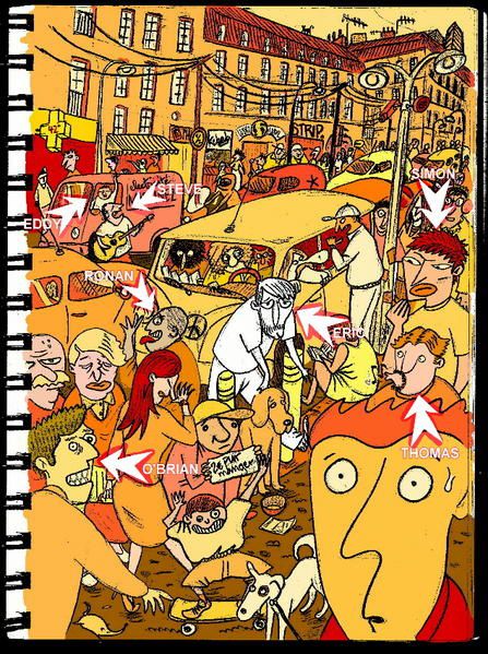 Ci-contre, l’illustration de « Caliente », dans laquelle j’ai fais apparaitre les membres du groupe, ainsi que ma gueule, au centre bien-sûr.