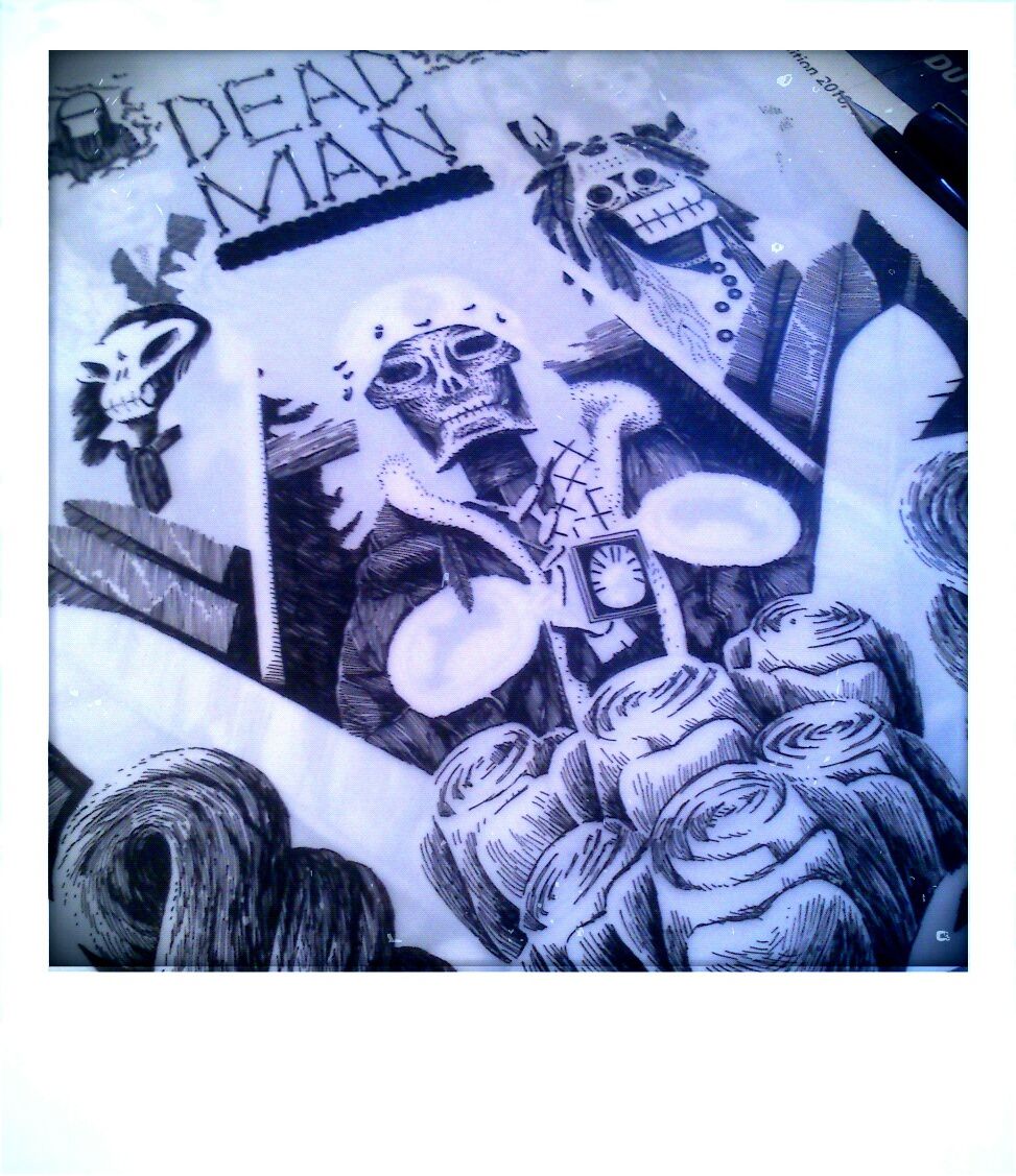 DEAD MAN est sans doute le film auquel je porte un amour inconditionnel, tout y est parfait pour moi, même les imperfections. Film totalement indépendant, casting, genre, message, esthétique, musique, humour, tout y est. Ici, je présente une affiche vouée à être sérigraphiée, 3 couleurs en plus du trait… à suivre.