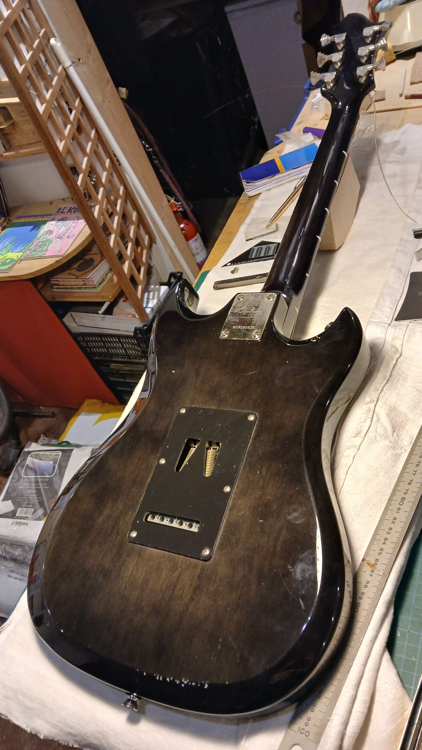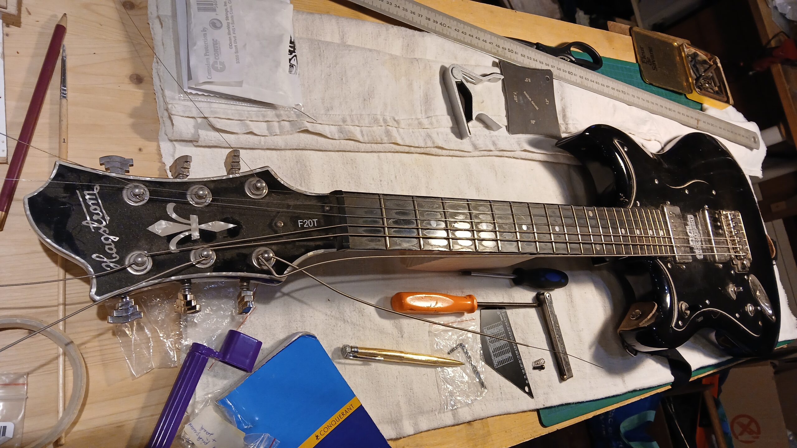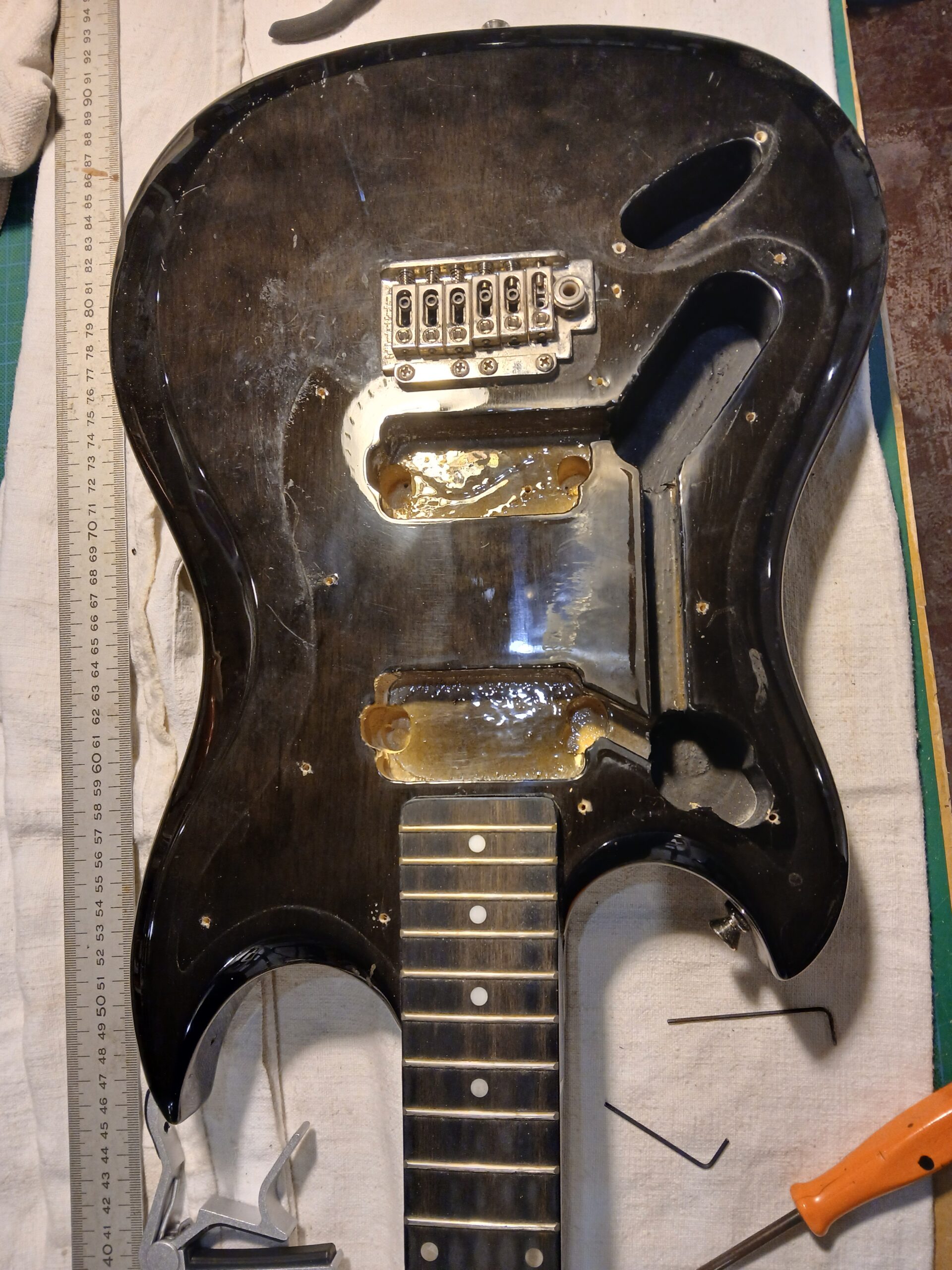 Démontage total de la guitare pour nettoyage individuel de toutes les pièces. L’électronique est propre, une soudure à refaire sur le jack, la cavité est pleine de sciure.
