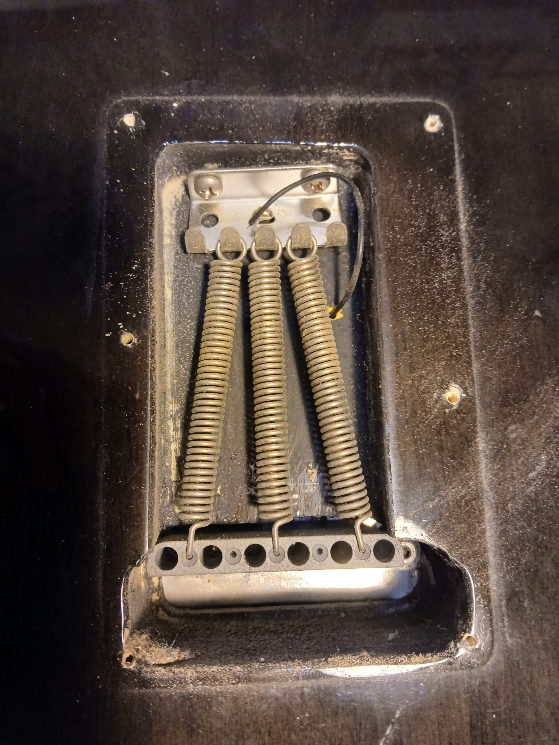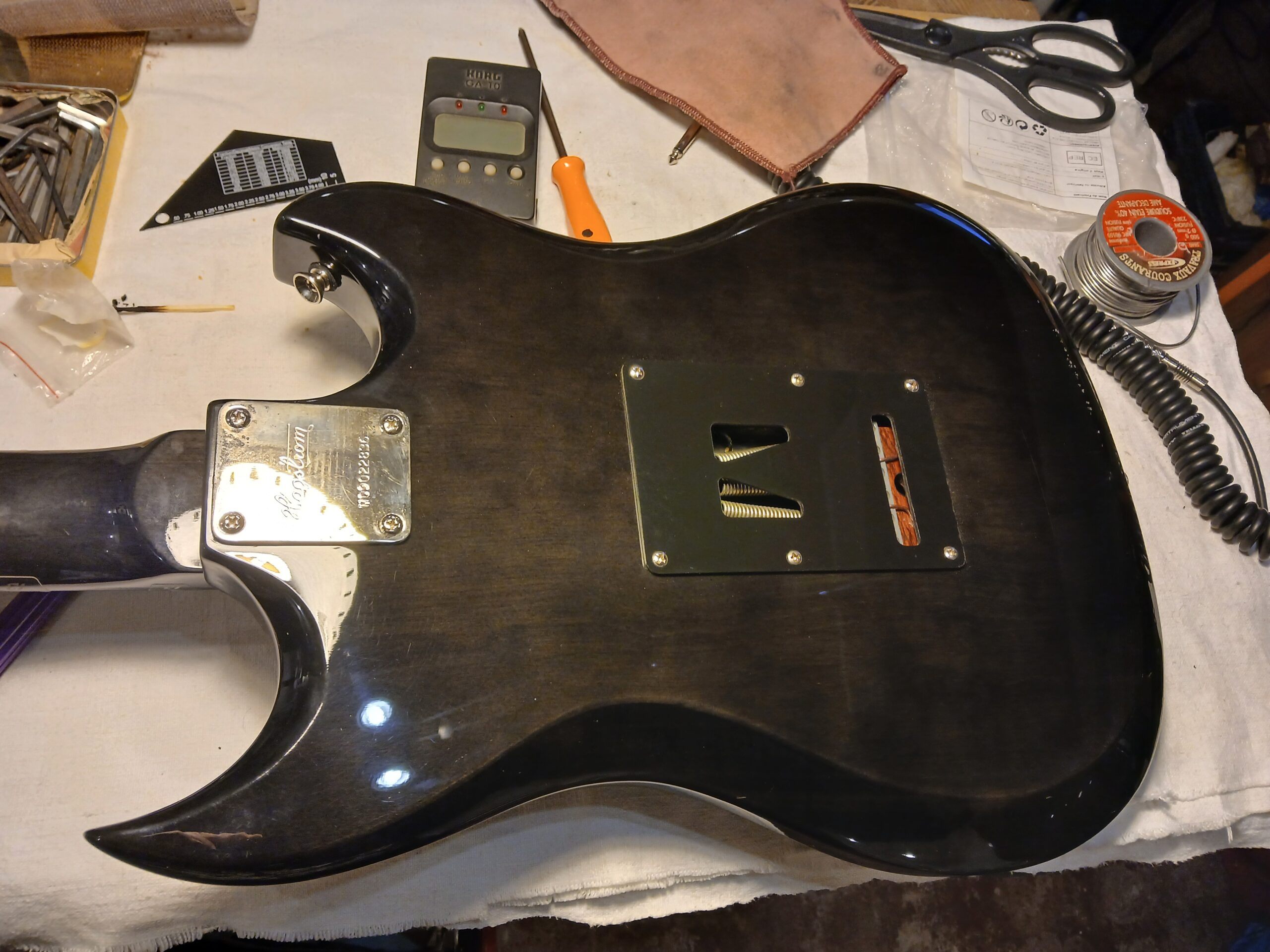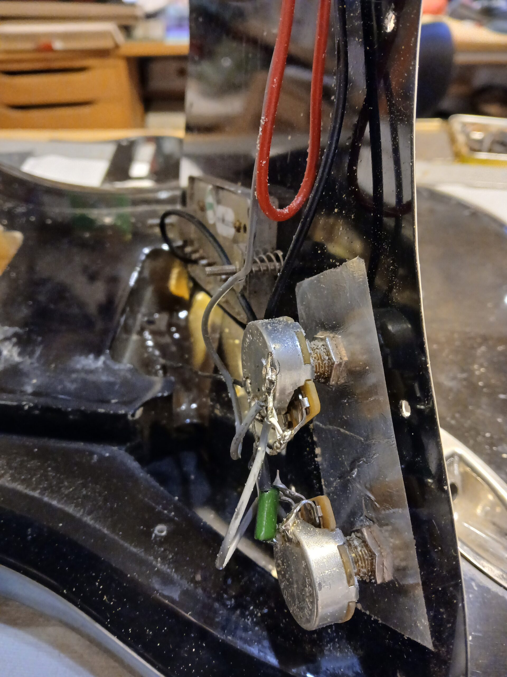 Démontage total de la guitare pour nettoyage individuel de toutes les pièces. L’électronique est propre, une soudure à refaire sur le jack, la cavité est pleine de sciure.
