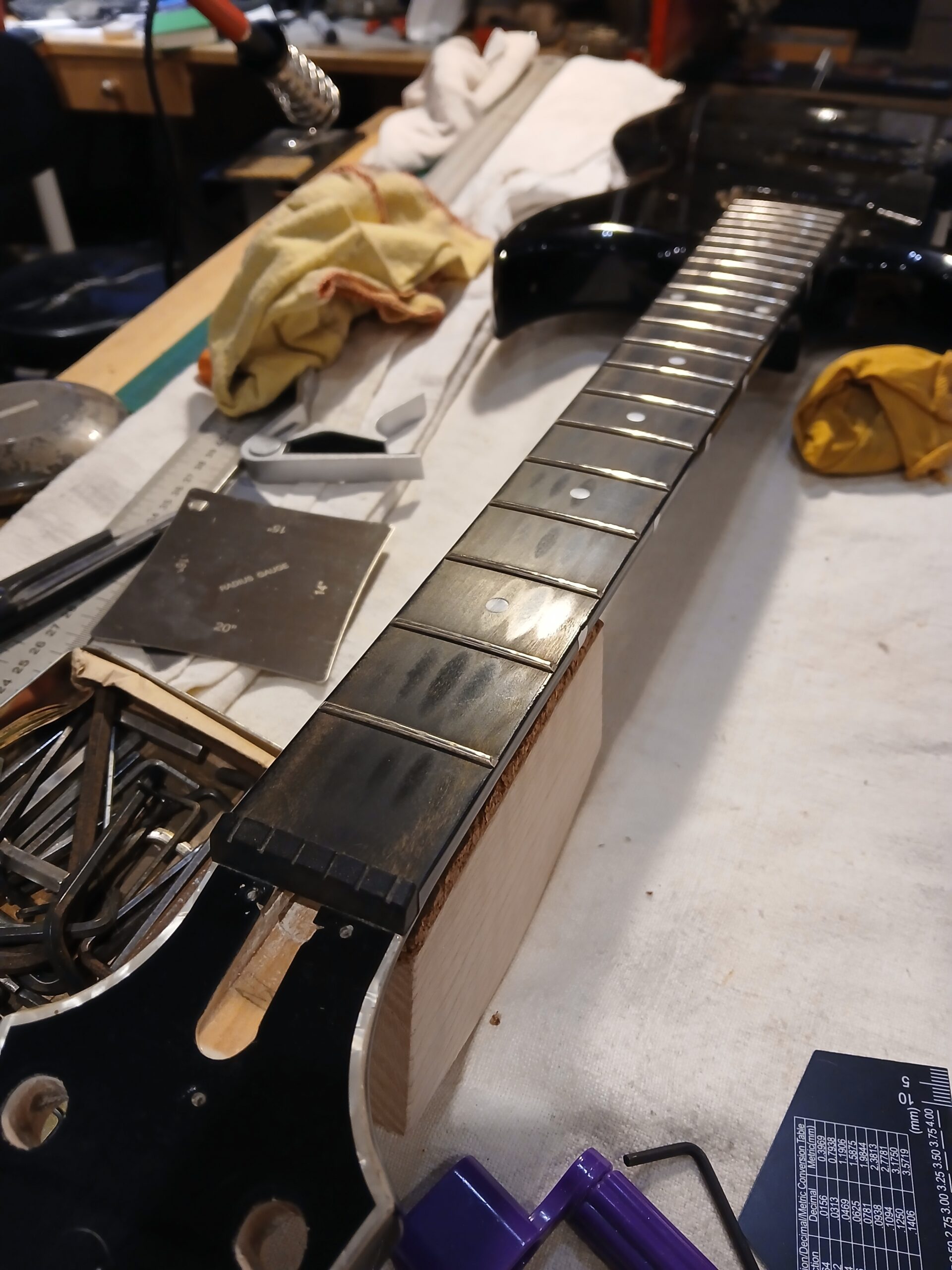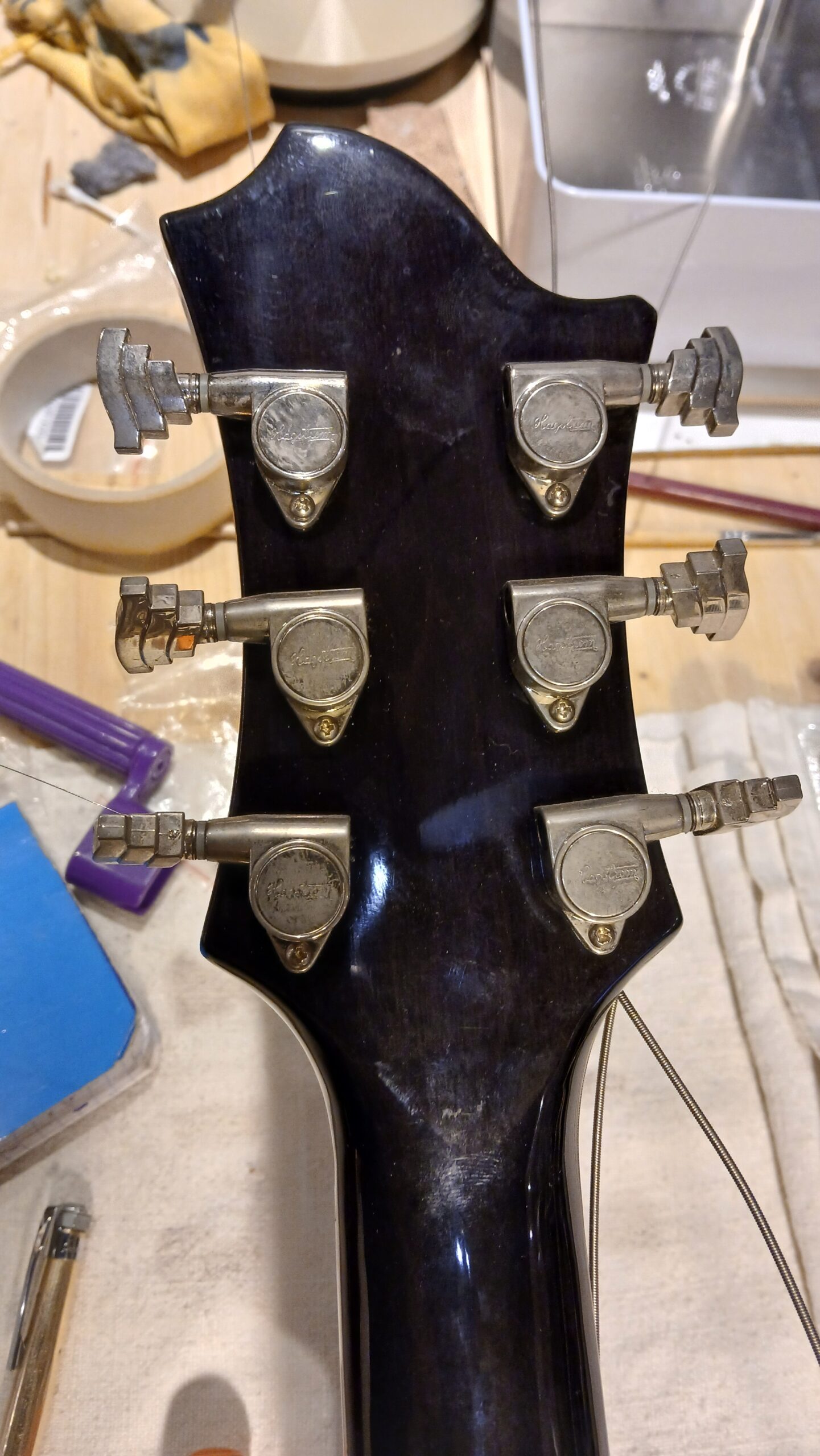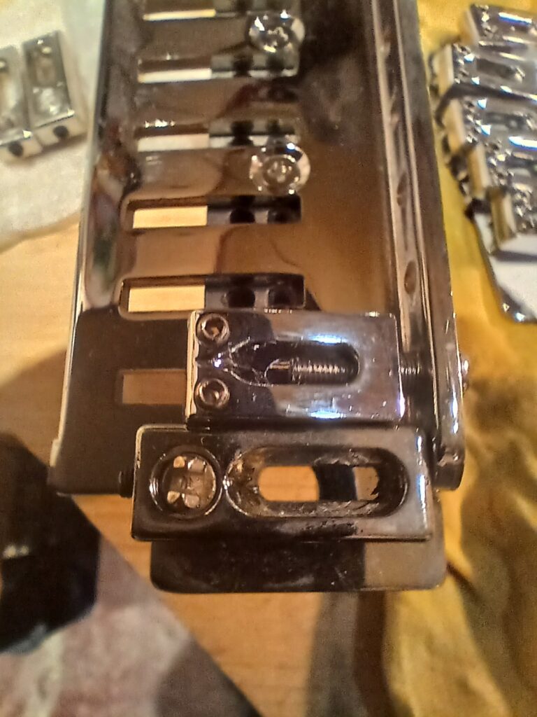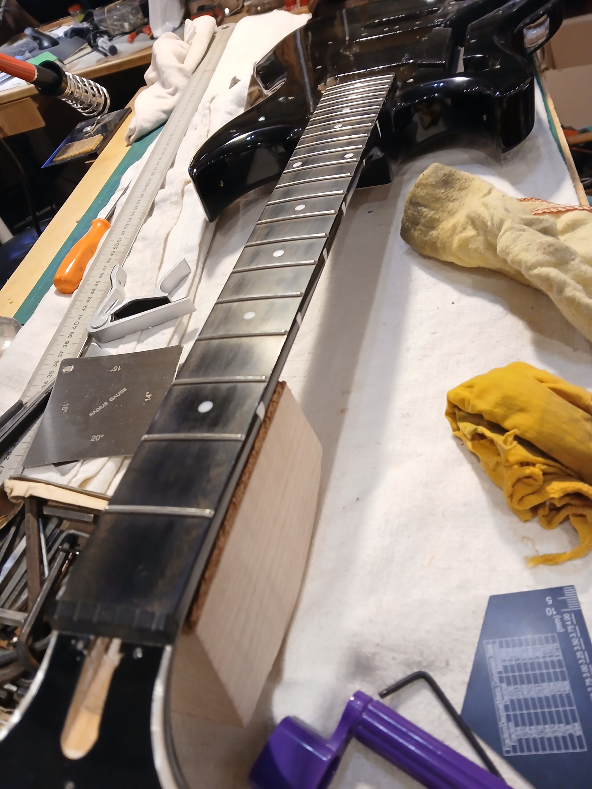 Un gros nettoyage de poussières et accumulations, certains chromes ne peuvent pas être restaurés. Nivellement au fret rocker et polissage des frettes