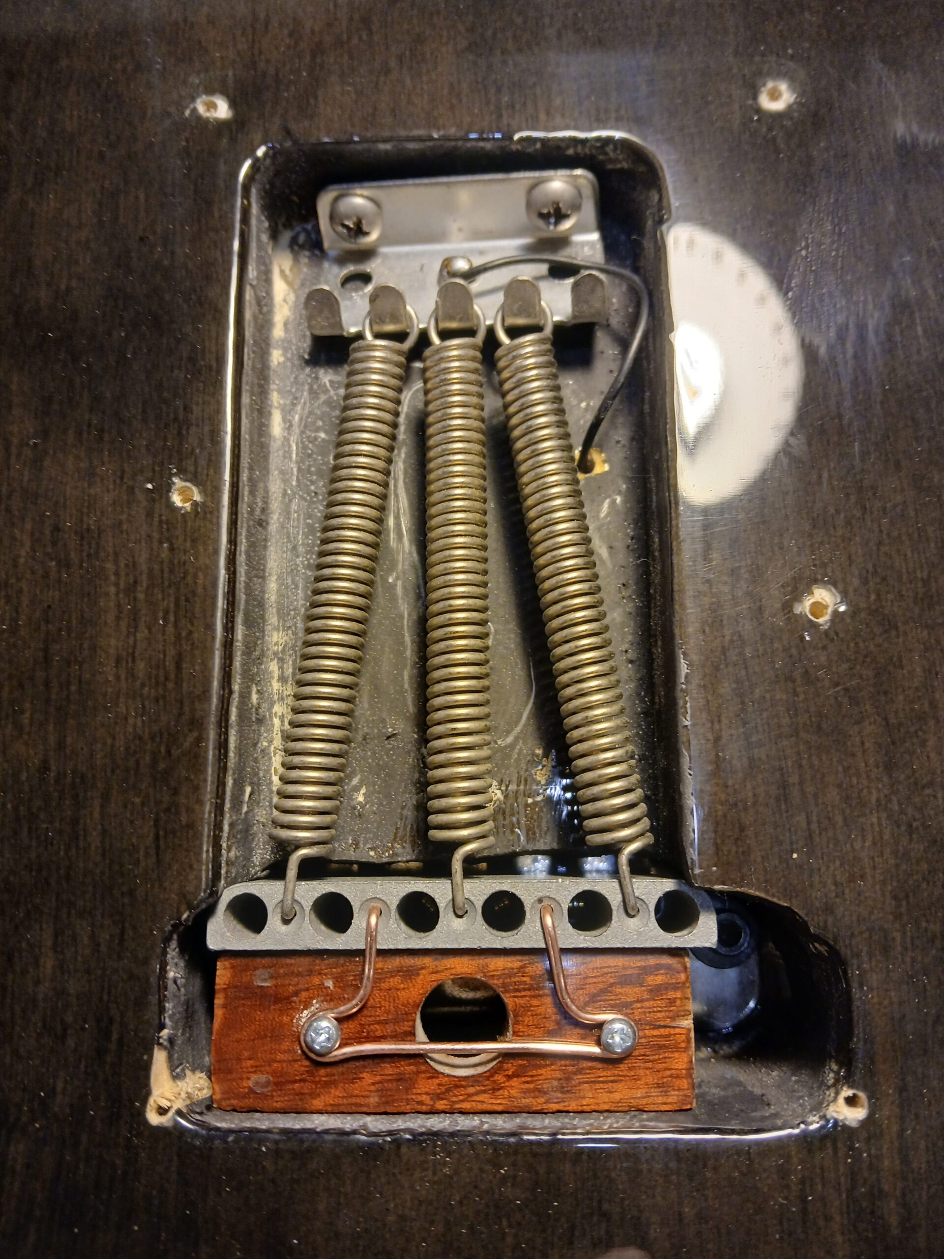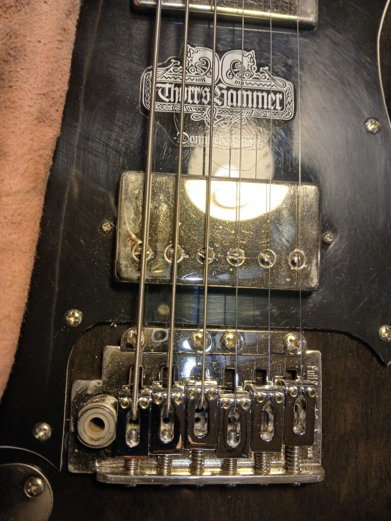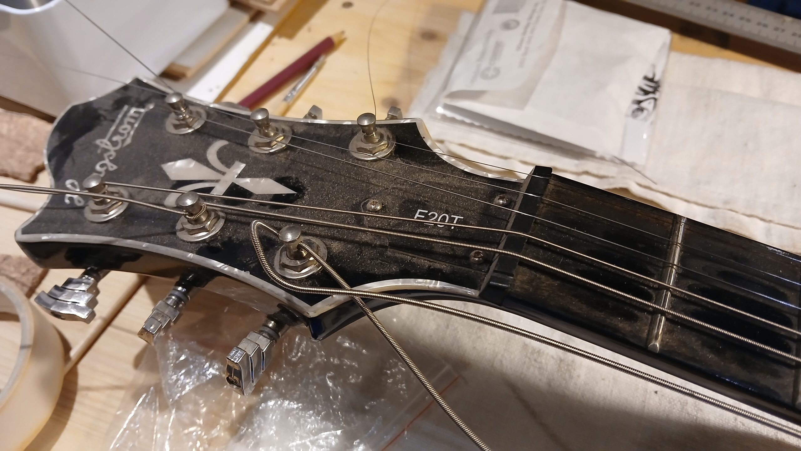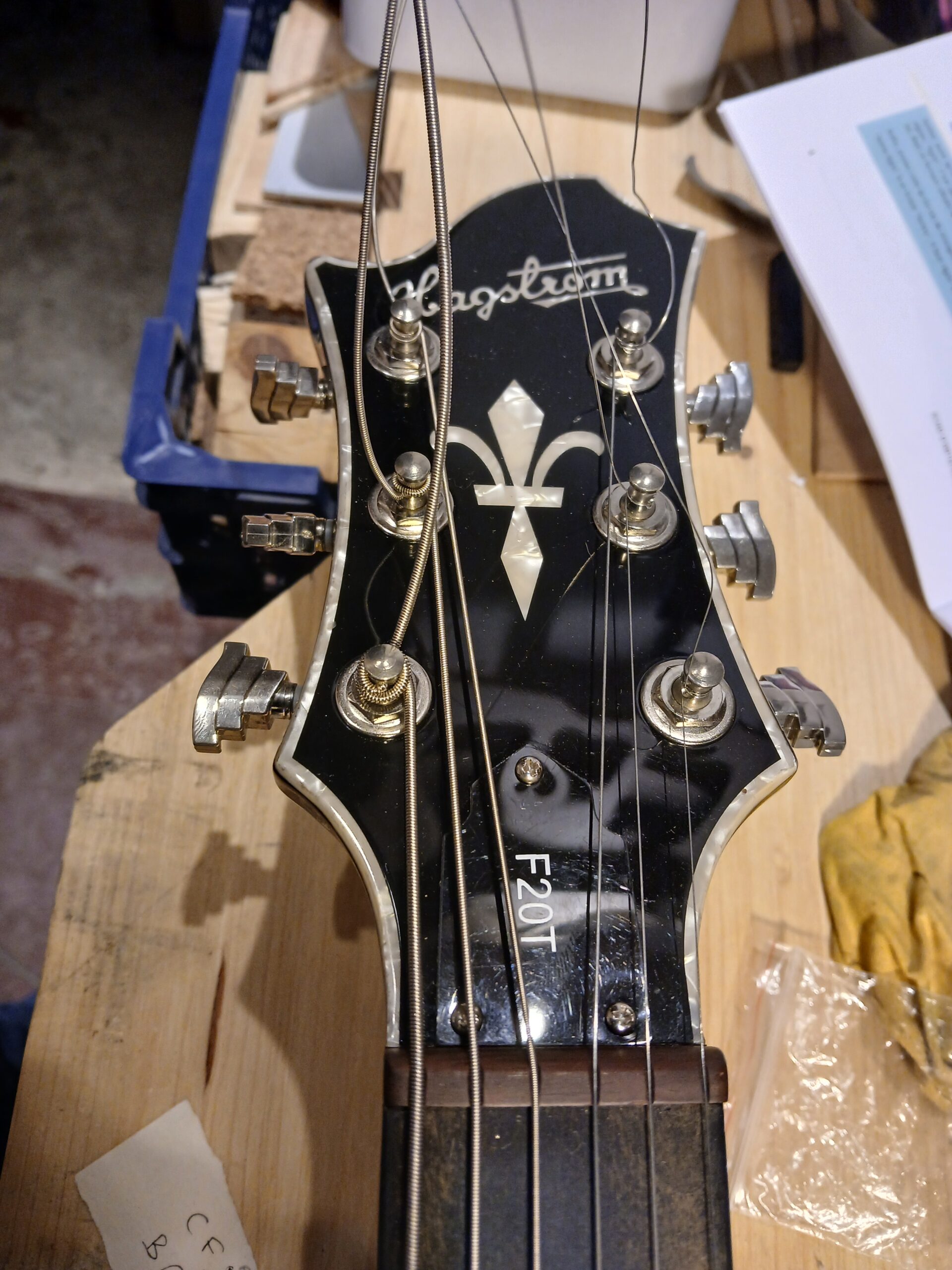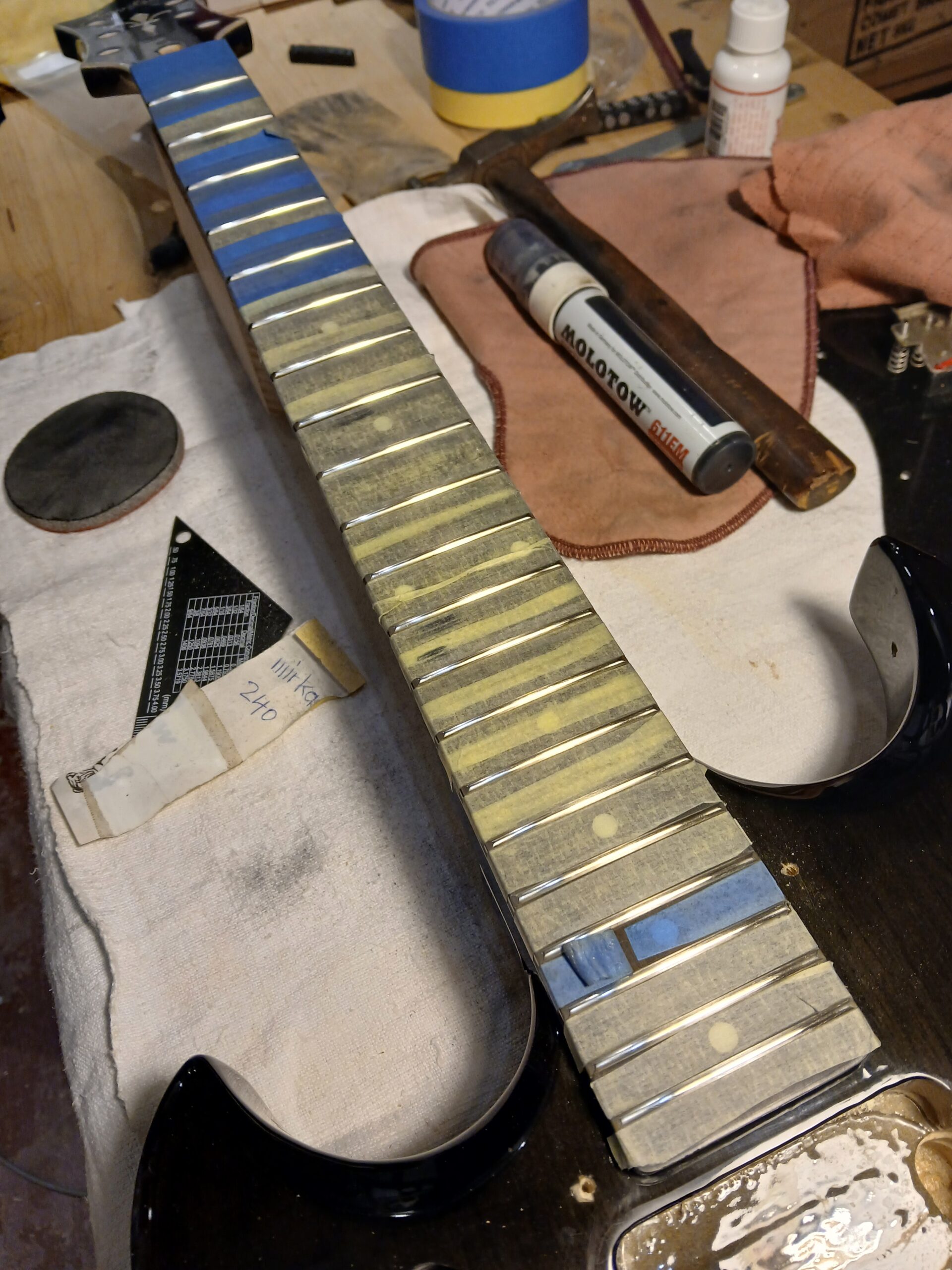 Un gros nettoyage de poussières et accumulations, certains chromes ne peuvent pas être restaurés. Nivellement au fret rocker et polissage des frettes