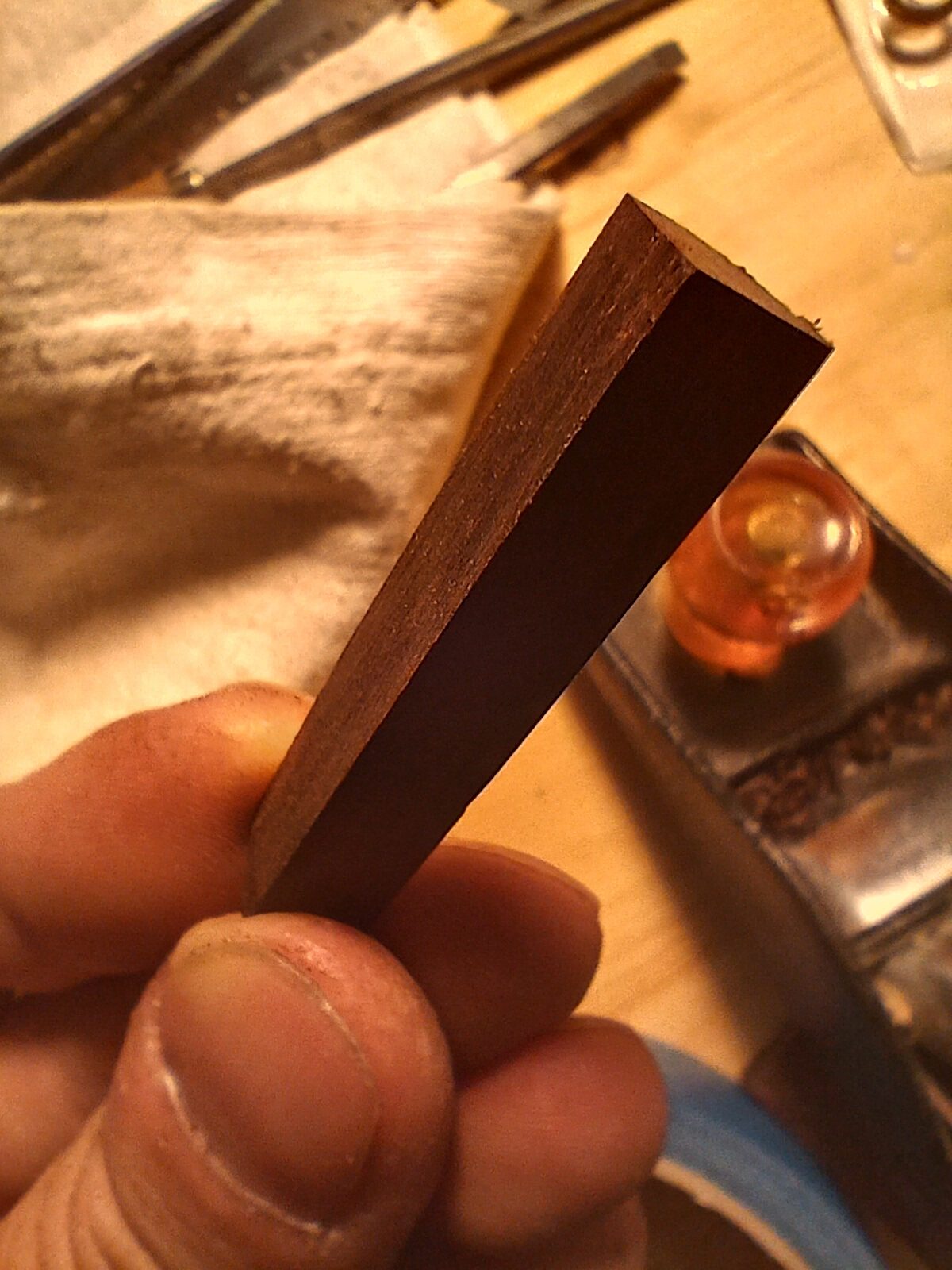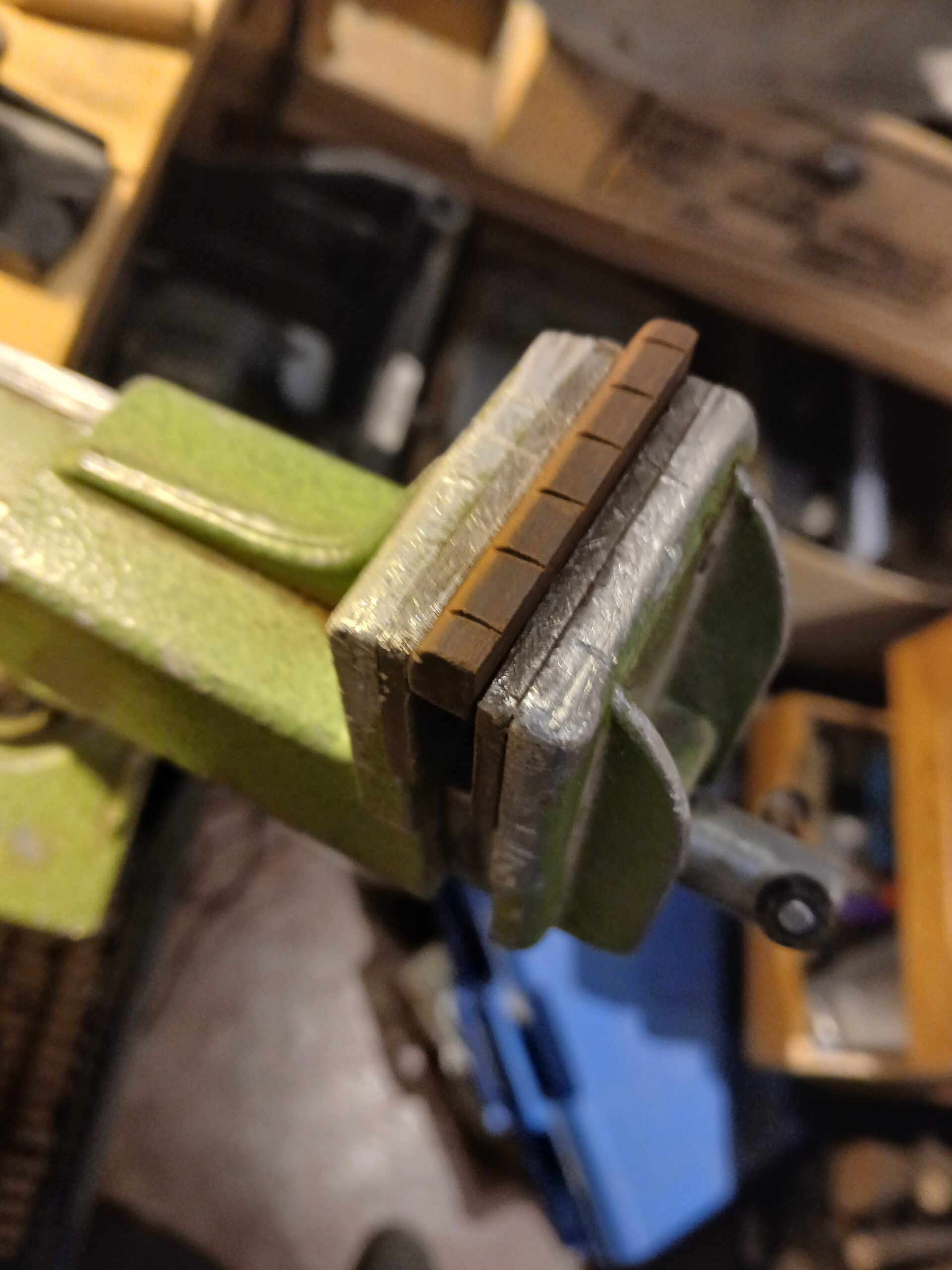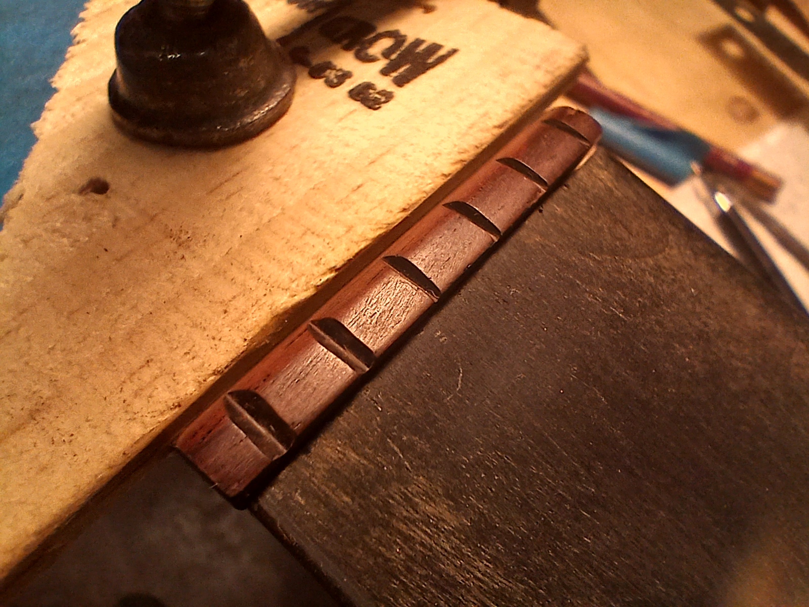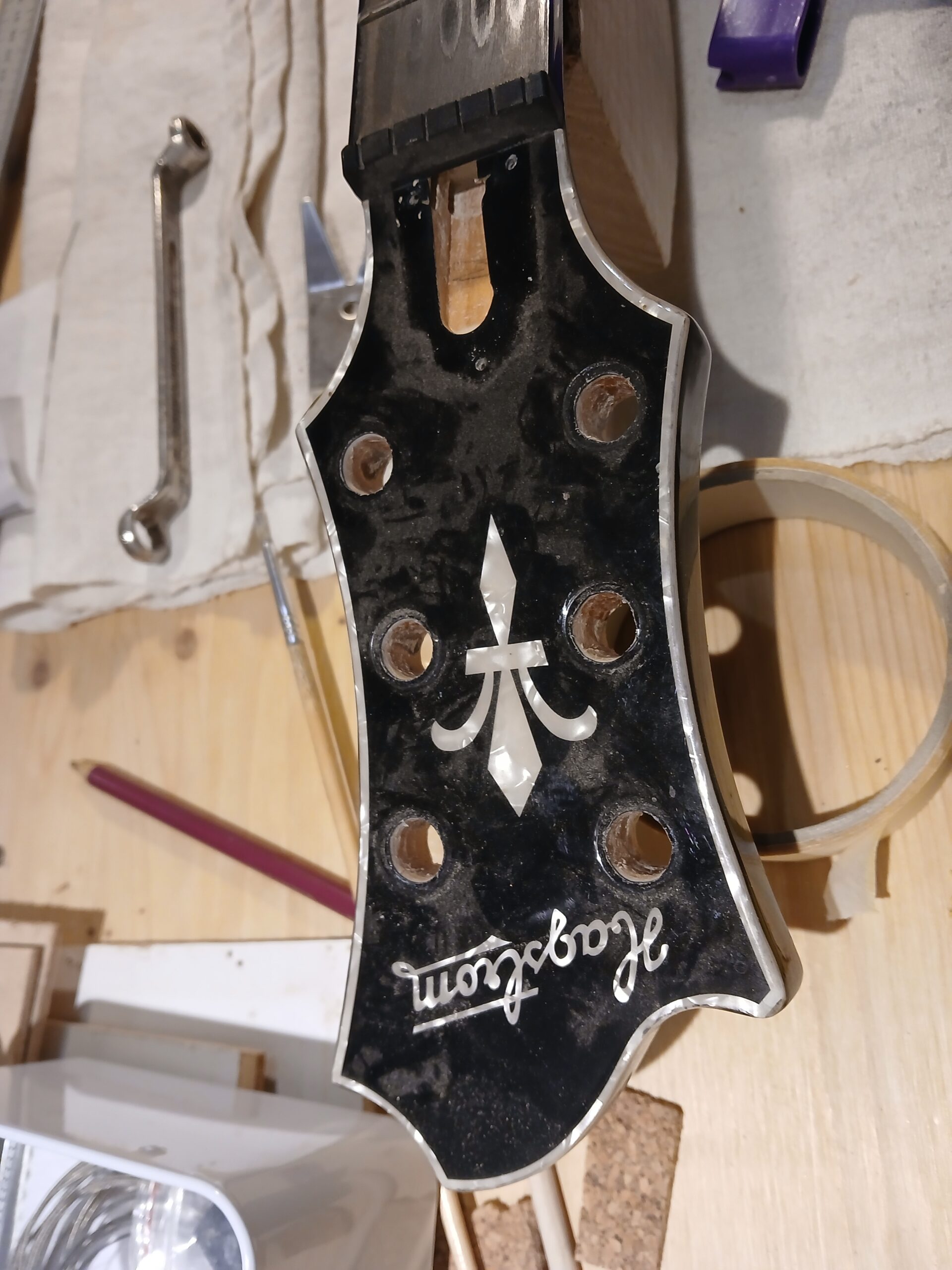 Création d’un nouveau sillet en acajou fourni pas le client. Le trussrod très spécial de chez hagstrom crée une zone vraiment pas optimale pour y poser un sillet, entre creux de défonce presque affleurant et le plastique qui habille la tête…