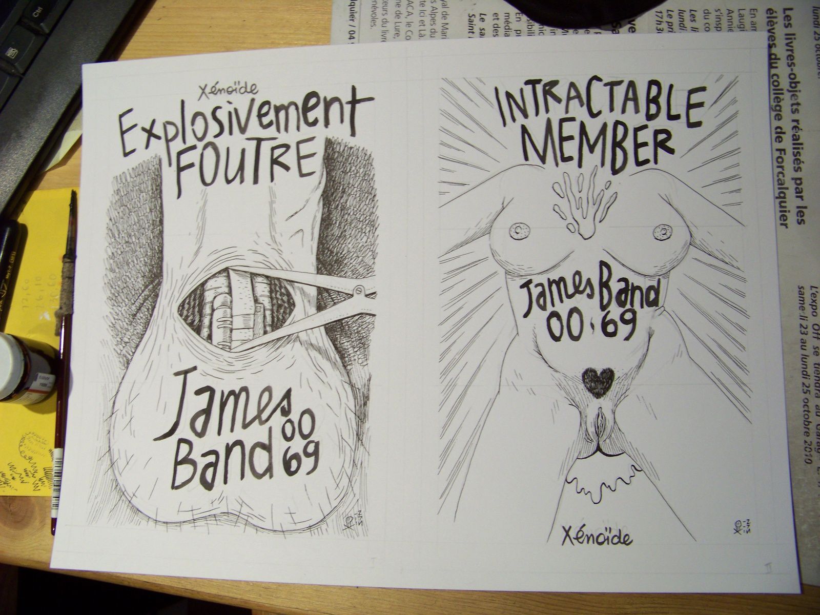 Droits d’auteurs obligent, je ne pourrais pas utiliser le vrai nom de James Bond 007, et puisque c’est une parodie mon James se nommera Band et son matricule d’agent secret 0069. Vous remarquerez les subtiles jeux de mots qui collent bien avec l’histoire. Ci-dessous, les couvertures des deux premiers volets de la trilogie James Band 0069 – X-PLOSIVE MEMBER.
