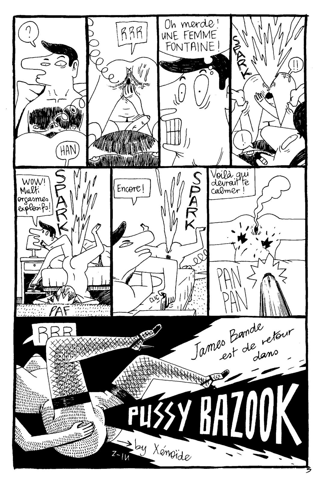 La première planche du troisième volet de la trilogie JAMES BANDE ! La planche 2 du 3e volet de la trilogie 007: PUSSY BAZOOK! Je continue l’introduction avec l’entrée en piste de l’agent du FBI Jack Rosewood. La planche 4 et l’apparition de James. Dernière planche de l’introduction, cette BD contient du porno explosif!