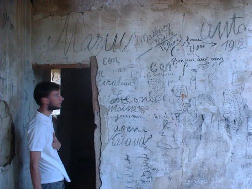 Des vieux tags au charbon de bois dans une maison troglodite.