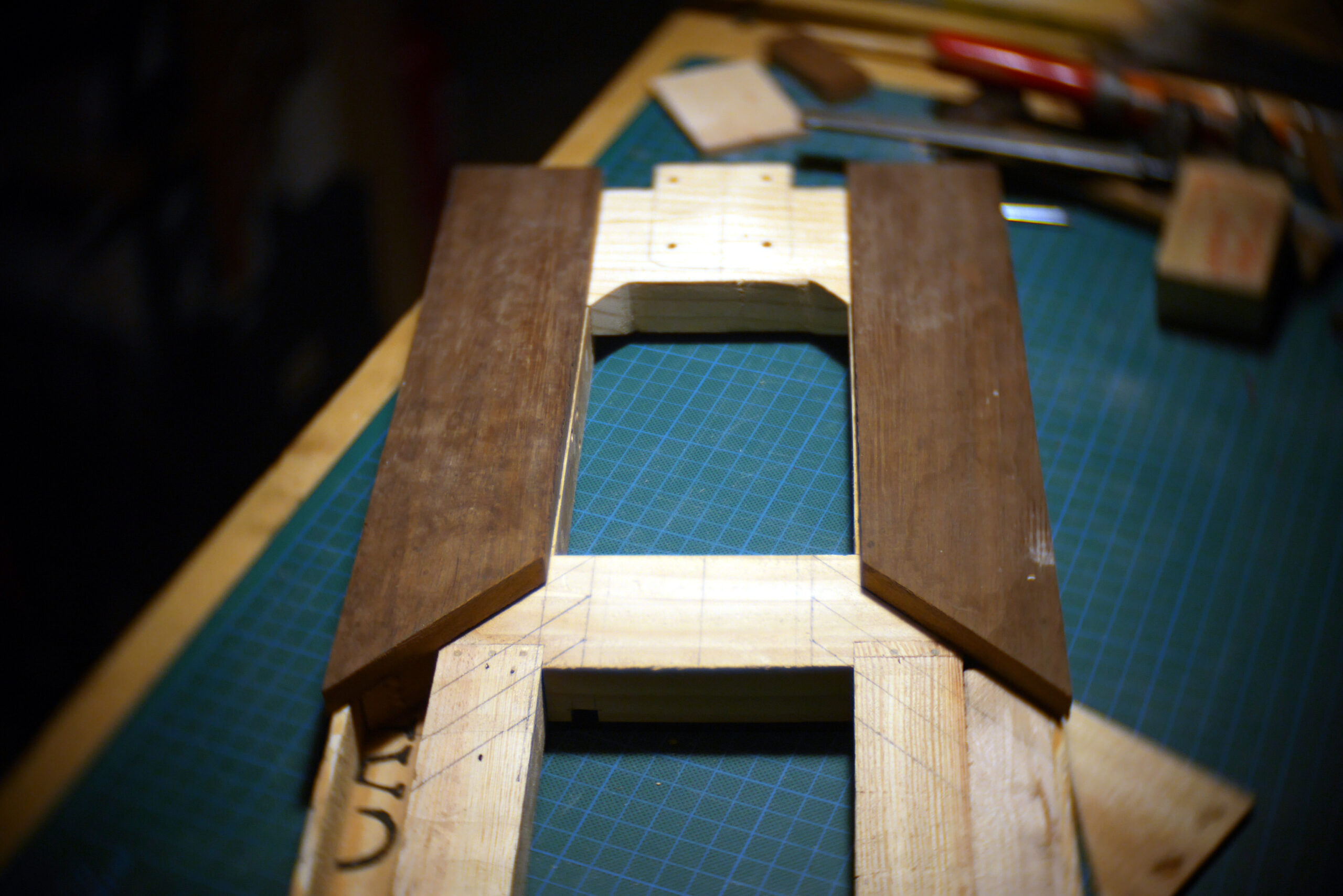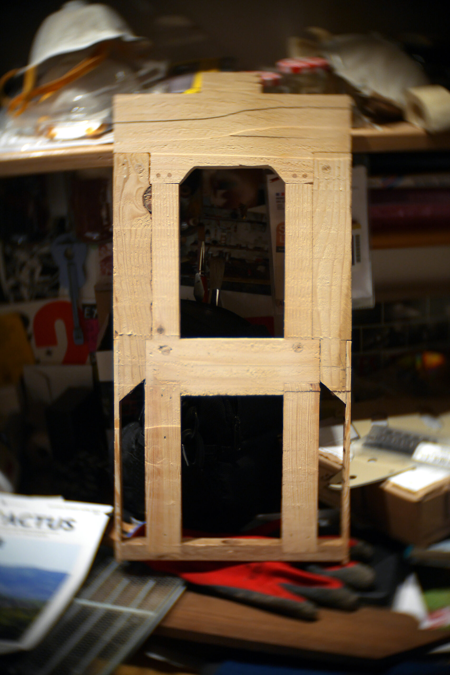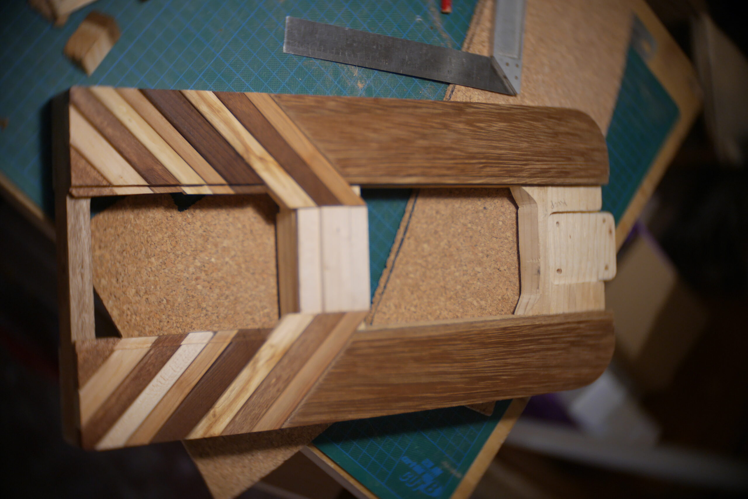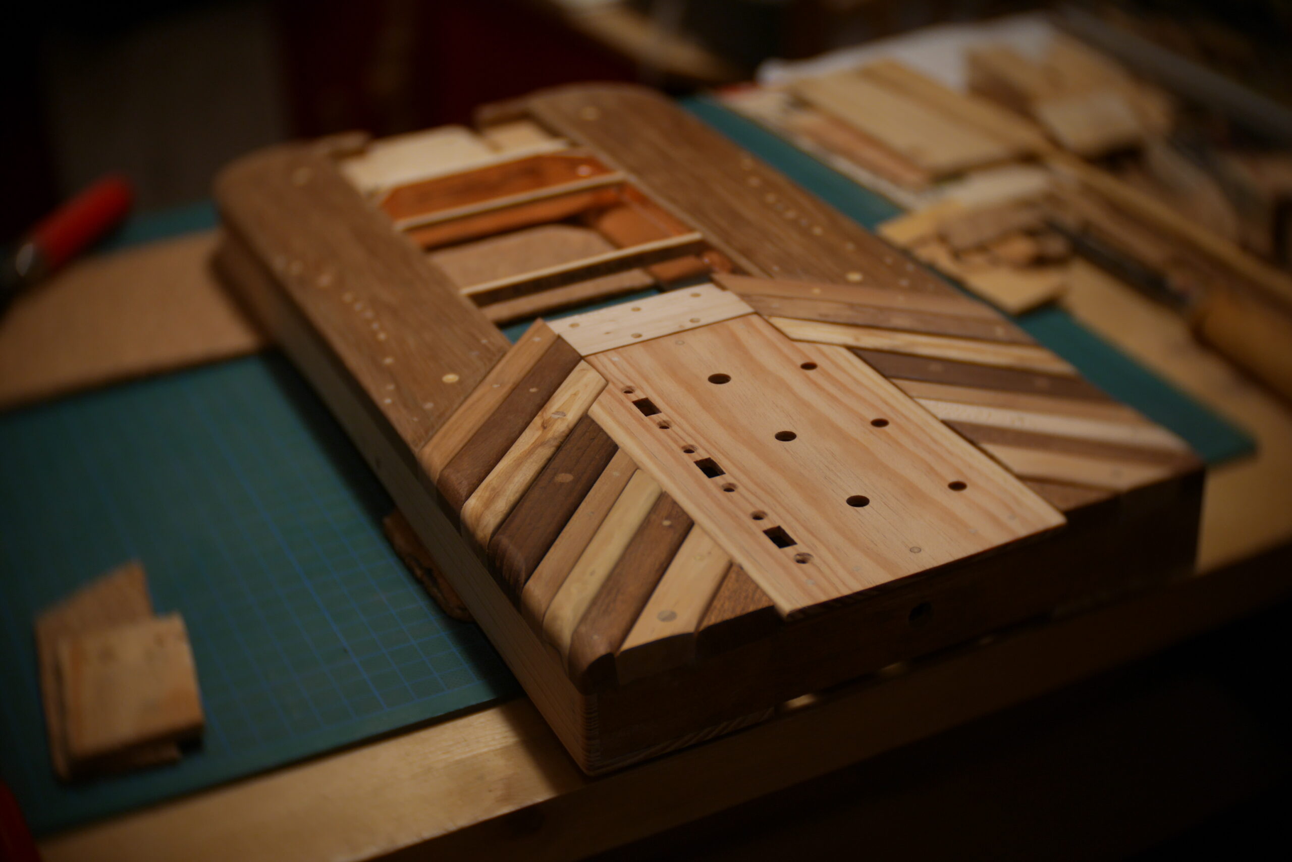 Conception en « sandwich » pour celle-ci, avec une structure centrale faite de chutes diverses, assemblées, collées, chevillées.