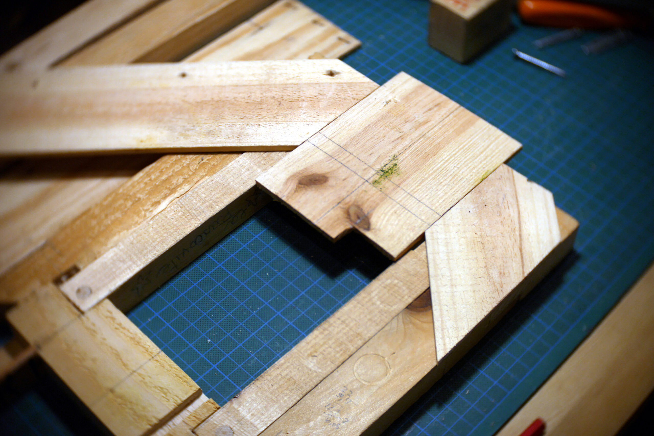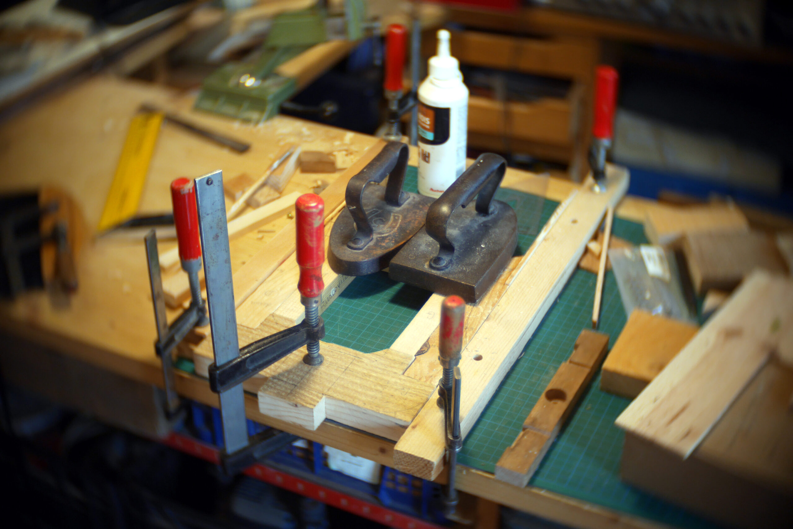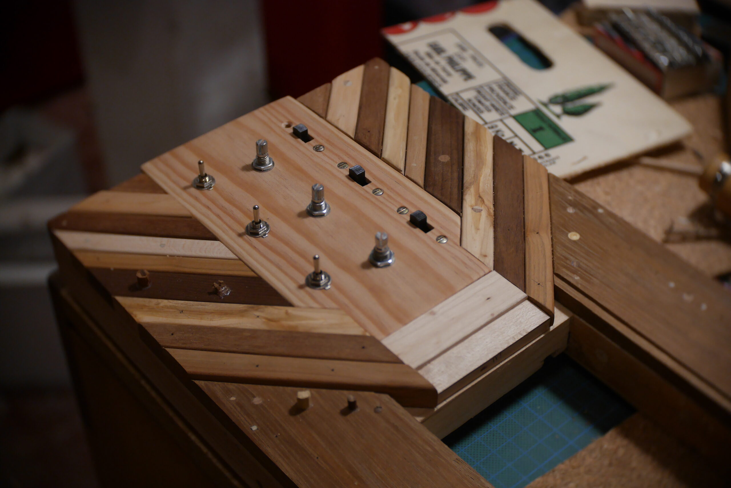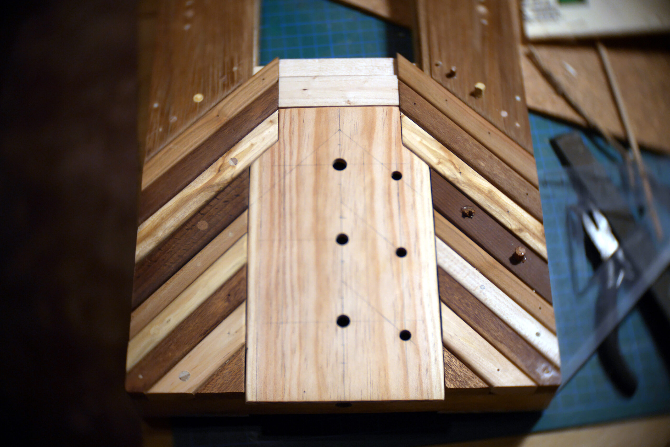 Conception en « sandwich » pour celle-ci, avec une structure centrale faite de chutes diverses, assemblées, collées, chevillées.