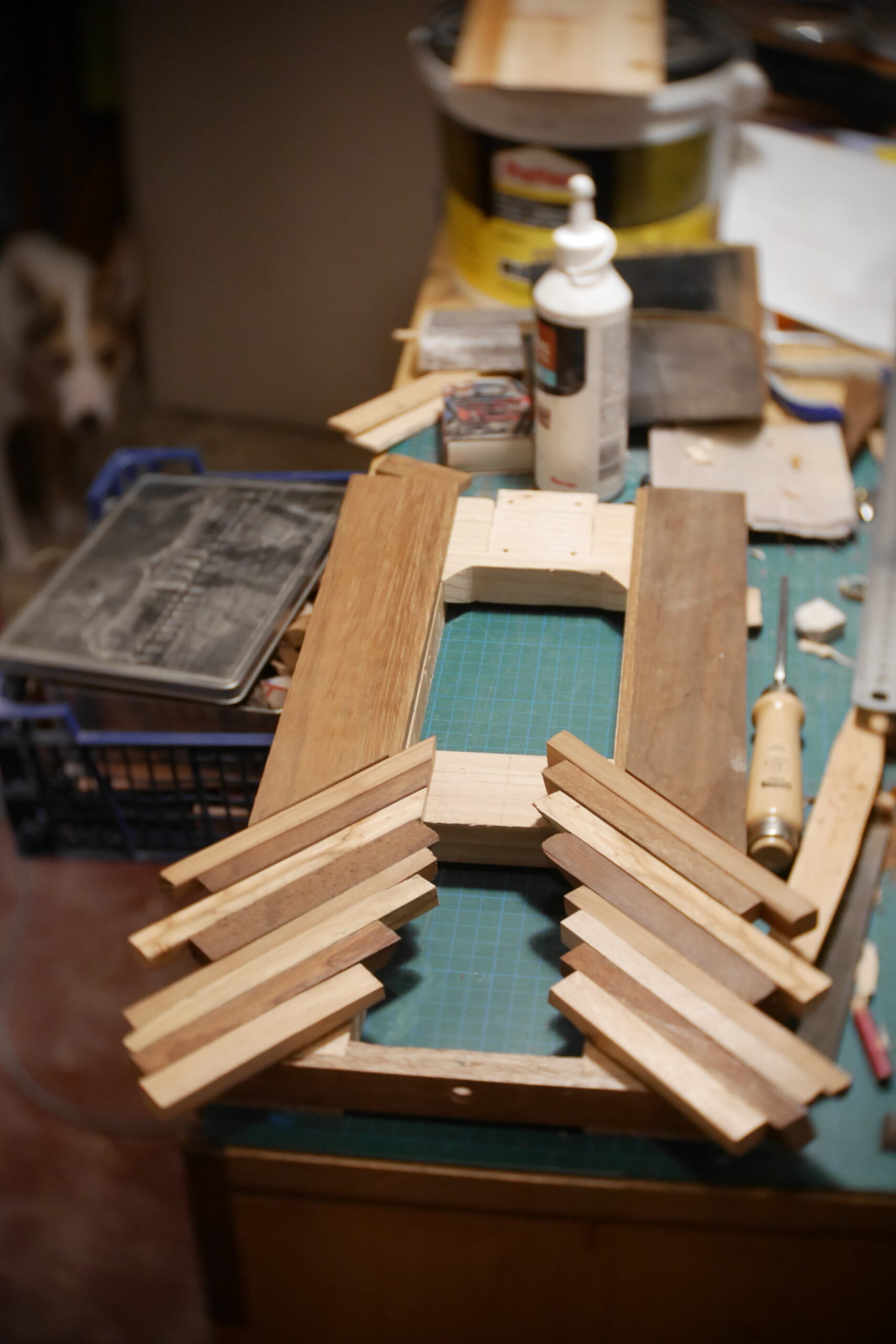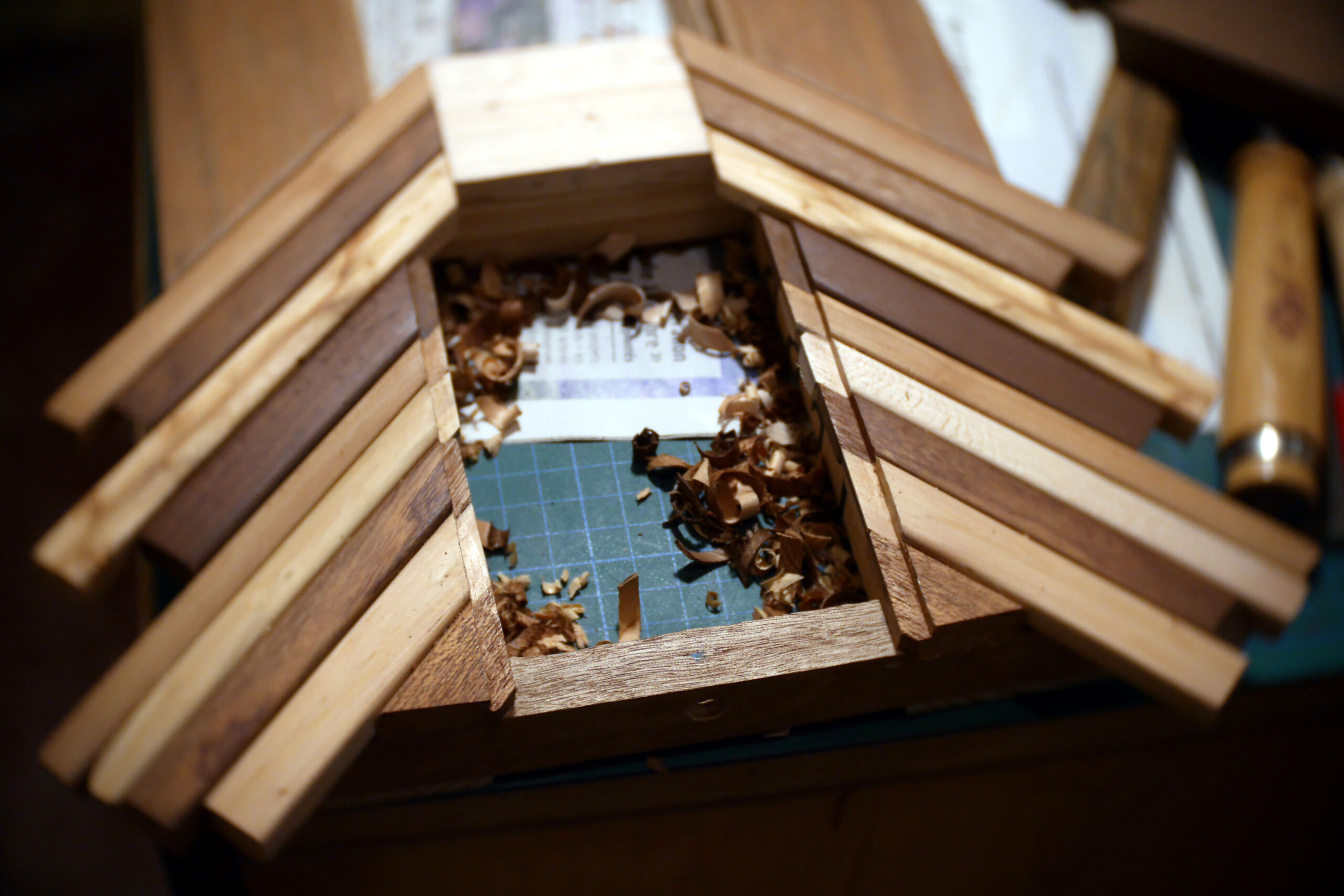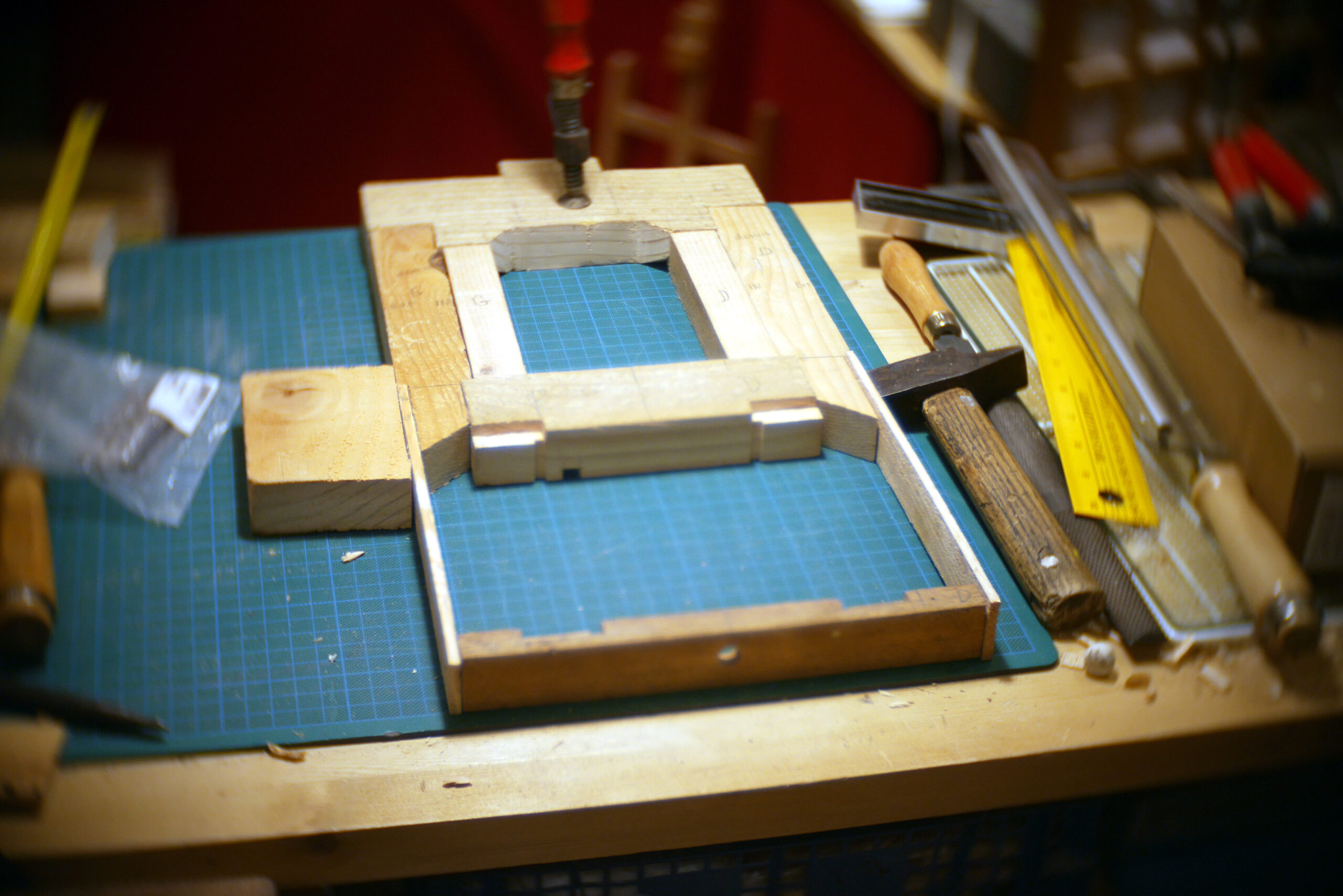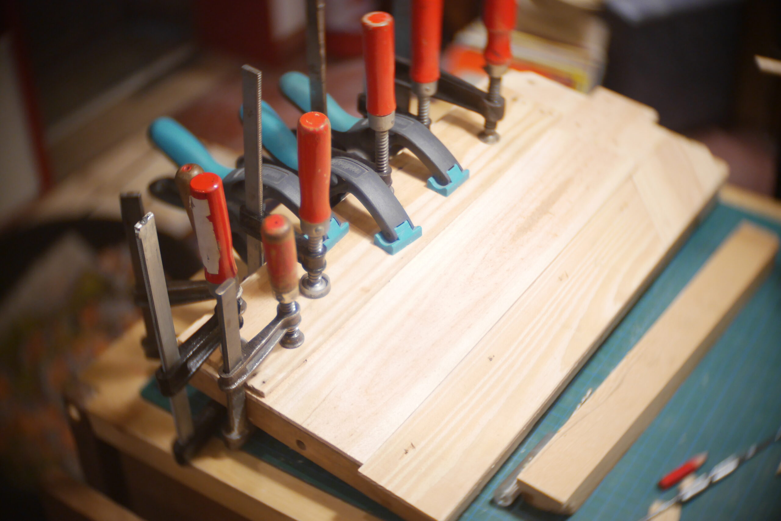 Conception en « sandwich » pour celle-ci, avec une structure centrale faite de chutes diverses, assemblées, collées, chevillées.