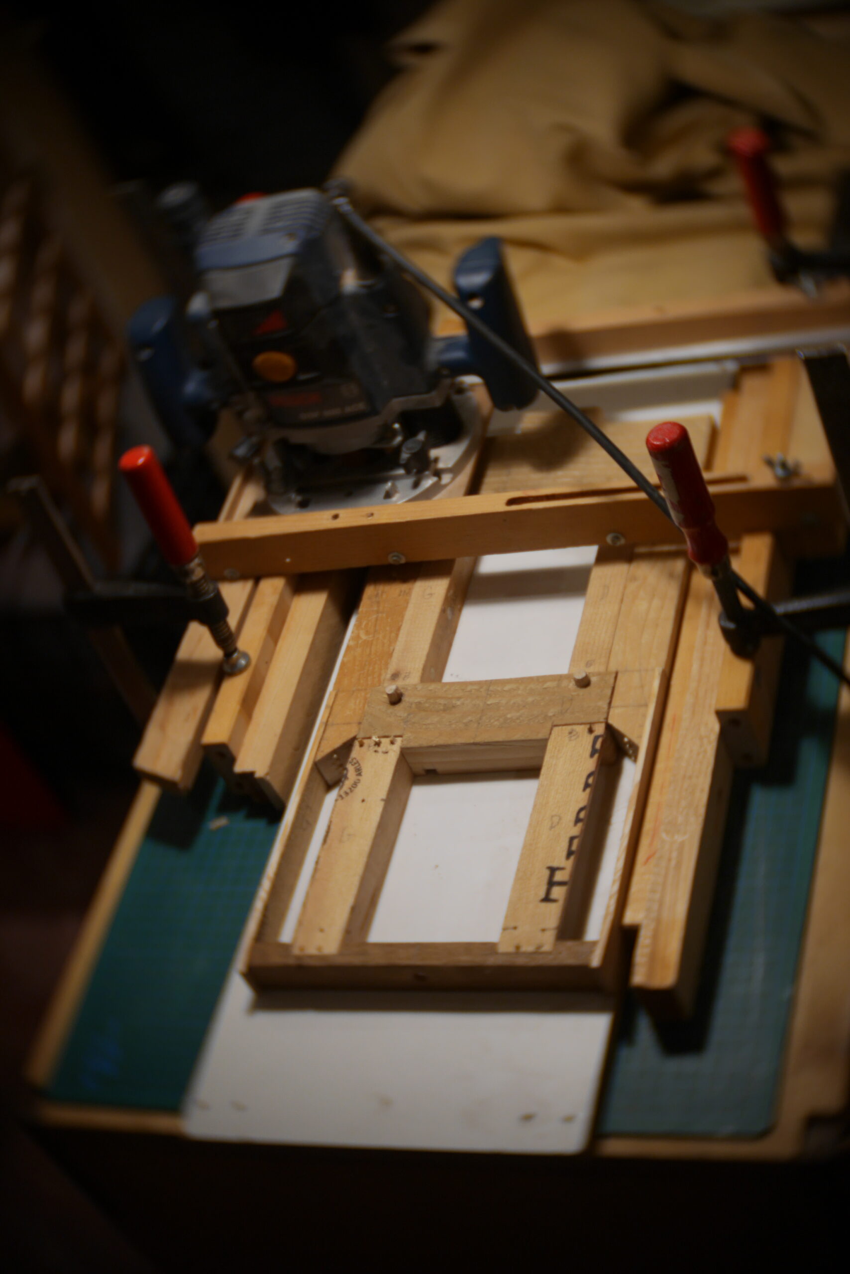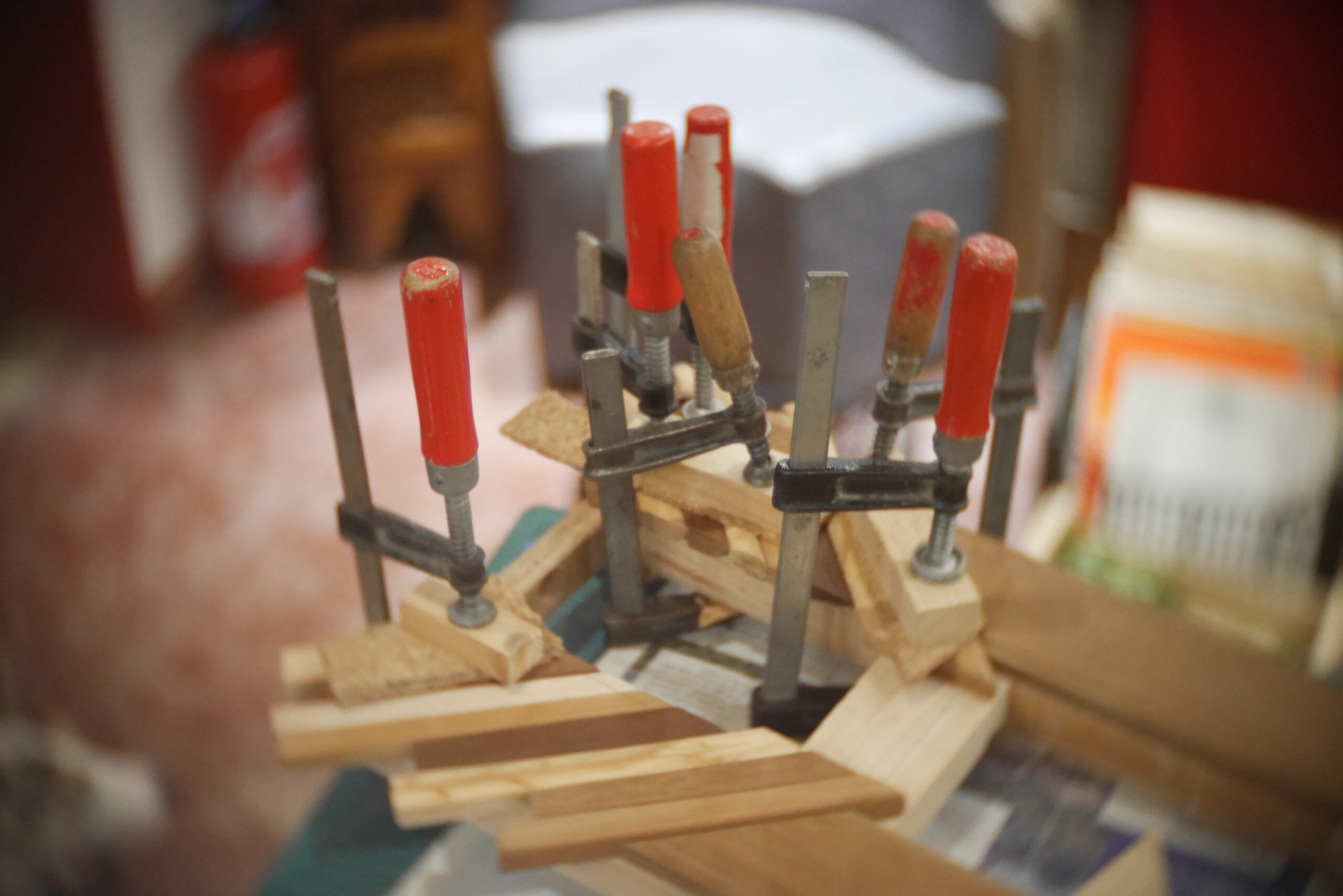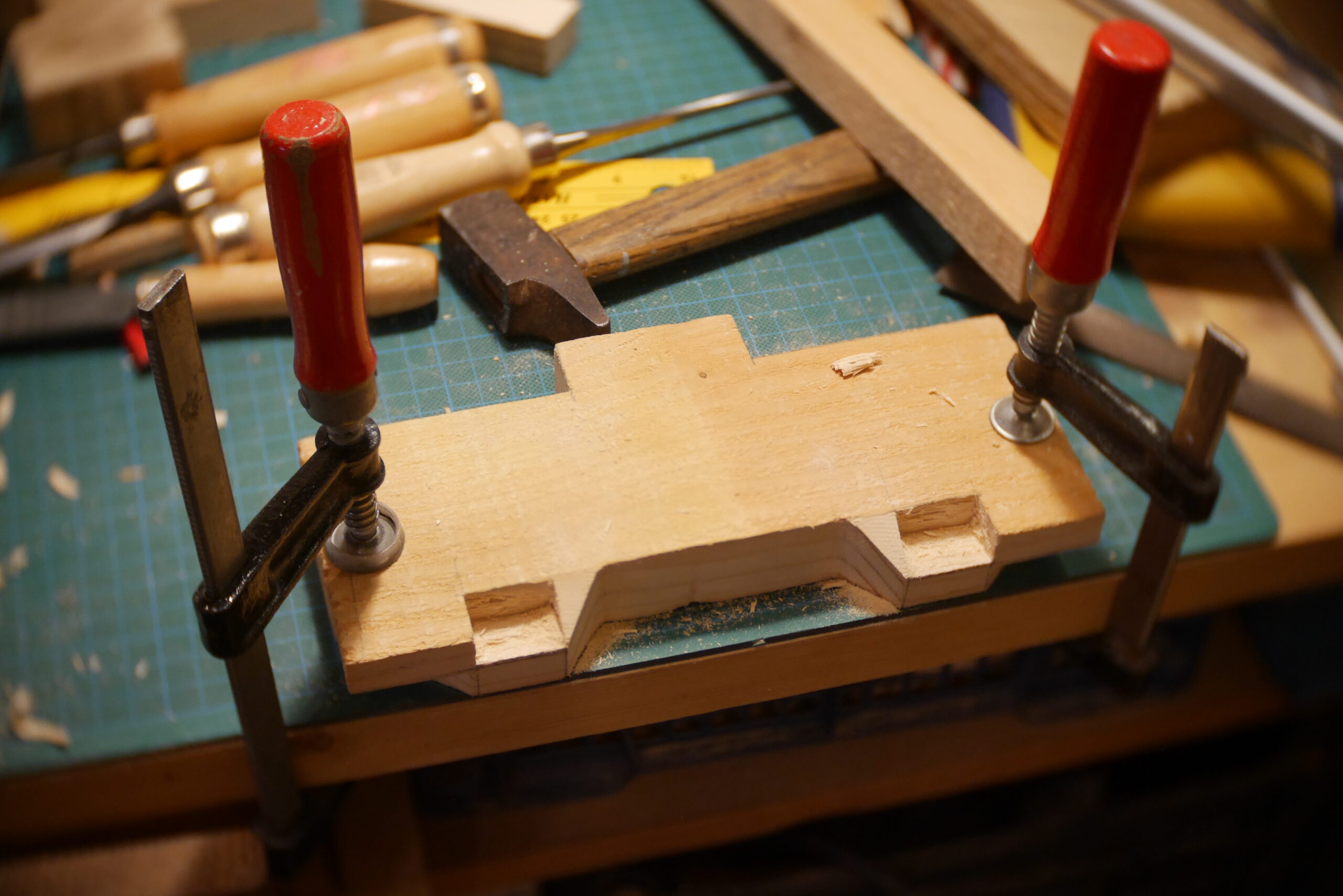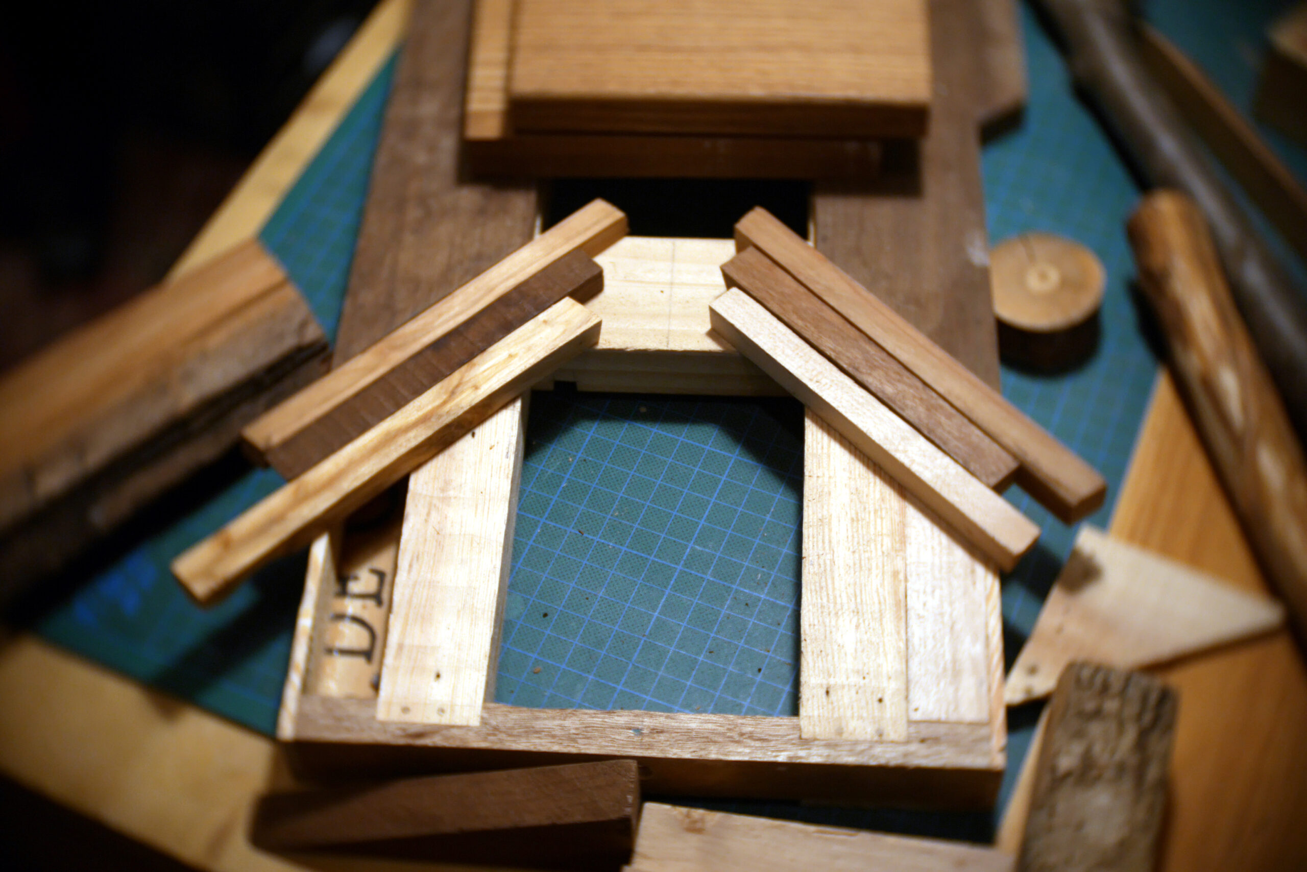 Conception en « sandwich » pour celle-ci, avec une structure centrale faite de chutes diverses, assemblées, collées, chevillées.