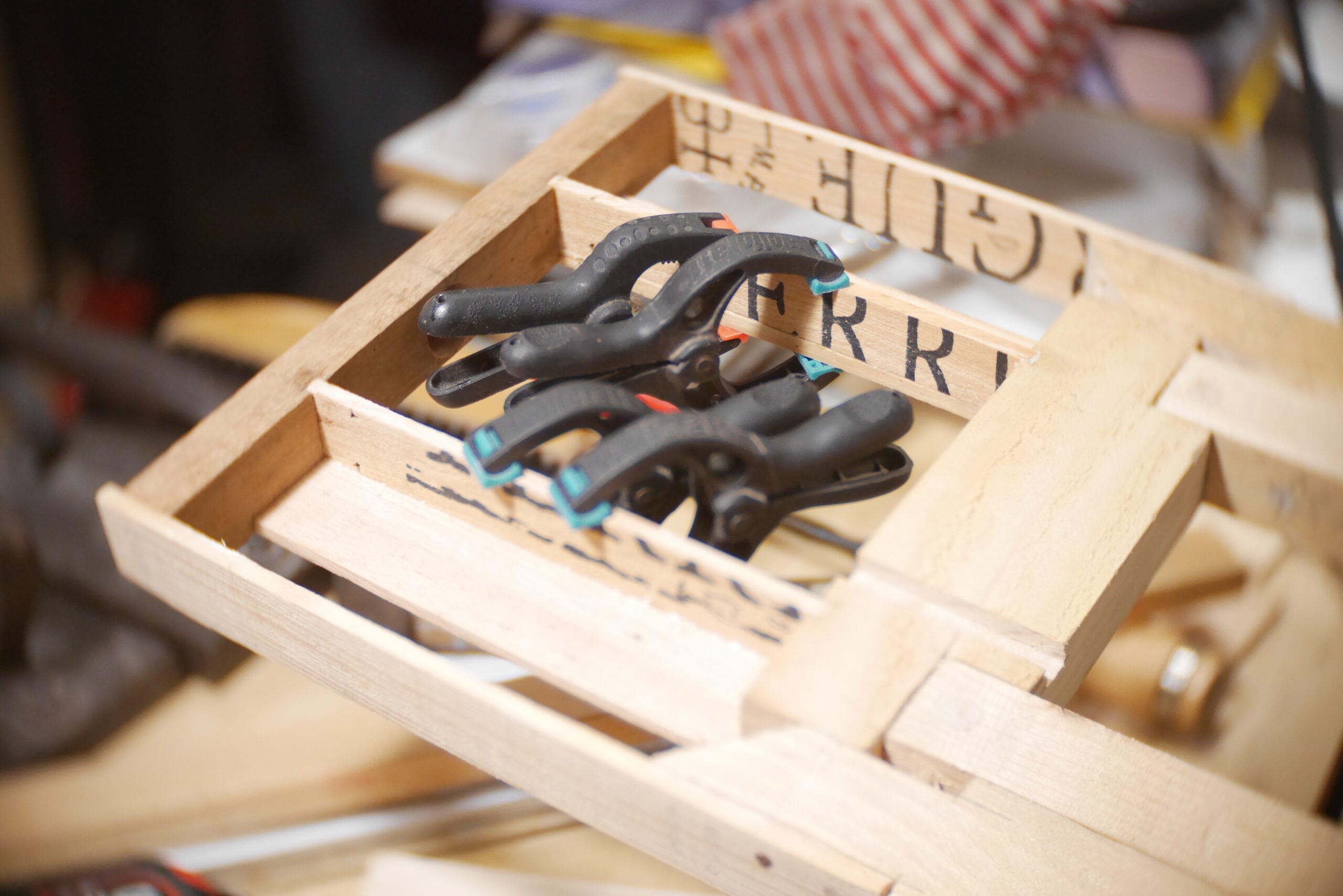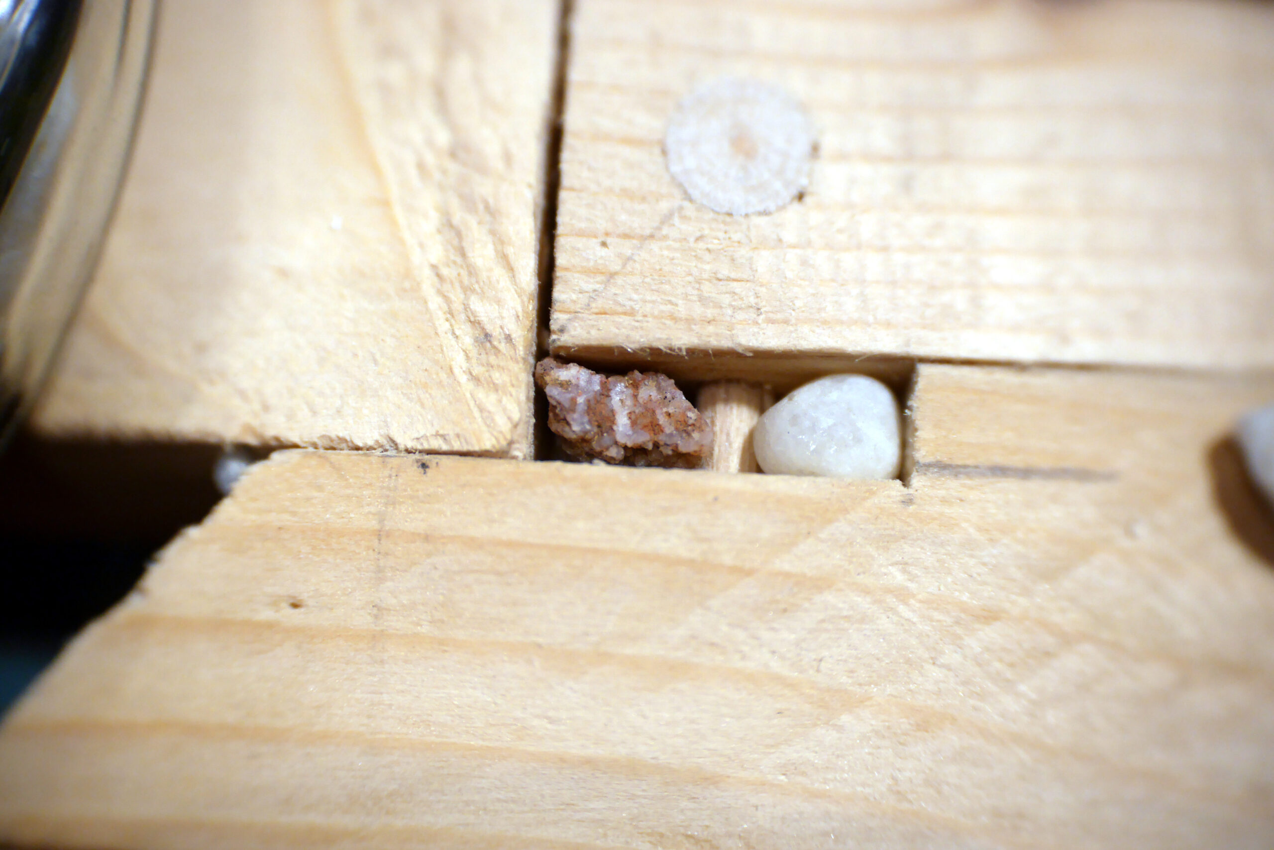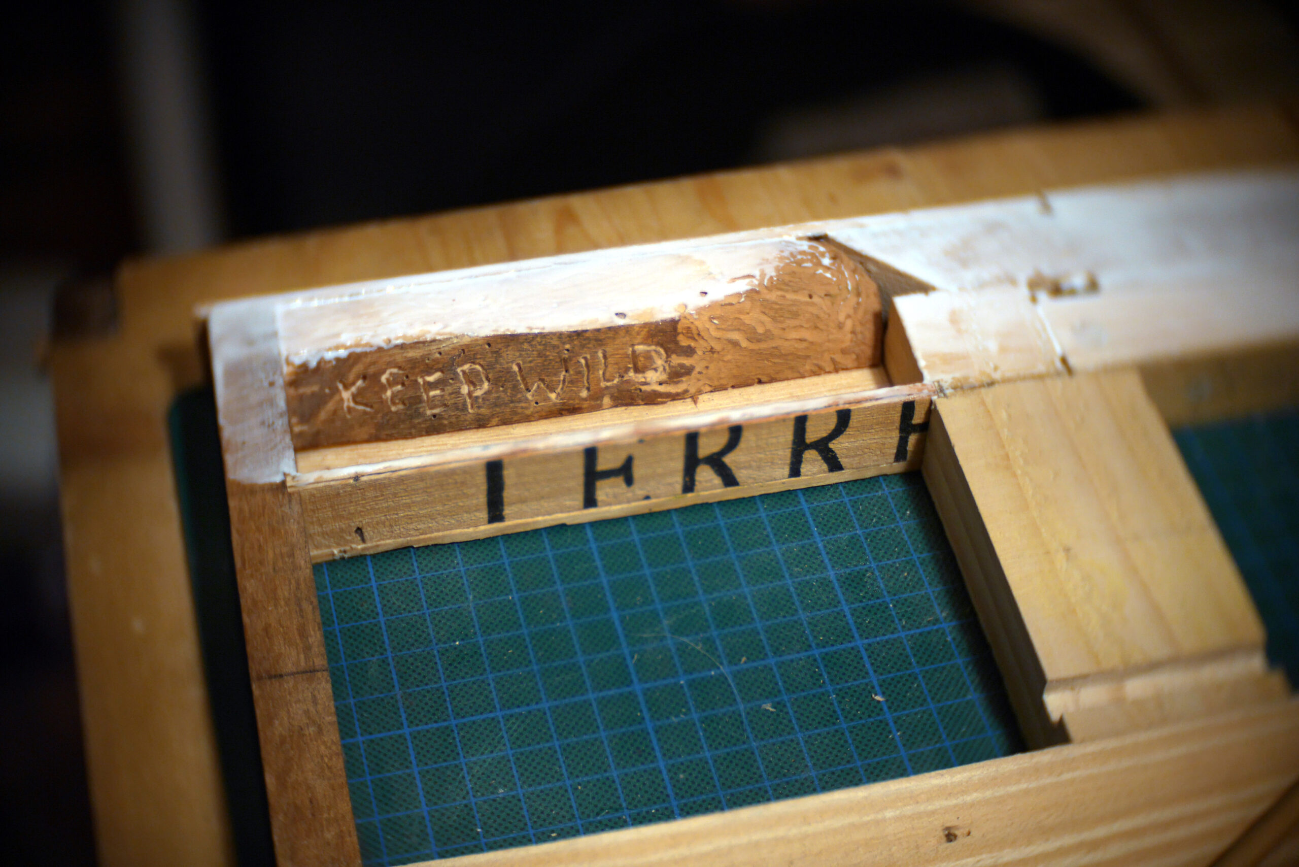 Placage du dos en bois de cagette collé, chevillé. Ajout d’un contre-poids en érable brut gravé « KEEP WILD » et de petites pierres dans les espaces disponibles; qui resteront enfouis pour toujours.