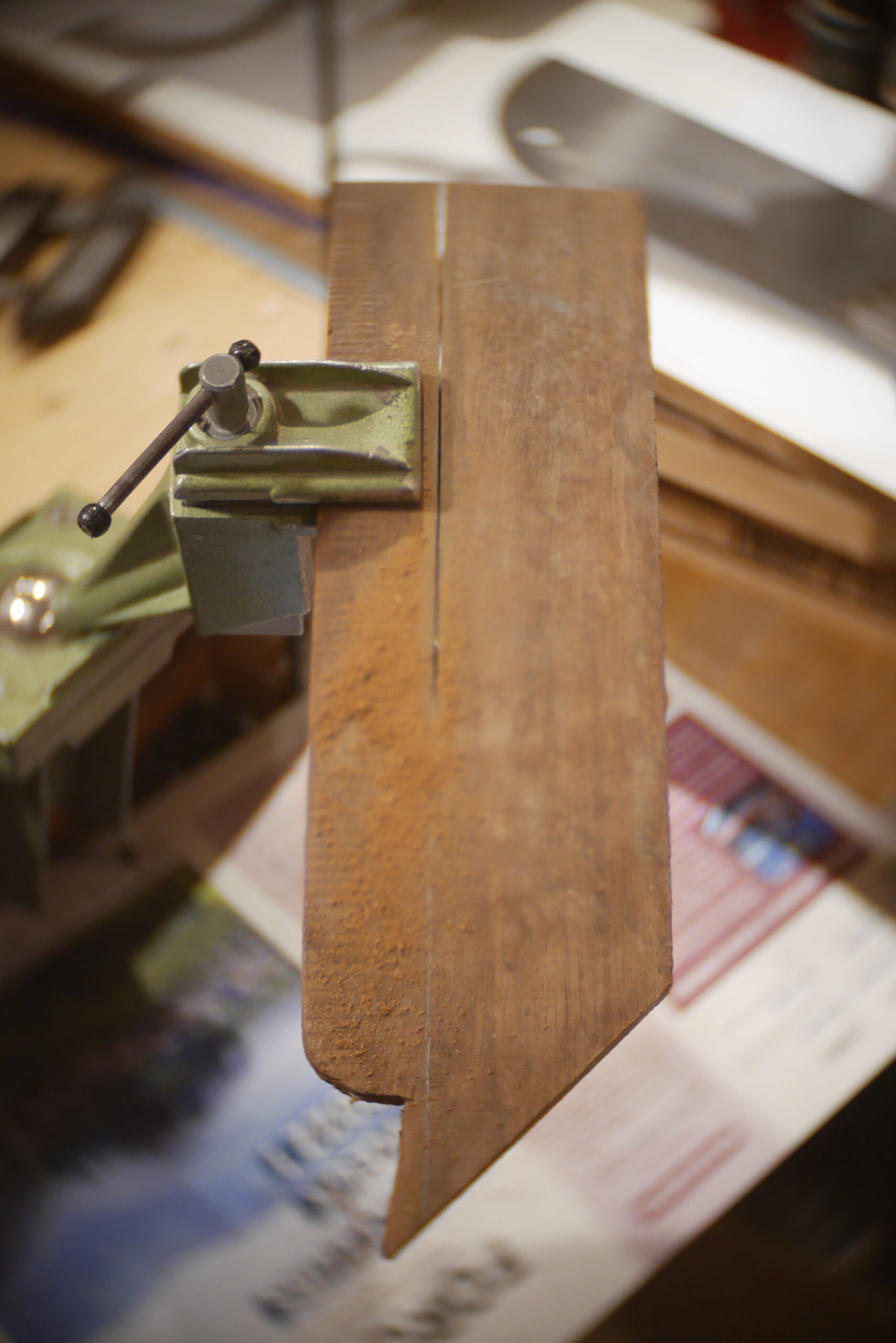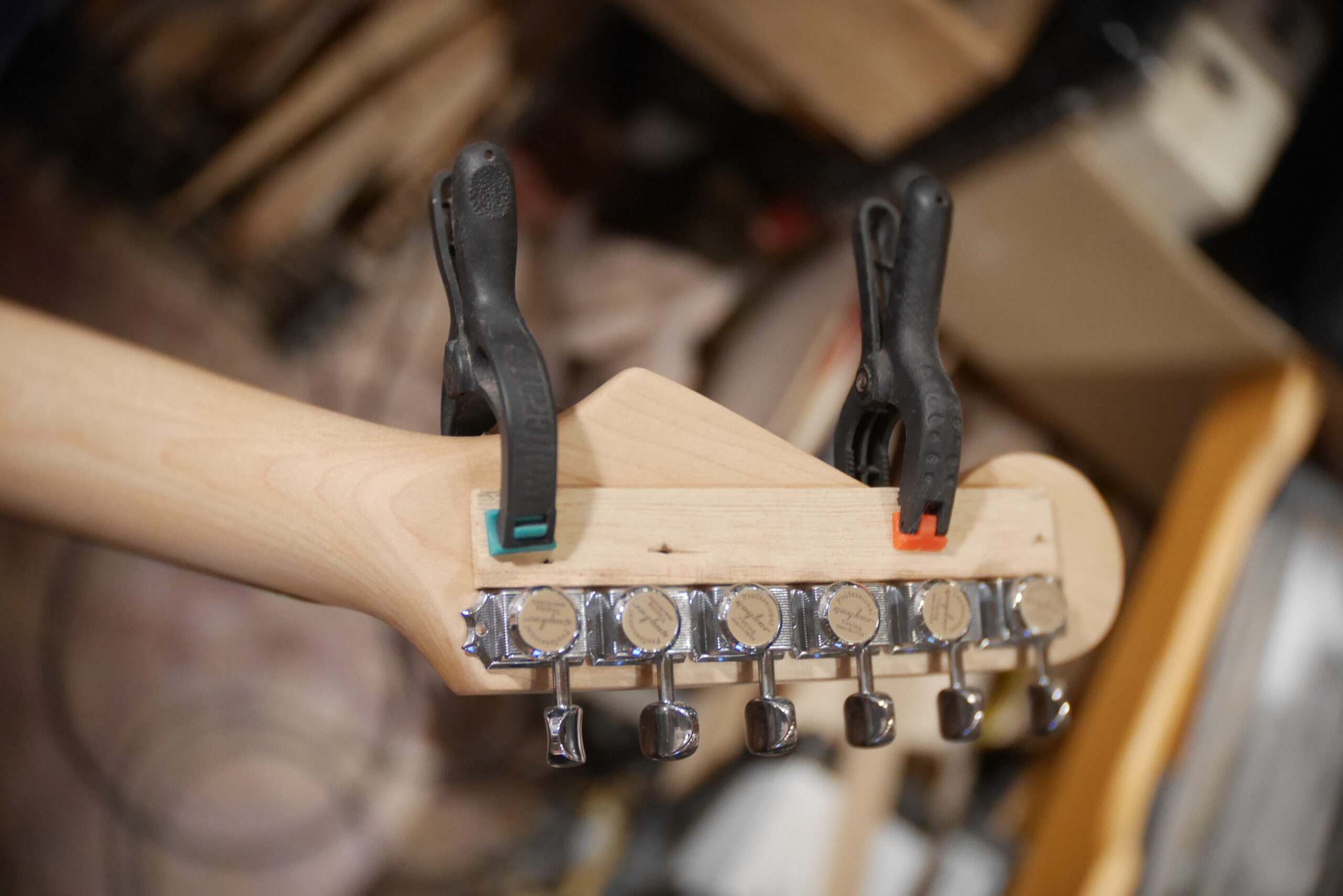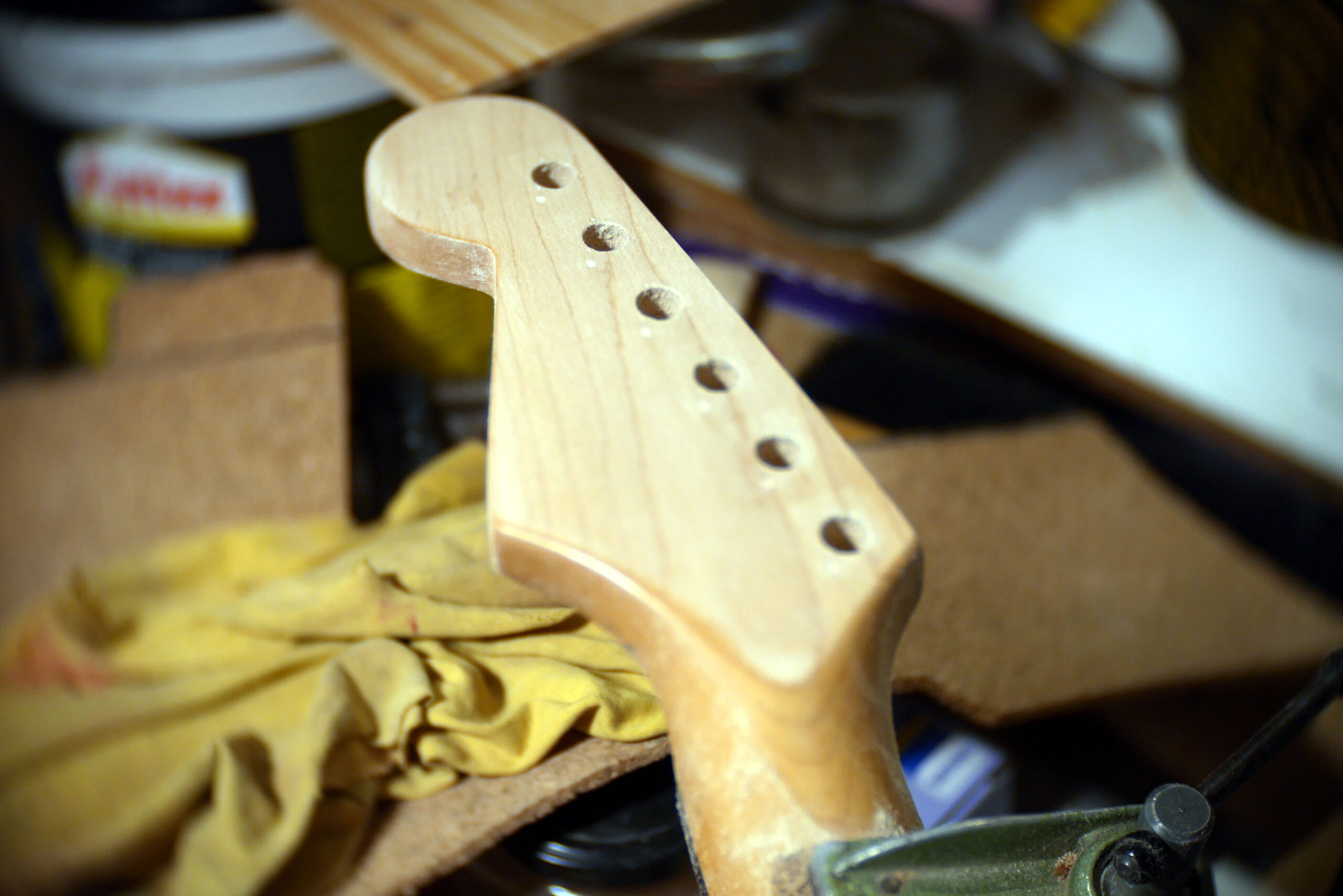 Ponçage du vieux vernis jauni du manche, cire d’abeille, guides corde, mécaniques Guyker et assemblage au corps.