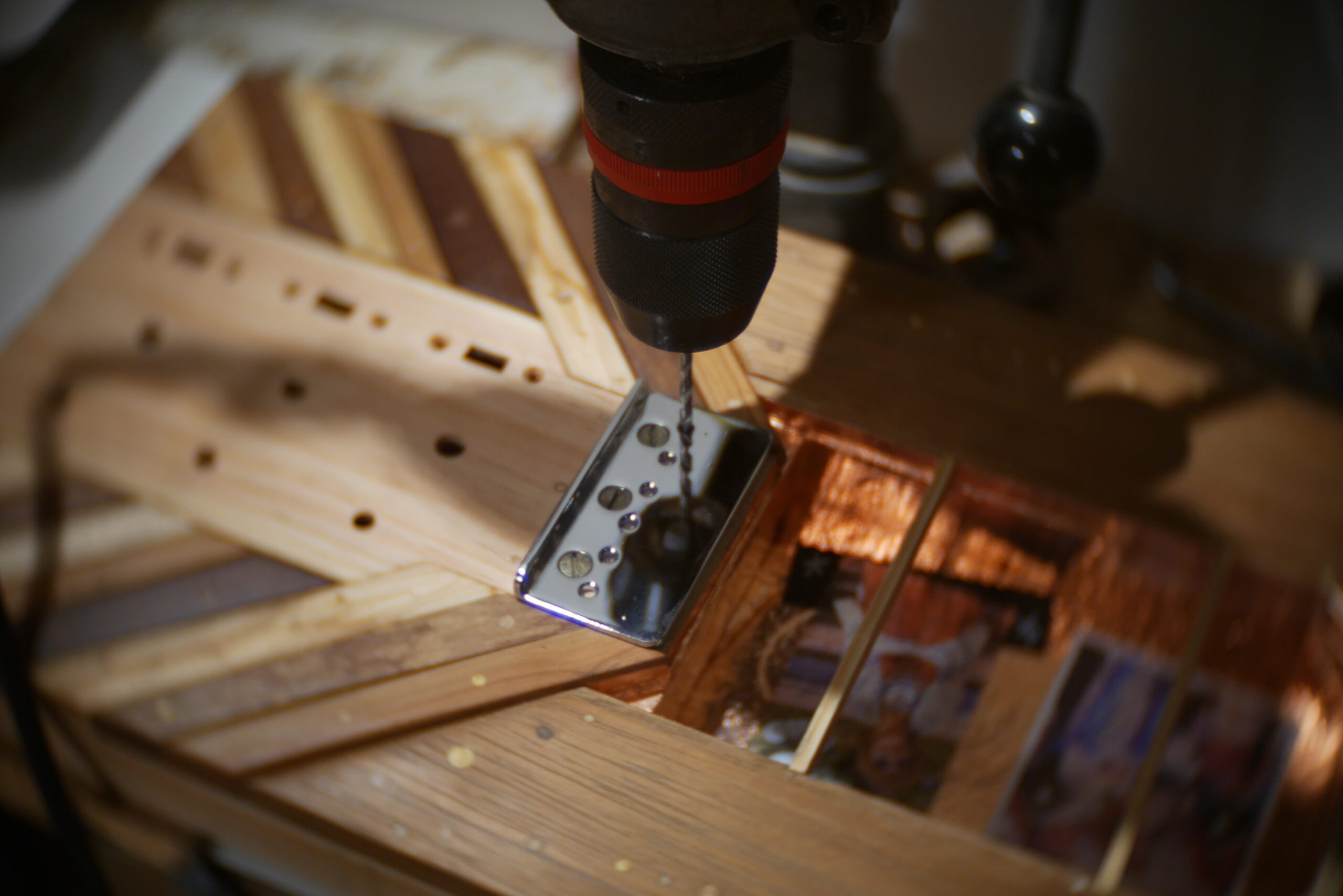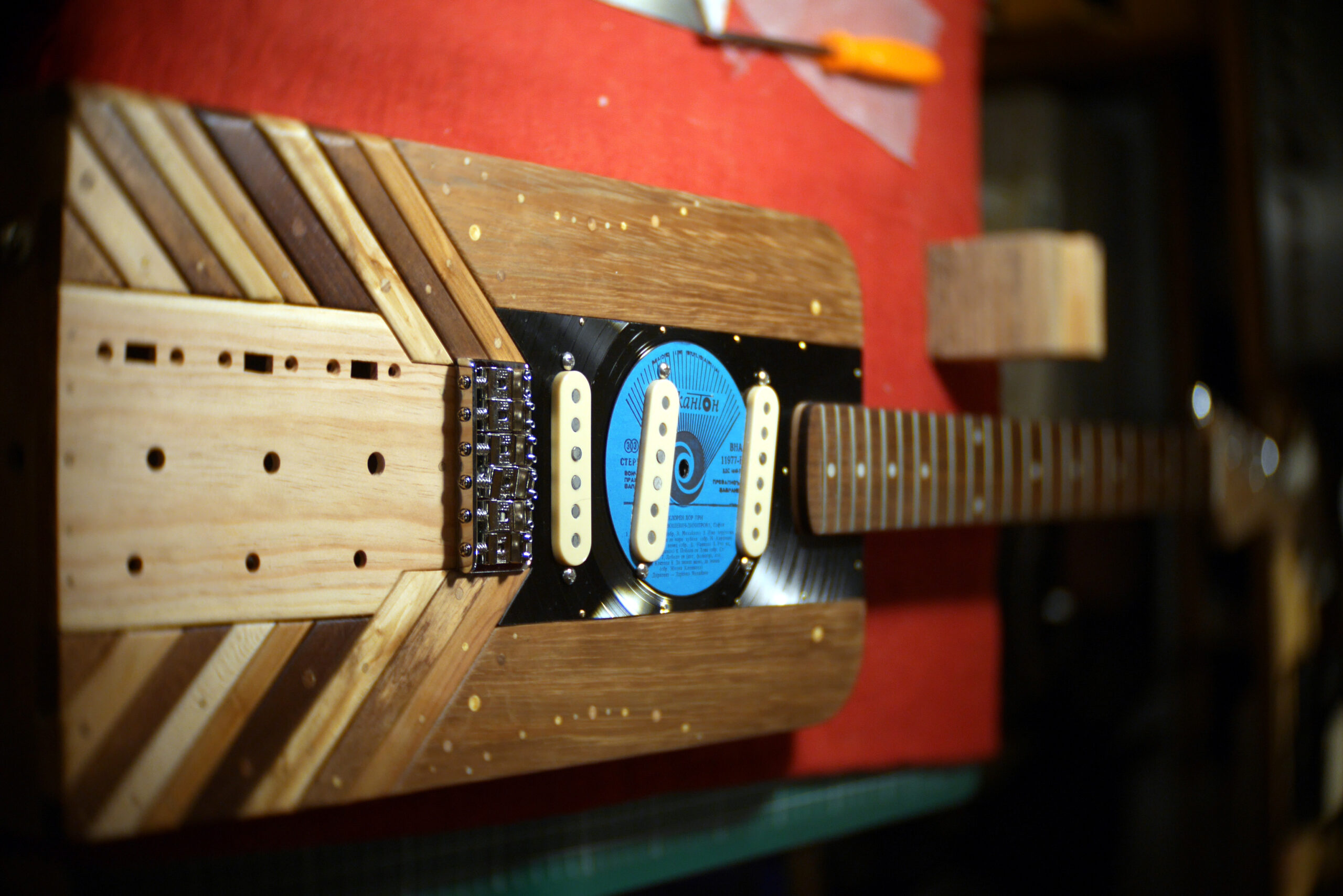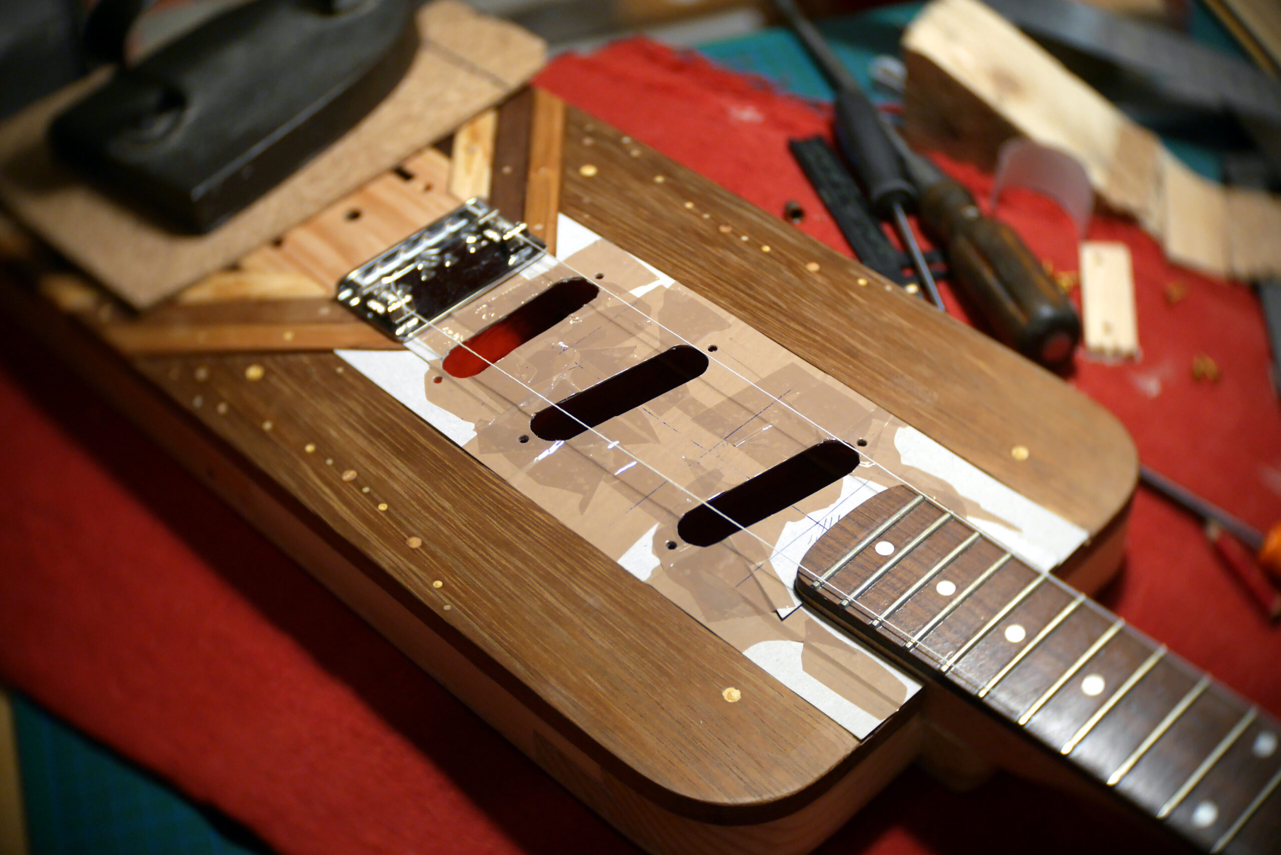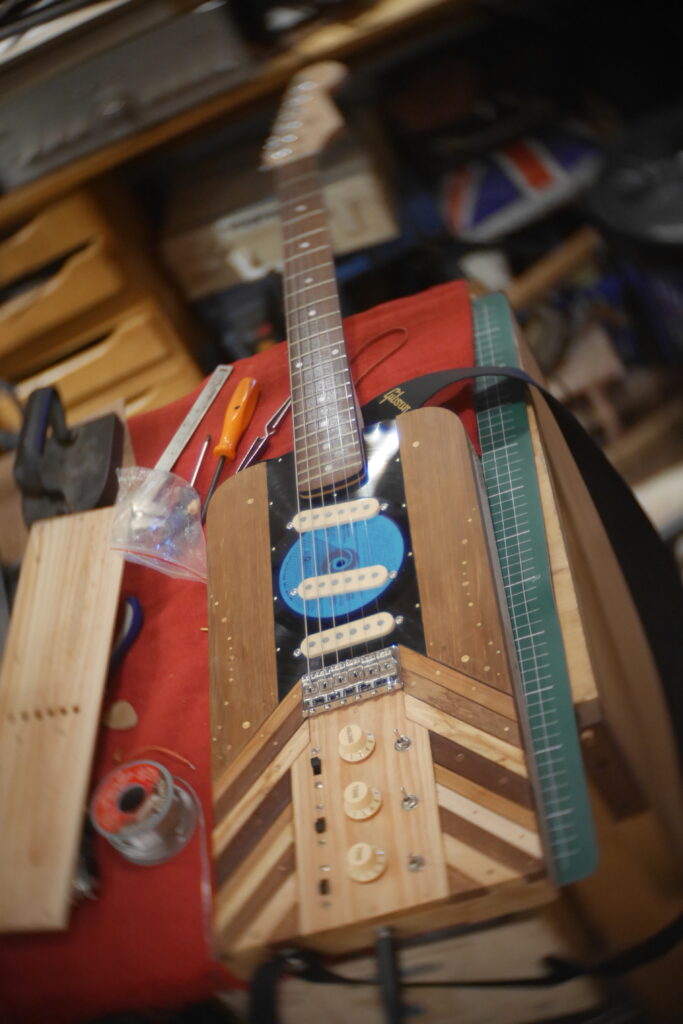 Pour finir, pose du chevalet, cordes traversantes, et confection du pickguard en vinyle d’Europe de l’Est. Pose de l’électronique, câblage, tests et divers réglages, retouches…