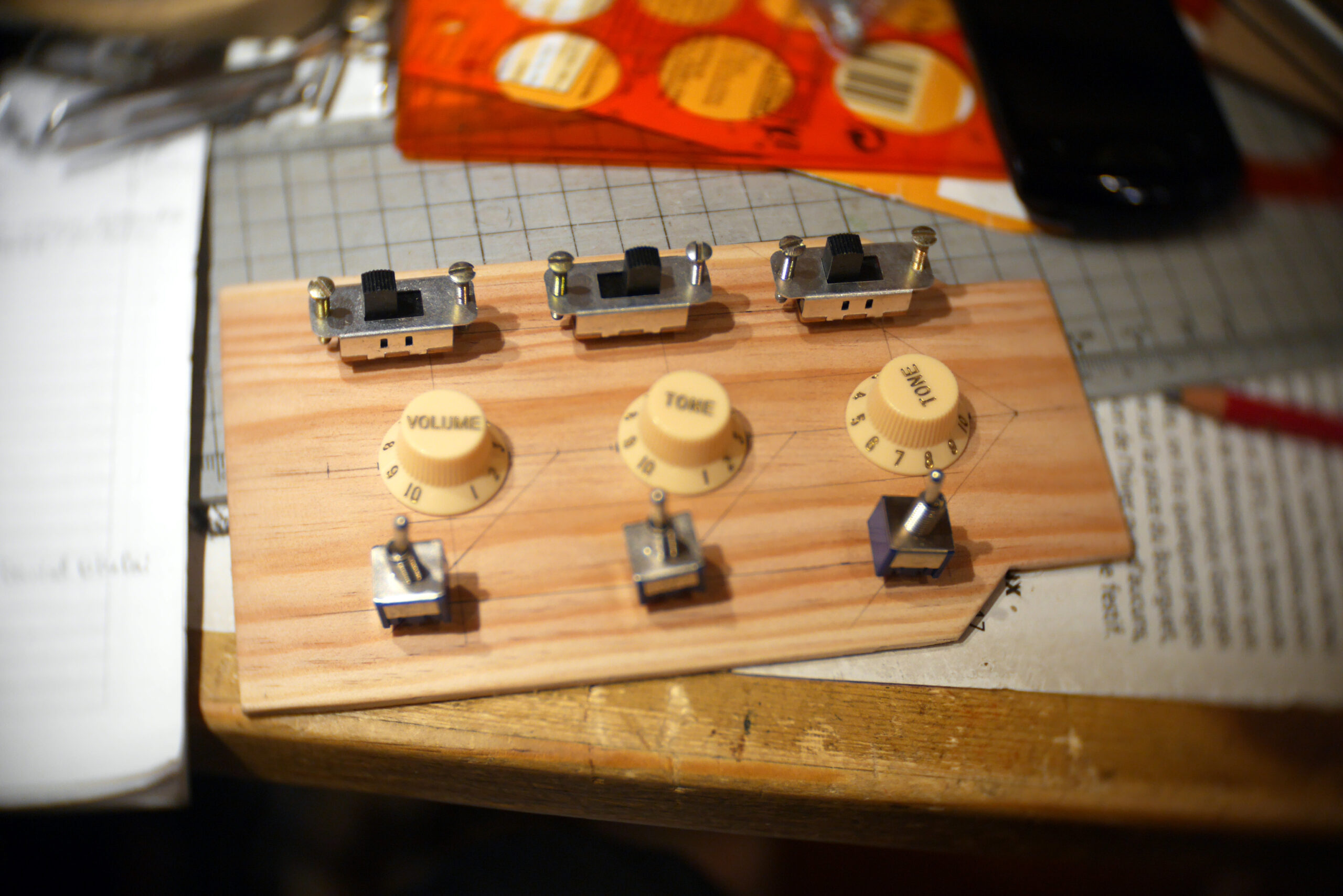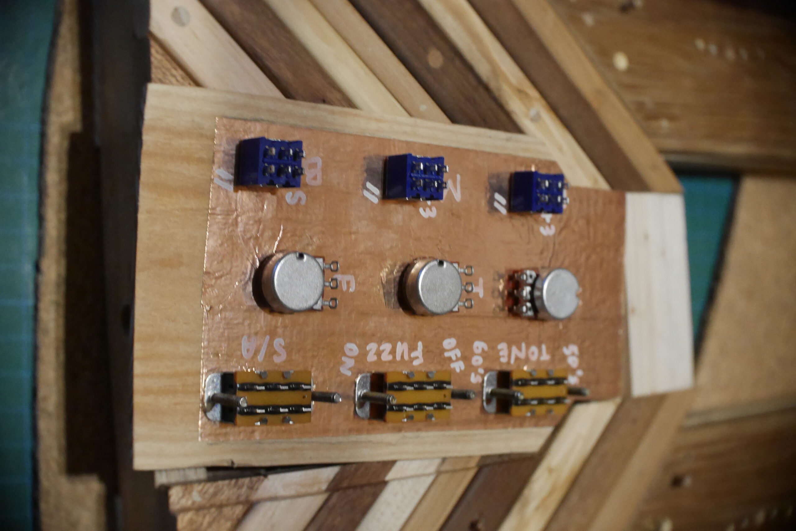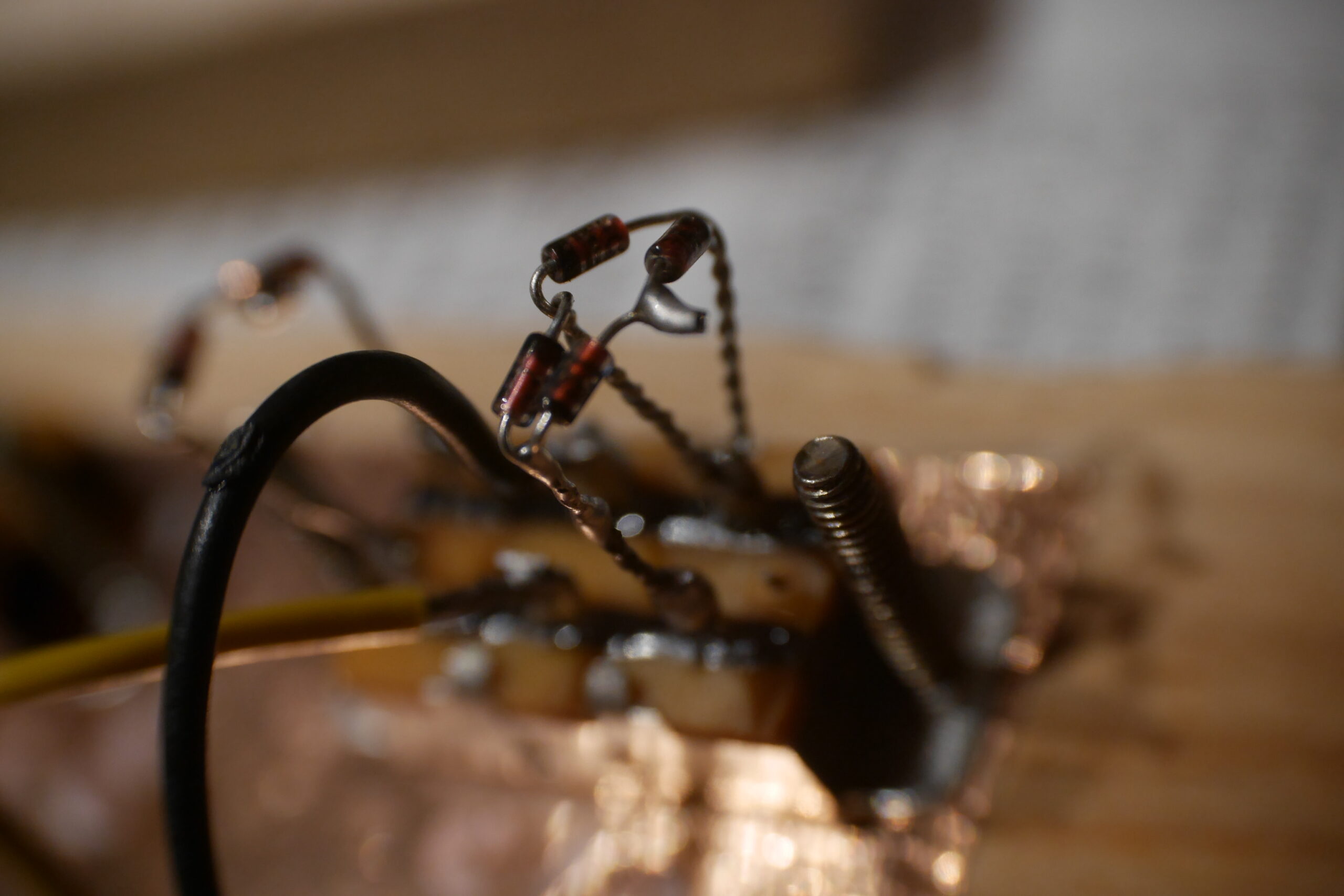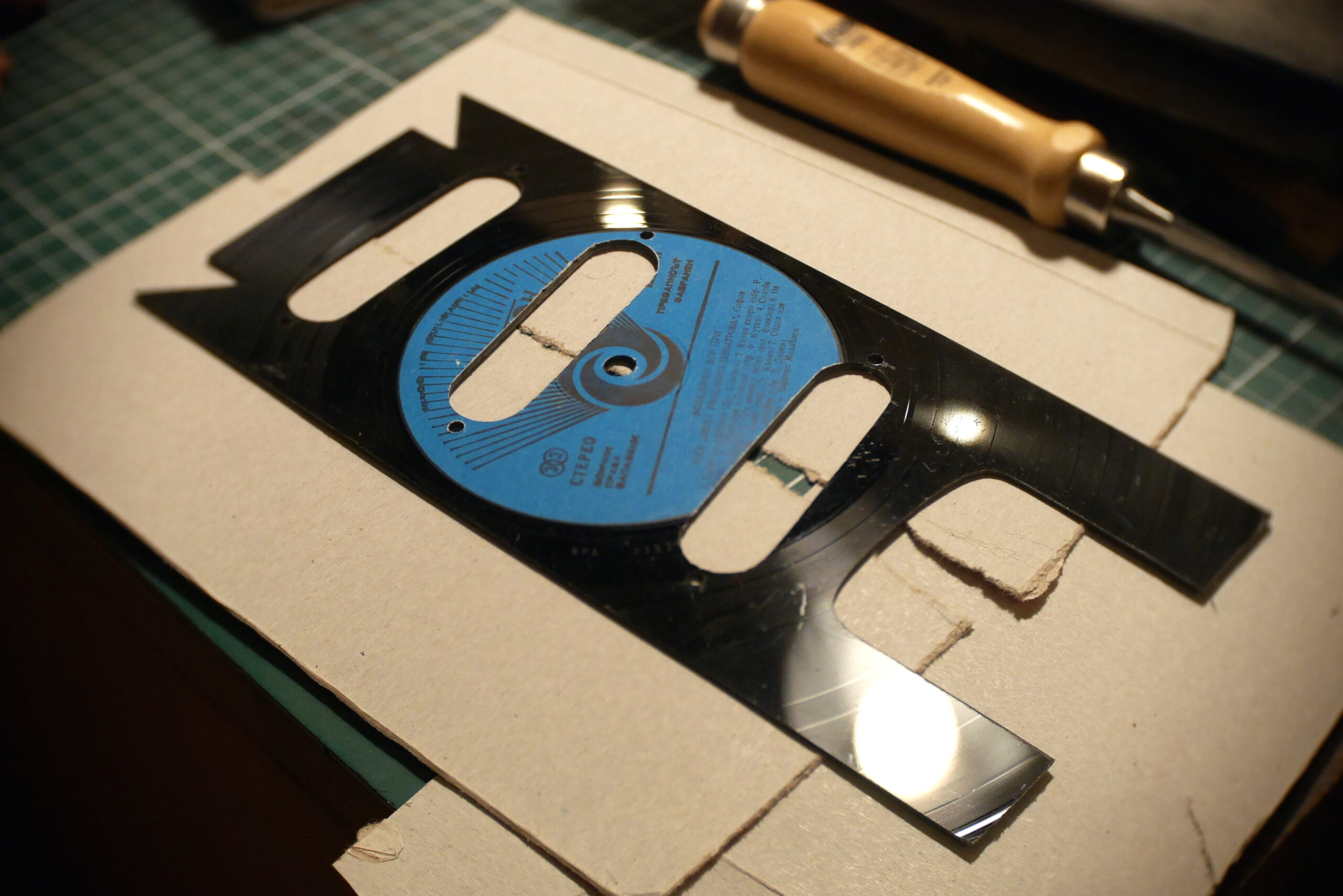 Pour finir, pose du chevalet, cordes traversantes, et confection du pickguard en vinyle d’Europe de l’Est. Pose de l’électronique, câblage, tests et divers réglages, retouches…