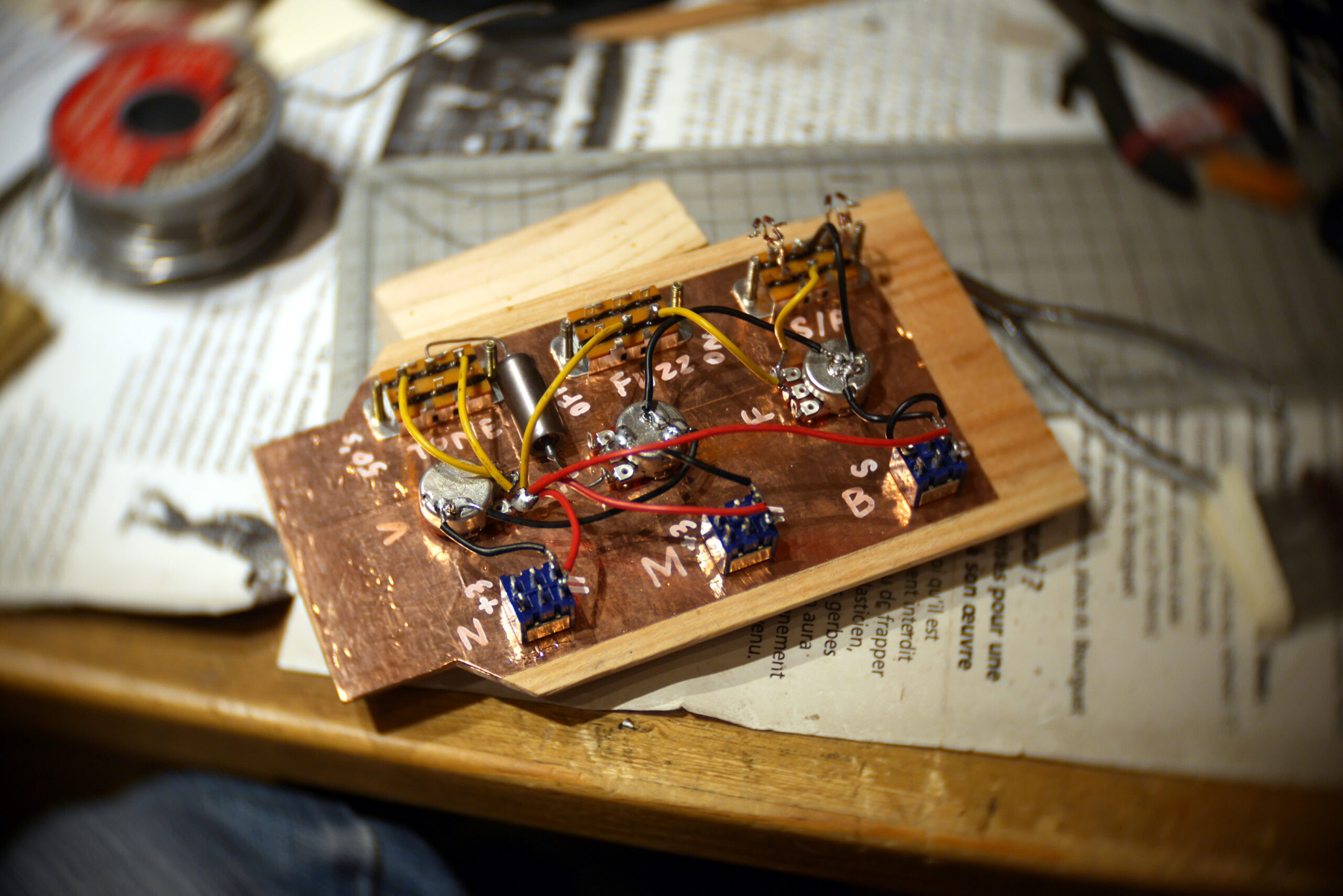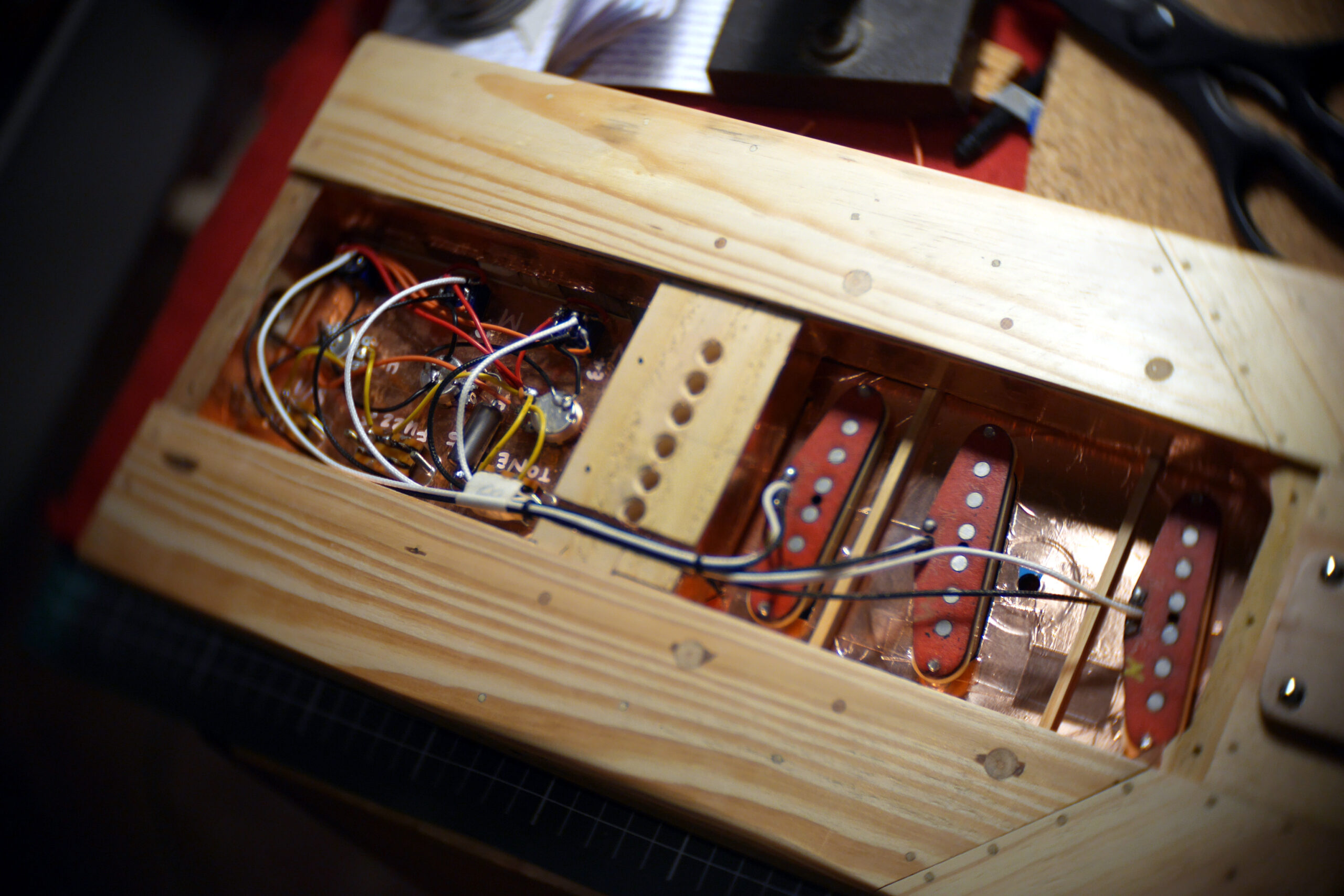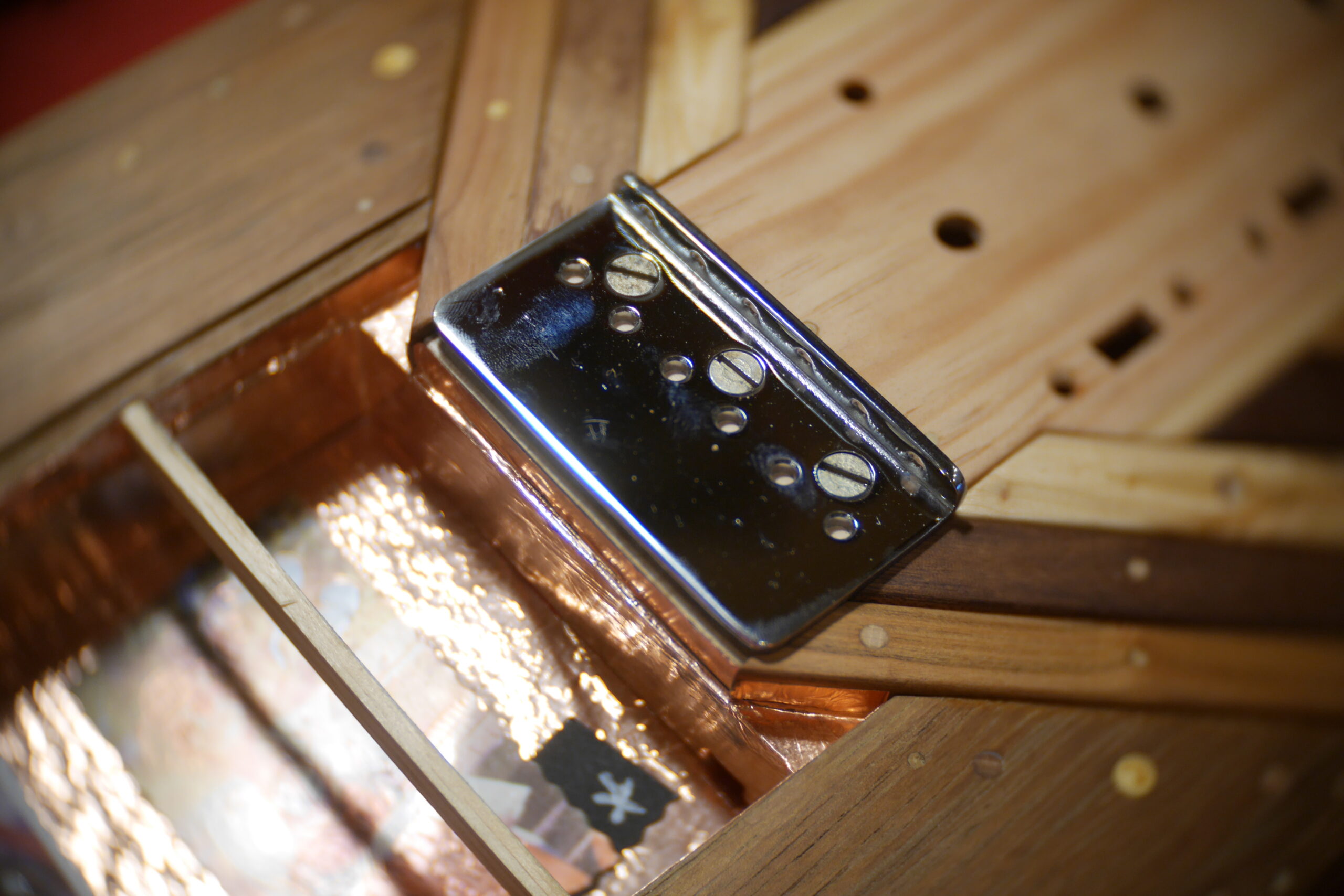Préparation d’un nid douillet pour les micros russes bobinés à la main par Alexander Pribora. Ces micros sont en ce moment introuvable sur le net, (sanctions commerciales contre la Russie oblige), et c’est bien dommage parce qu’ils sonnent magnifiquement. Les parois de la cavité sont recouvertes de feuilles de cuivre pour réduire les bruits parasites. Les étiquettes sont crées et collées sur le capot d’accès au dos.