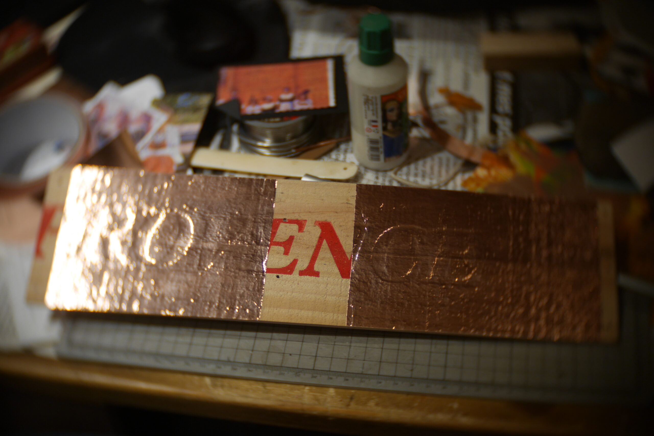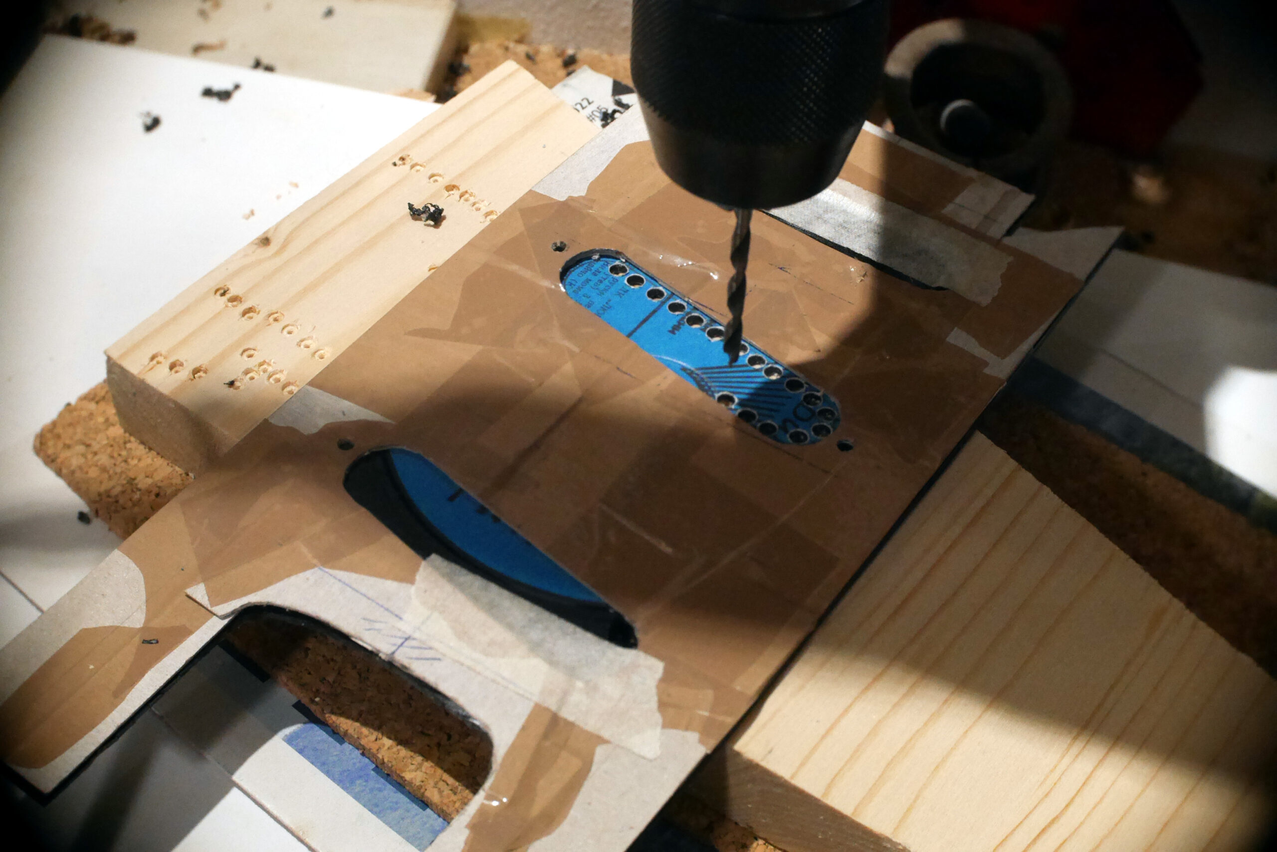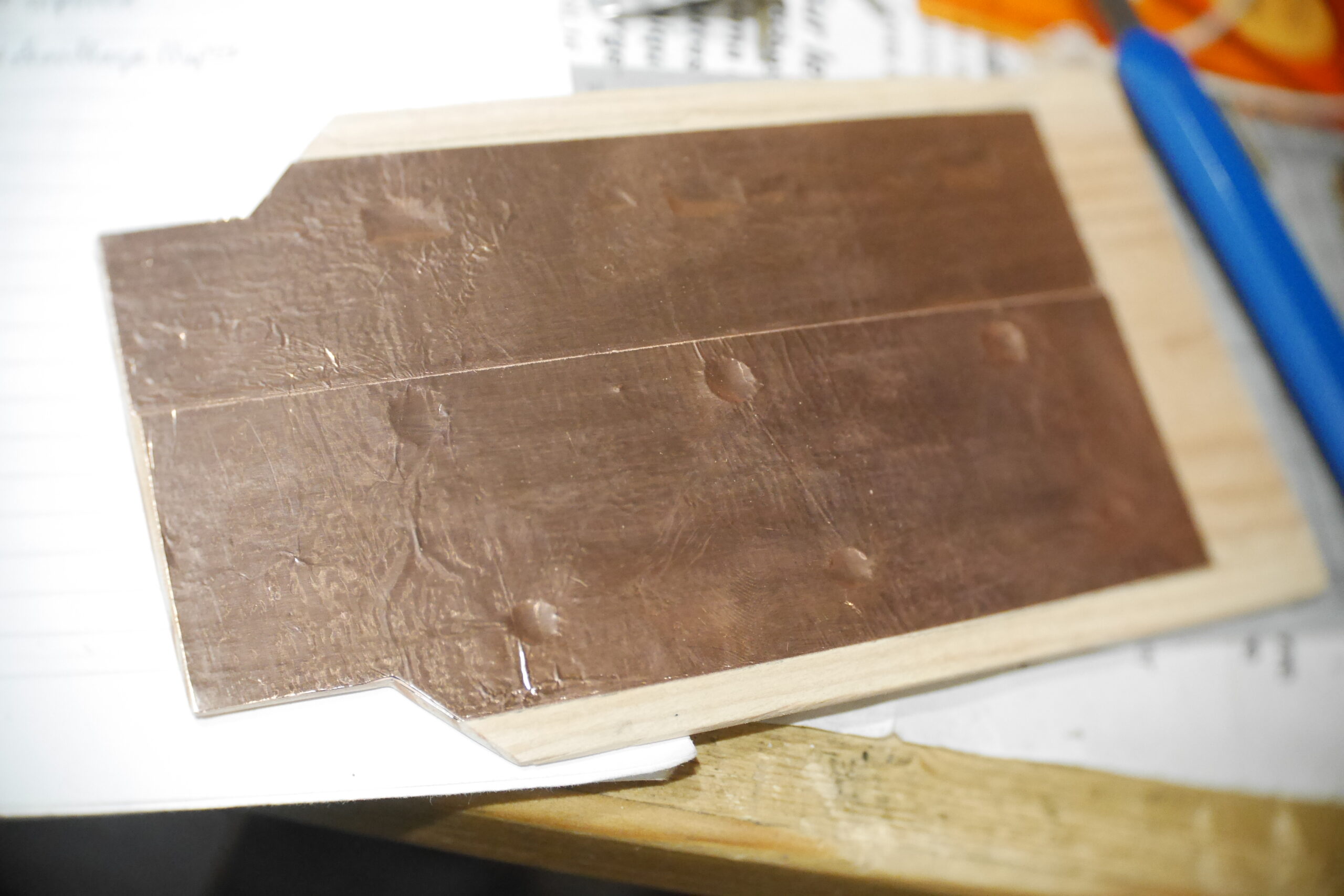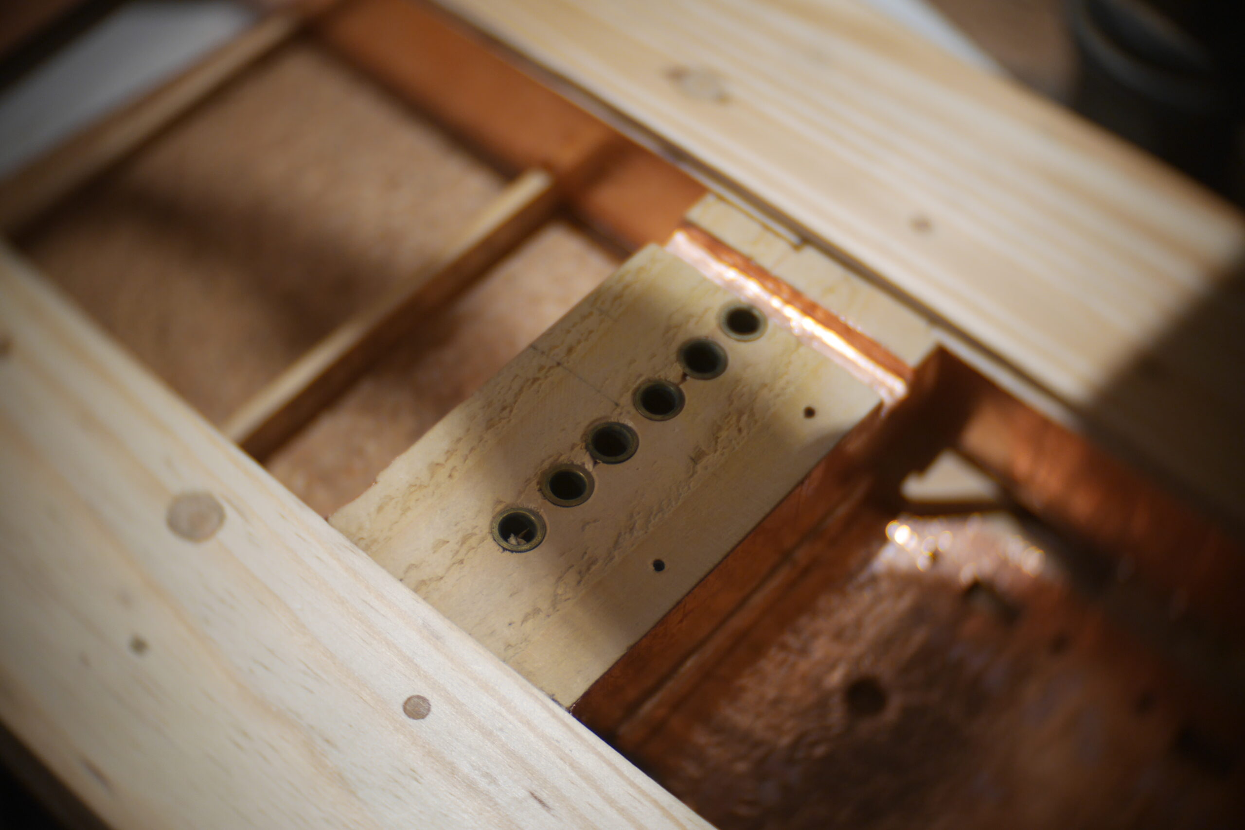 Préparation d’un nid douillet pour les micros russes bobinés à la main par Alexander Pribora. Ces micros sont en ce moment introuvable sur le net, (sanctions commerciales contre la Russie oblige), et c’est bien dommage parce qu’ils sonnent magnifiquement. Les parois de la cavité sont recouvertes de feuilles de cuivre pour réduire les bruits parasites. Les étiquettes sont crées et collées sur le capot d’accès au dos.