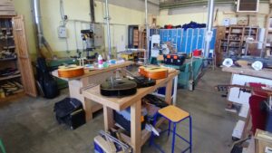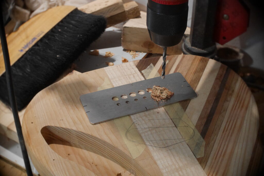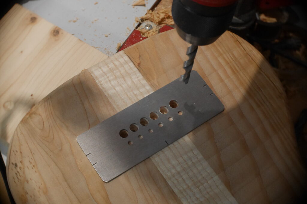 Pose du chevalet, trous pour cordes traversantes et ferrules, défonce de la cavité micro.
