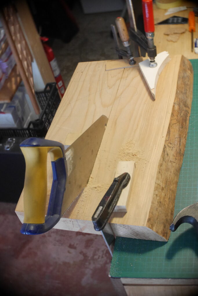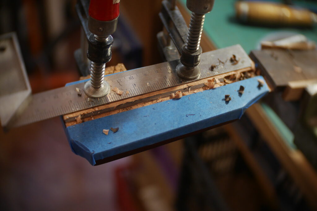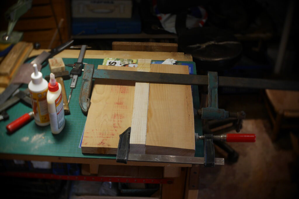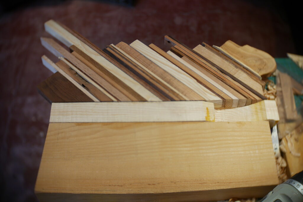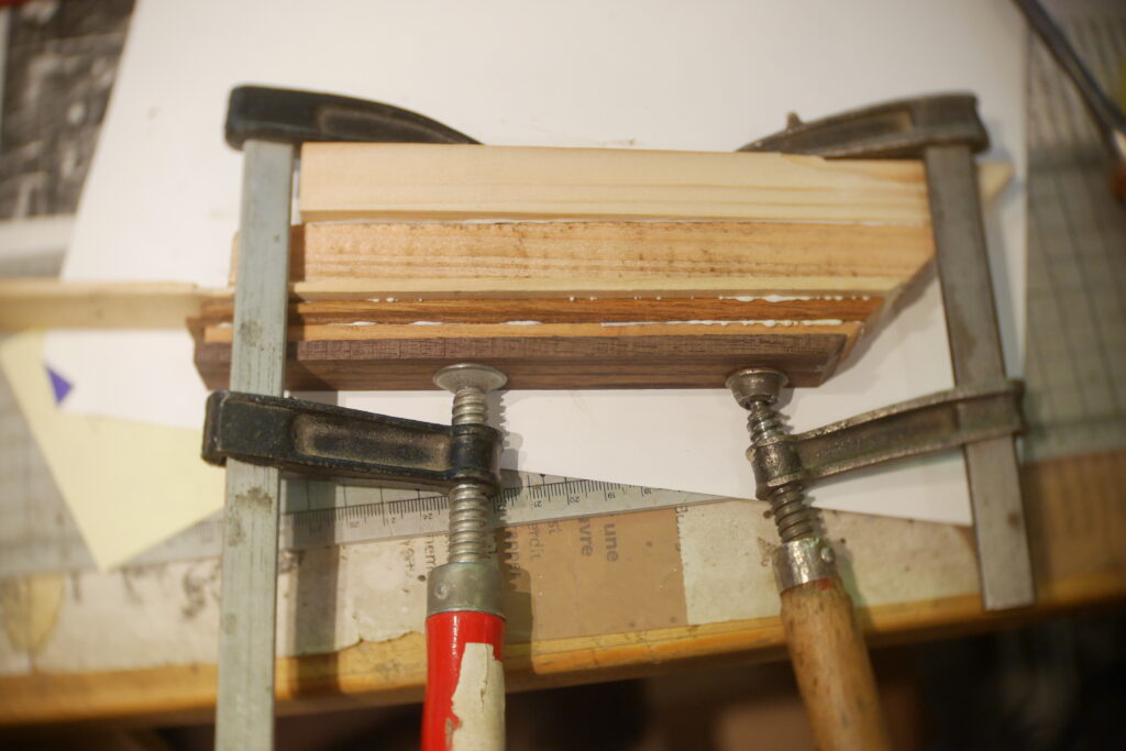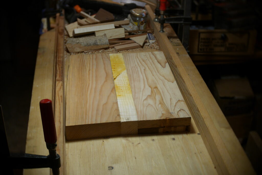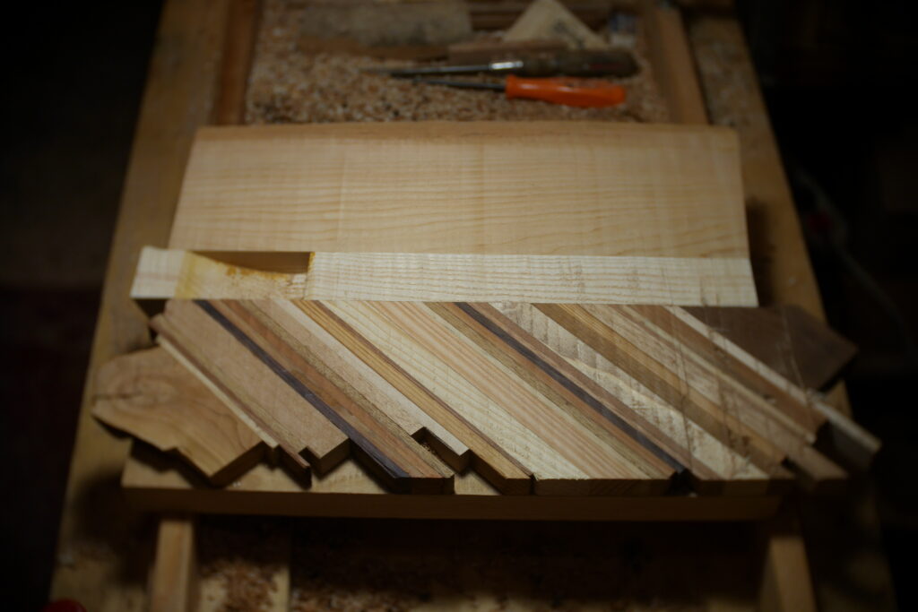 Pour celle-ci, j’avais en stock un morceau de cèdre un peu trop étroit, que j’ai coupé en deux pour y glisser entre, une chute de frêne ondé issus de la TLCSTR#2. Sur la moitié haute, j’ai encore enlevé 1 gros centimètre dans l’épaisseur, pour laisser la place à diverses chutes de bois de former une marqueterie inclinée à 45°.