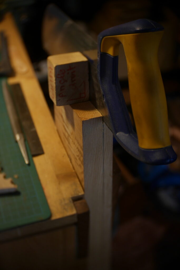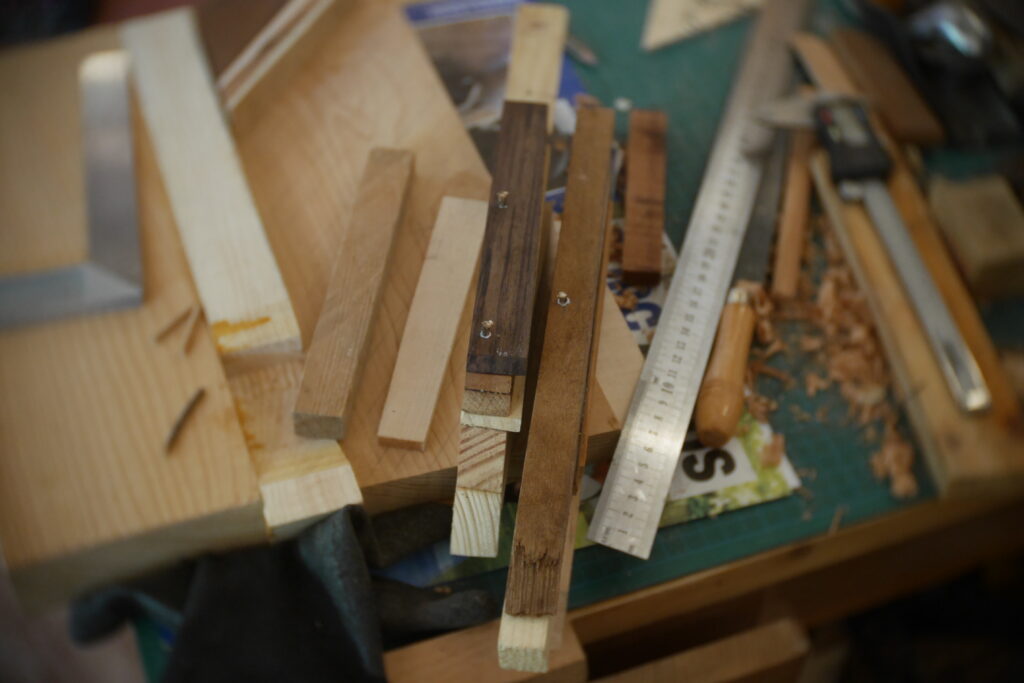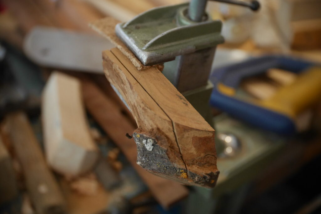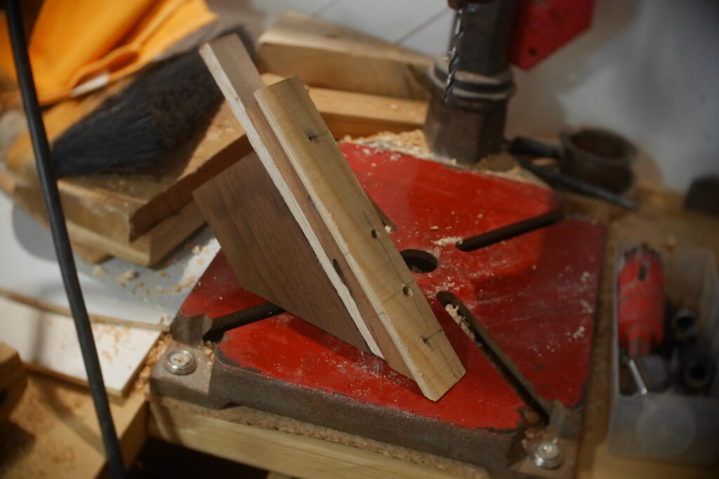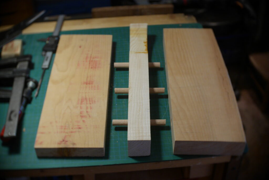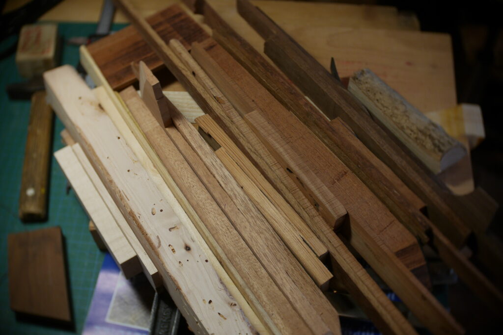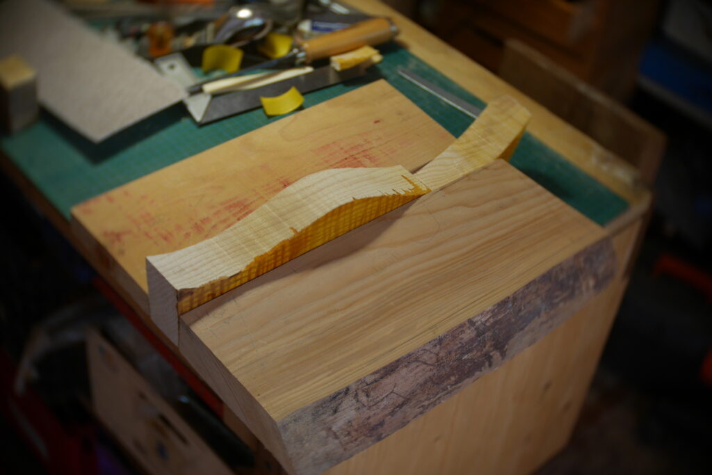Pour celle-ci, j’avais en stock un morceau de cèdre un peu trop étroit, que j’ai coupé en deux pour y glisser entre, une chute de frêne ondé issus de la TLCSTR#2. Sur la moitié haute, j’ai encore enlevé 1 gros centimètre dans l’épaisseur, pour laisser la place à diverses chutes de bois de former une marqueterie inclinée à 45°.