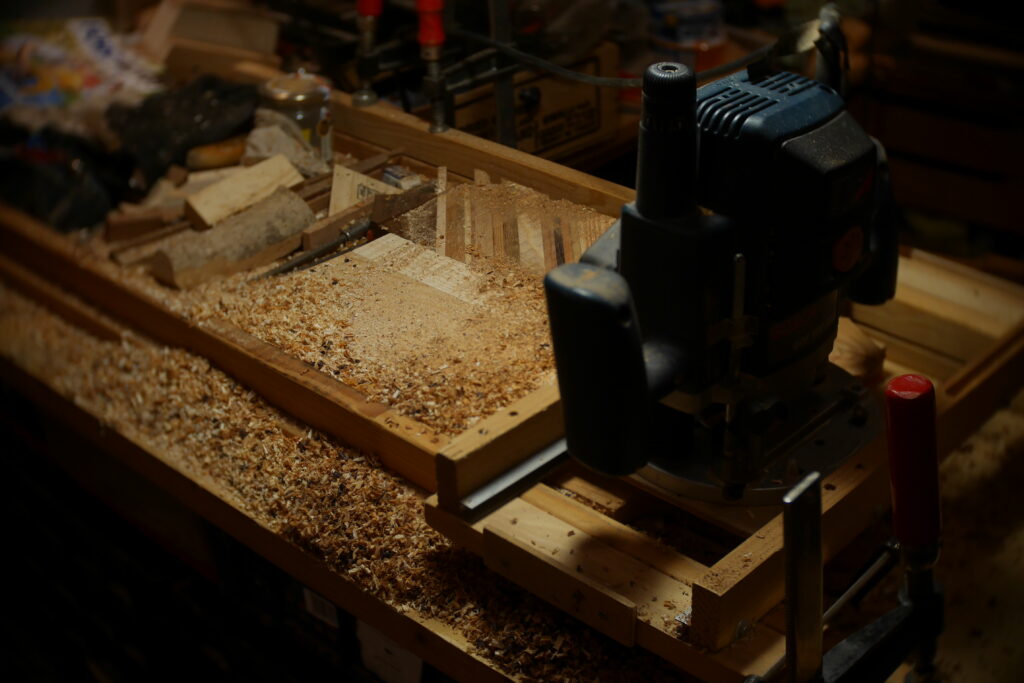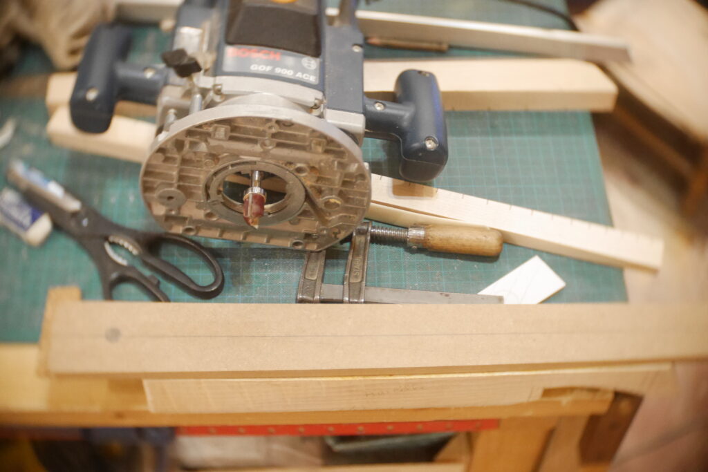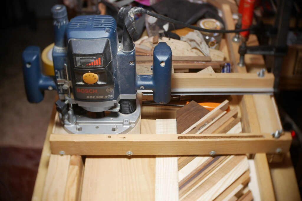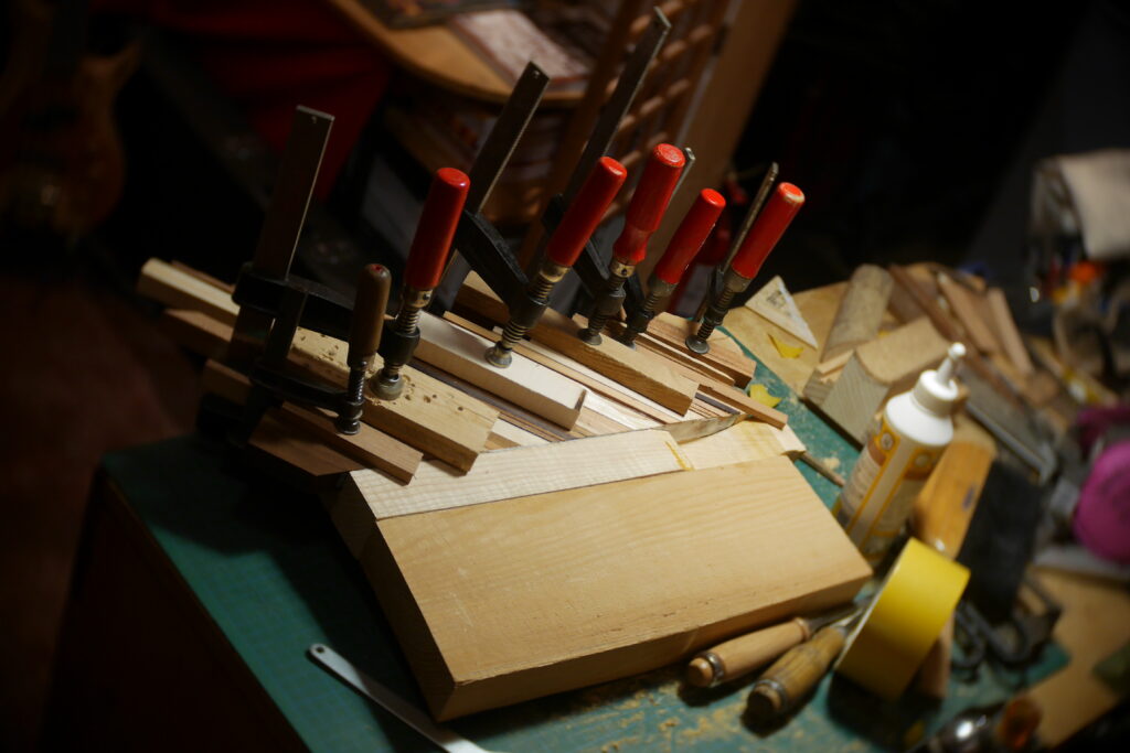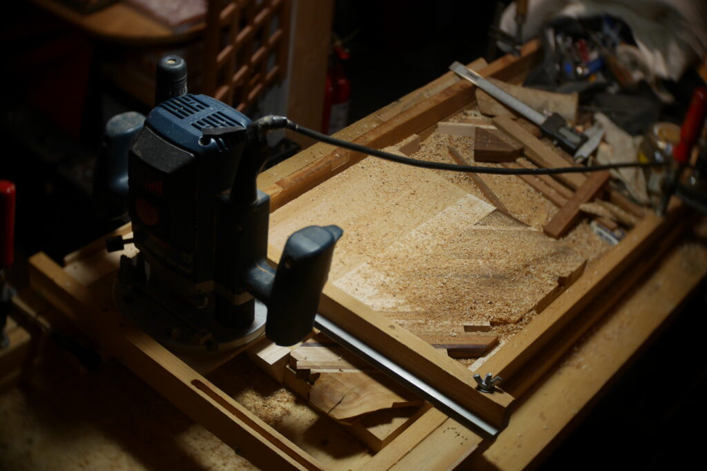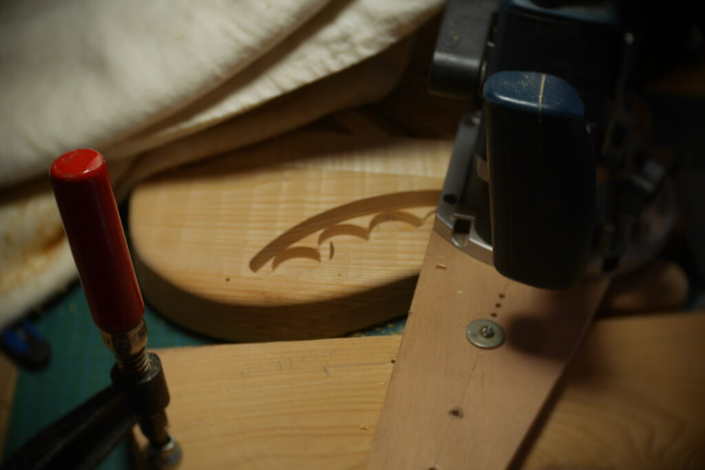 J’ai ensuite collé la marqueterie avant d’attaquer la planification de la table d’harmonie et du dos avec une défonceuse et des guides.