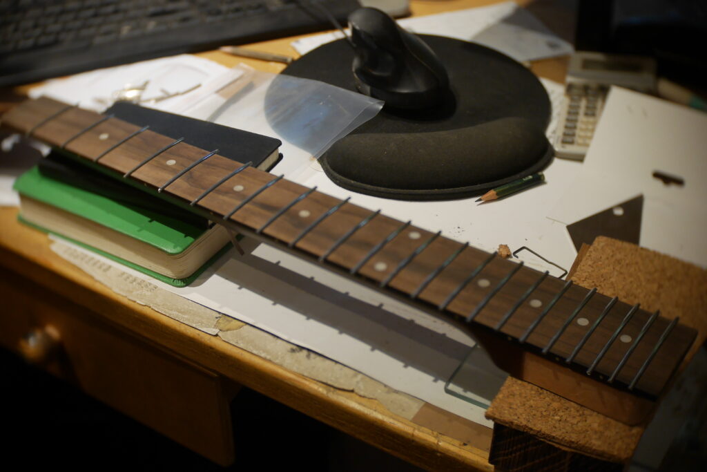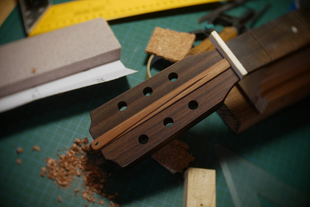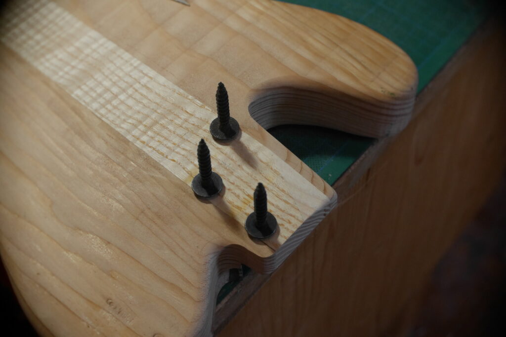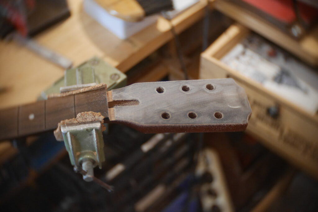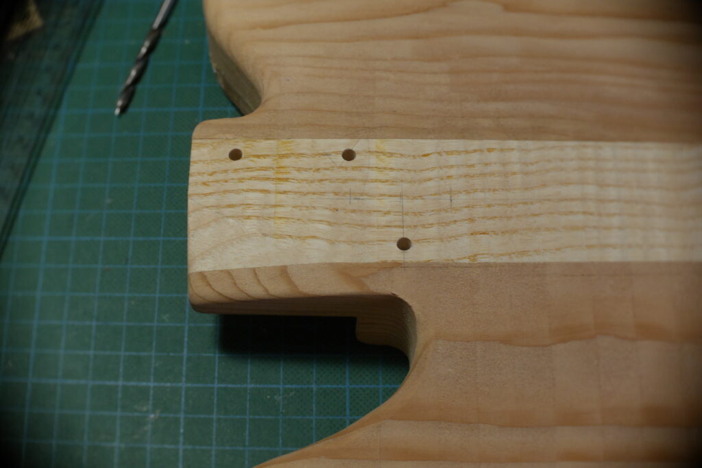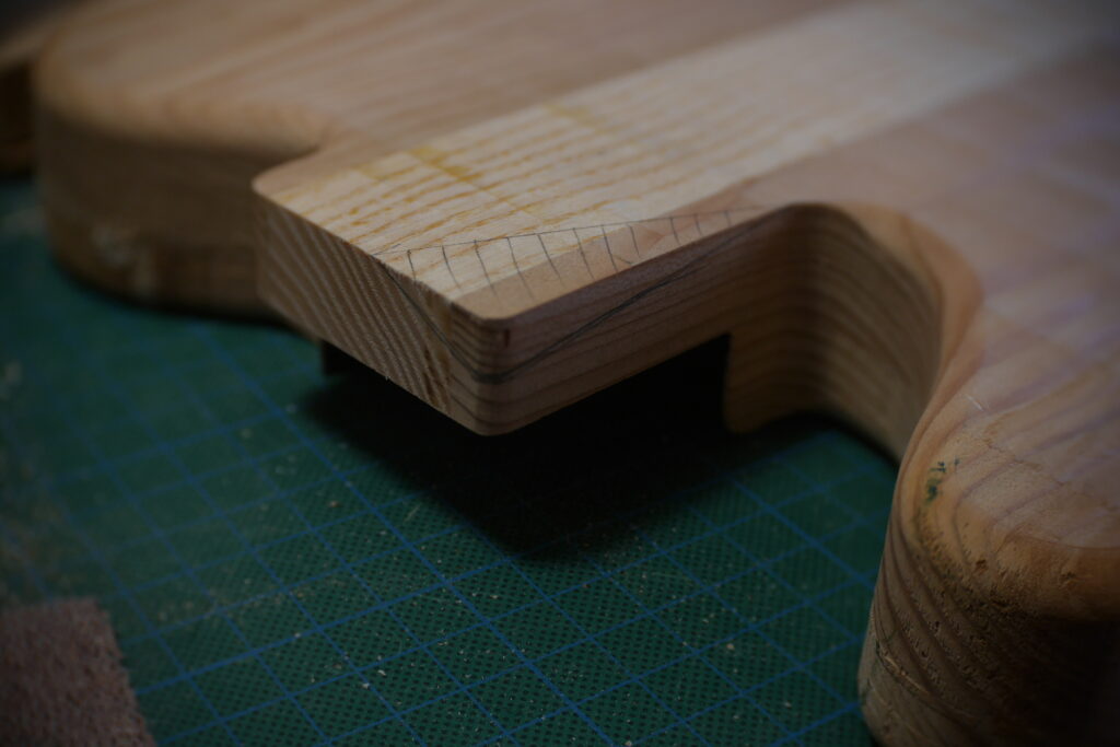J’ai raccourci le pocket neck et créé un chanfrein pour la main et donner un accès plus aisé aux aigües, et percé les trous des trois vis.