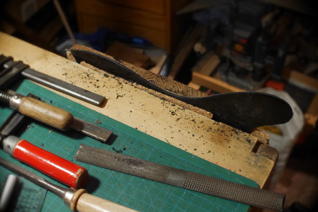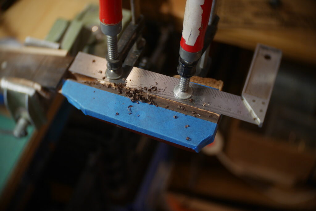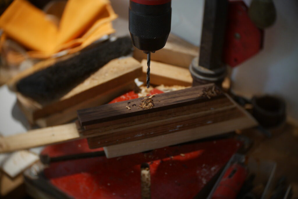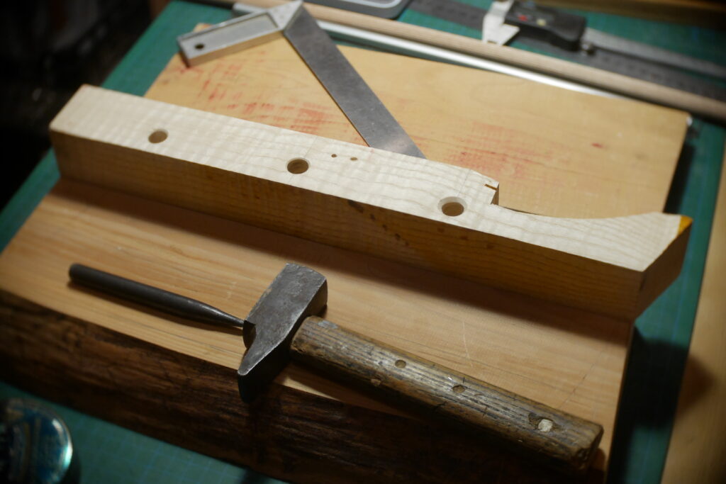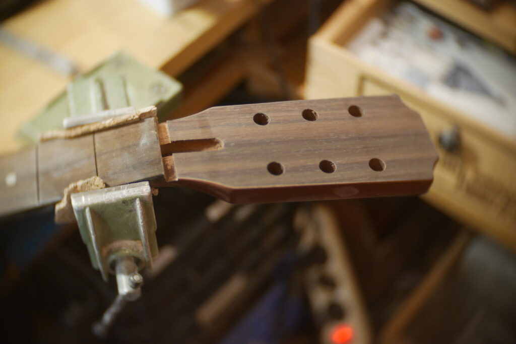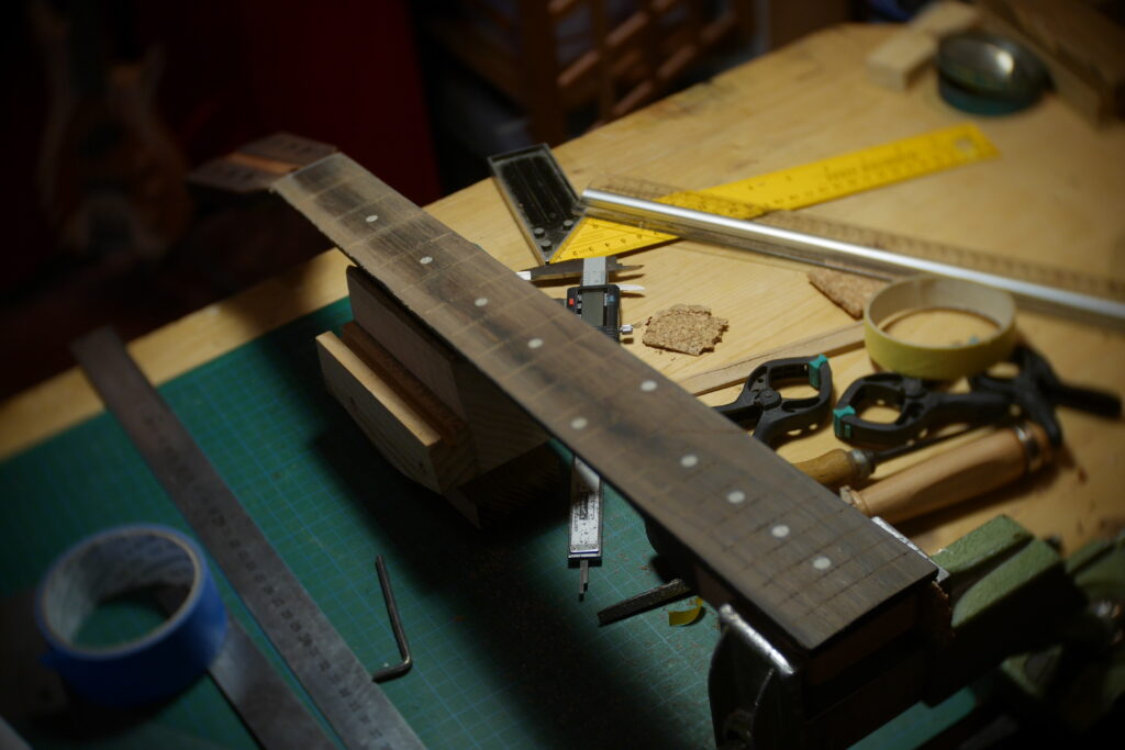 J’ai raccourci le pocket neck et créé un chanfrein pour la main et donner un accès plus aisé aux aigües, et percé les trous des trois vis.