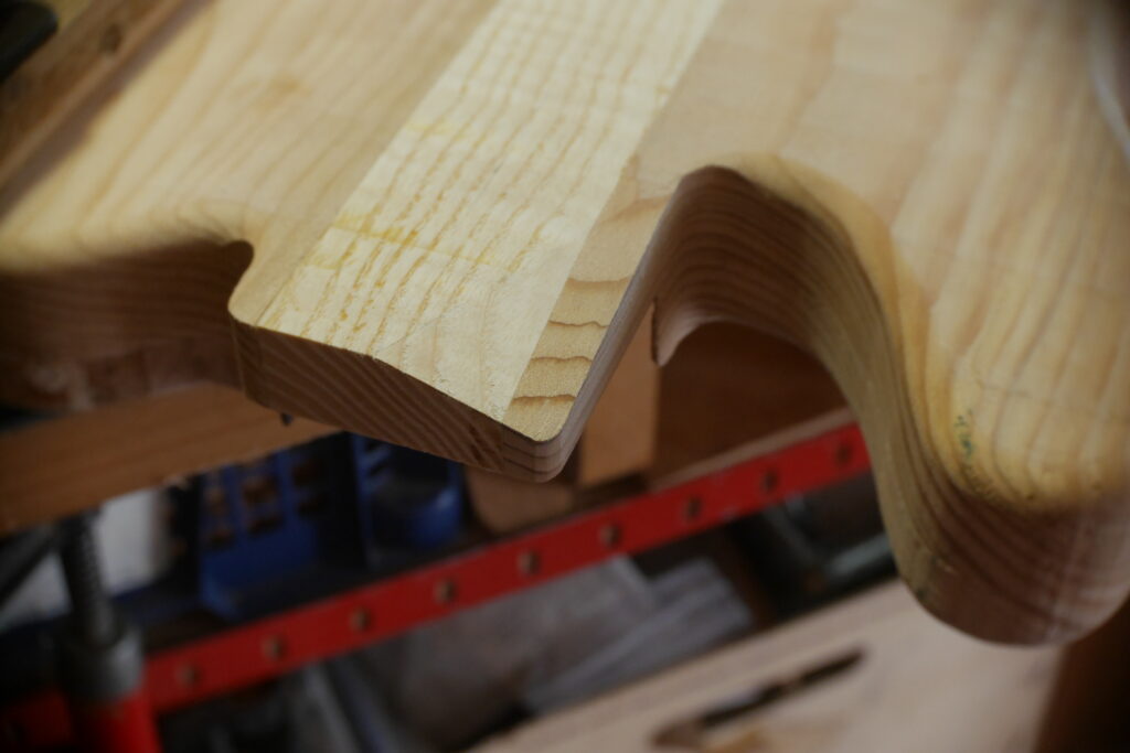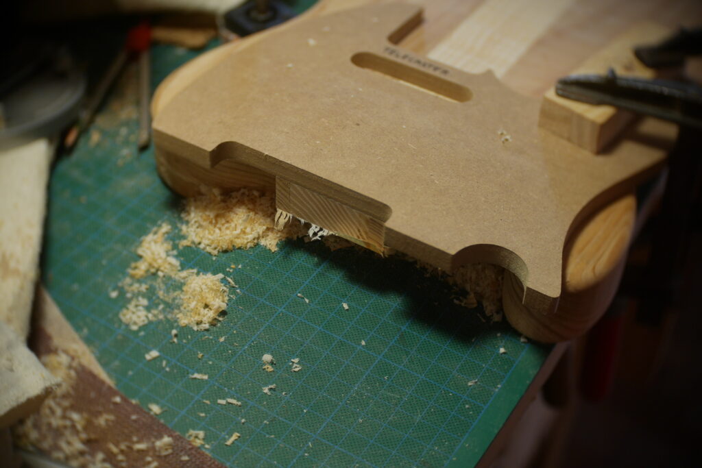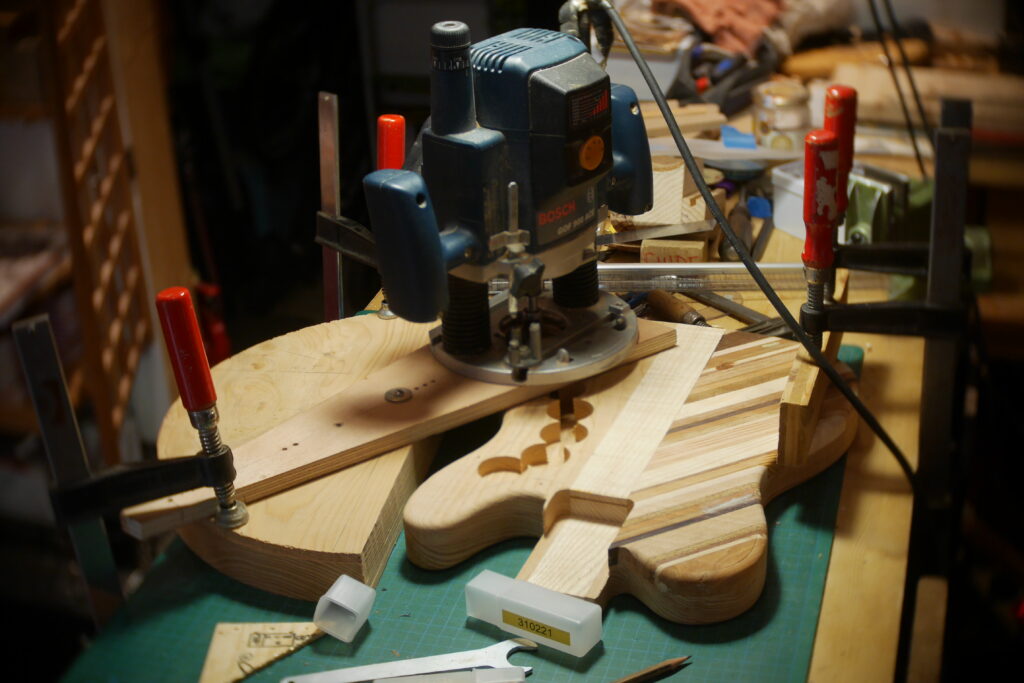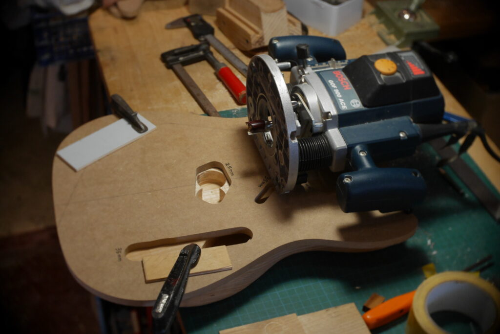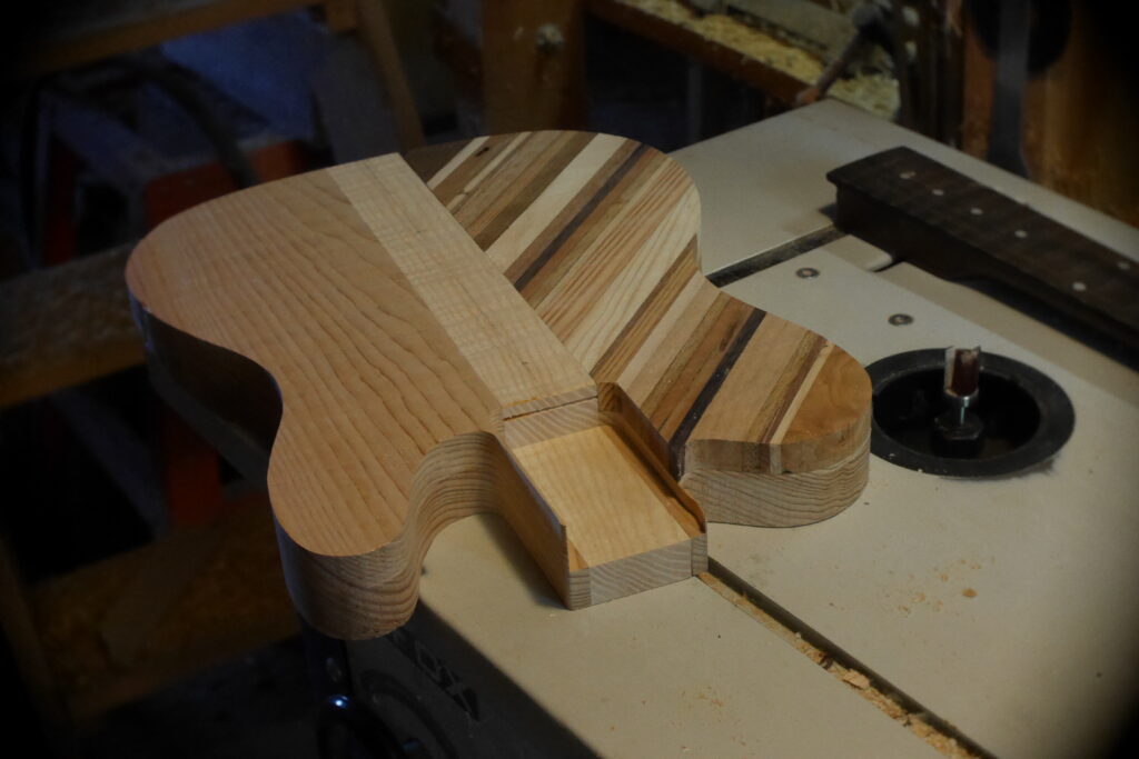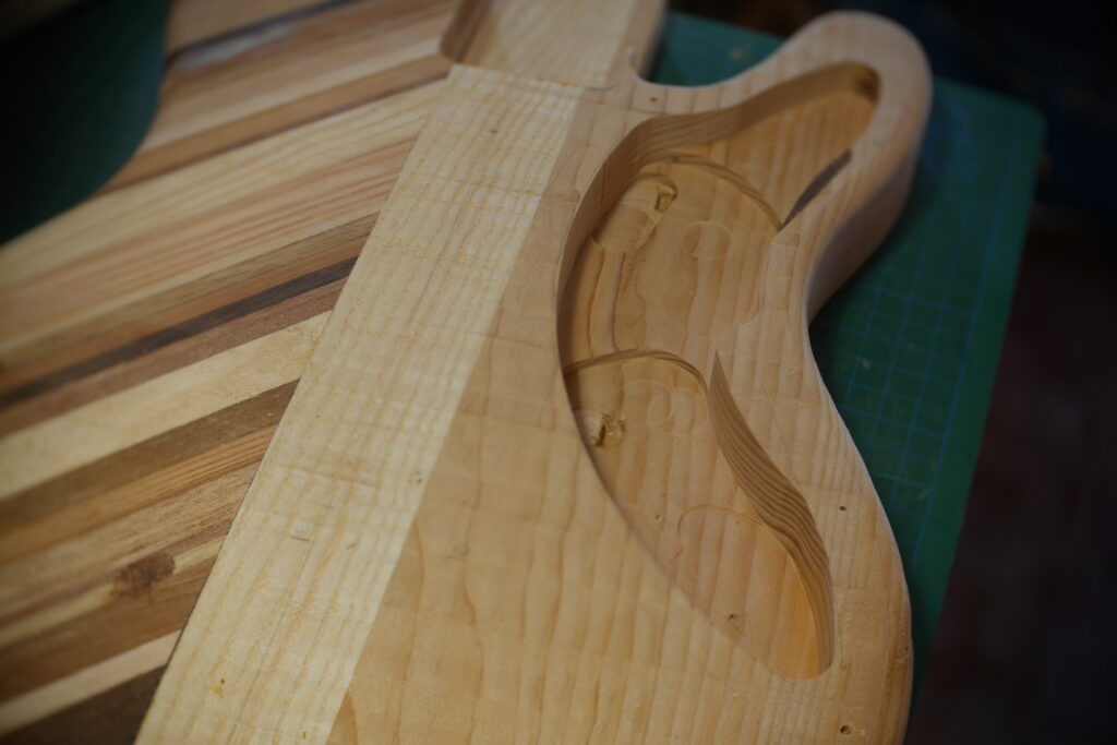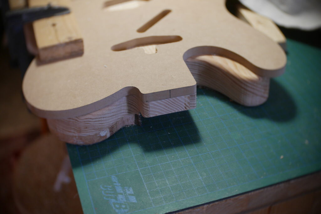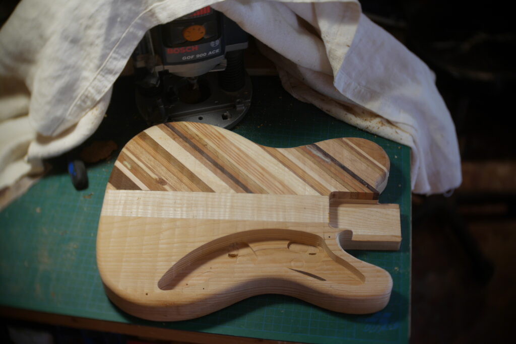 Le contour aussi a été défoncé à l’aide d’un gabarit et d’une défonceuse sous table. Les cavités, le neck pocket et les contours arrondis le sont aussi dans le même élan. Le manche, quand à lui, est une récupération dont j’ai préalablement retiré les frettes et défoncé le cou pour l’adapter au pocket neck.