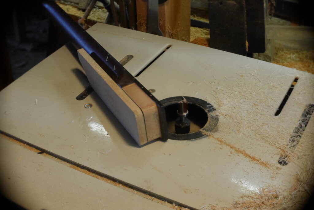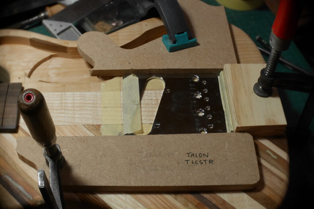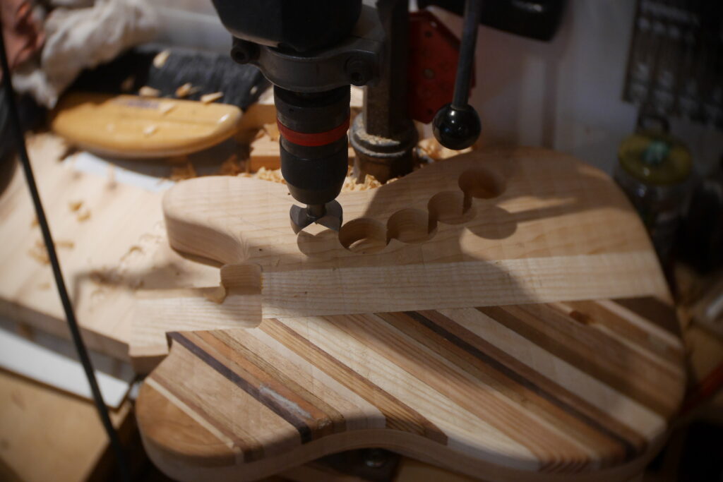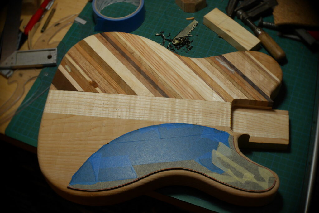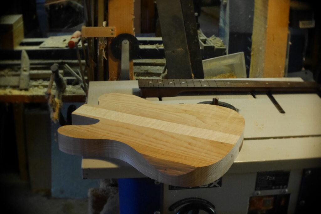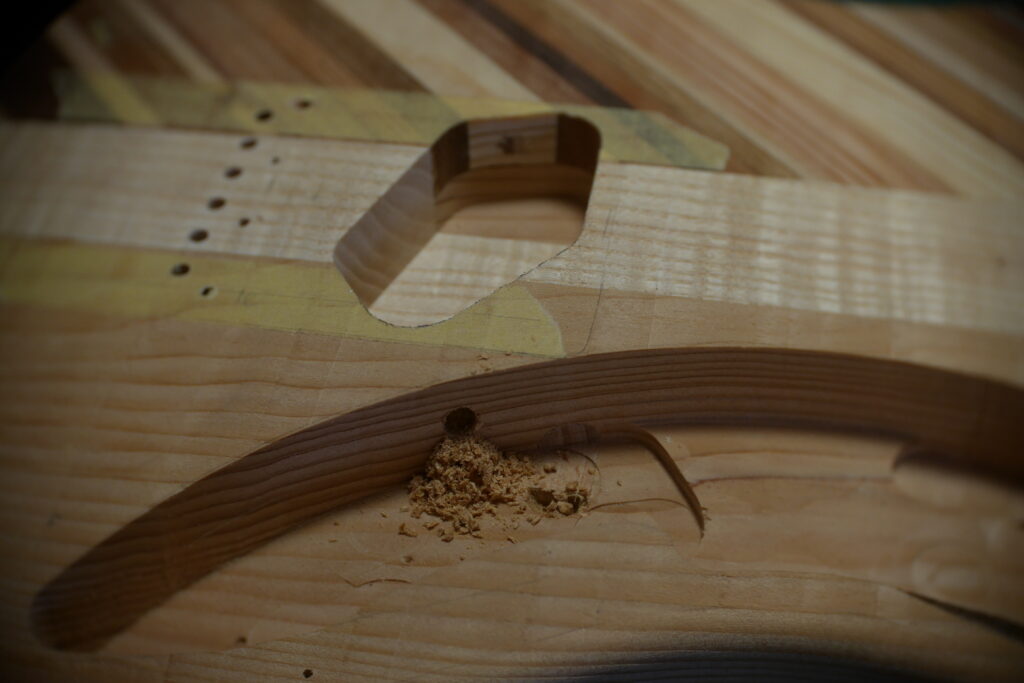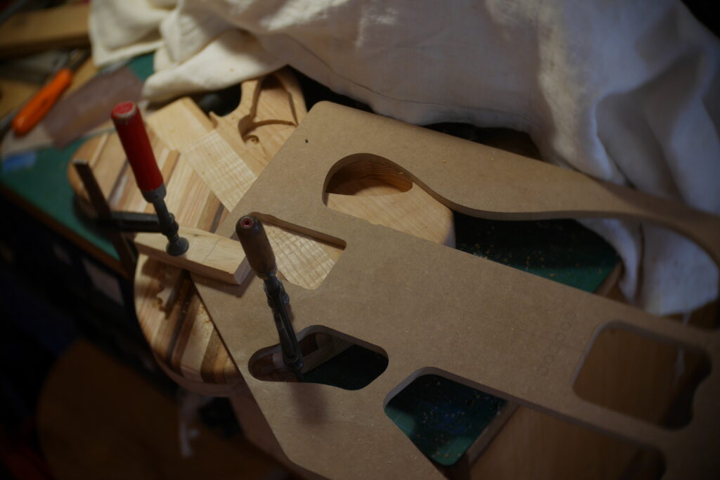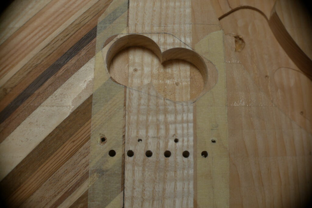 Le contour aussi a été défoncé à l’aide d’un gabarit et d’une défonceuse sous table. Les cavités, le neck pocket et les contours arrondis le sont aussi dans le même élan. Le manche, quand à lui, est une récupération dont j’ai préalablement retiré les frettes et défoncé le cou pour l’adapter au pocket neck.