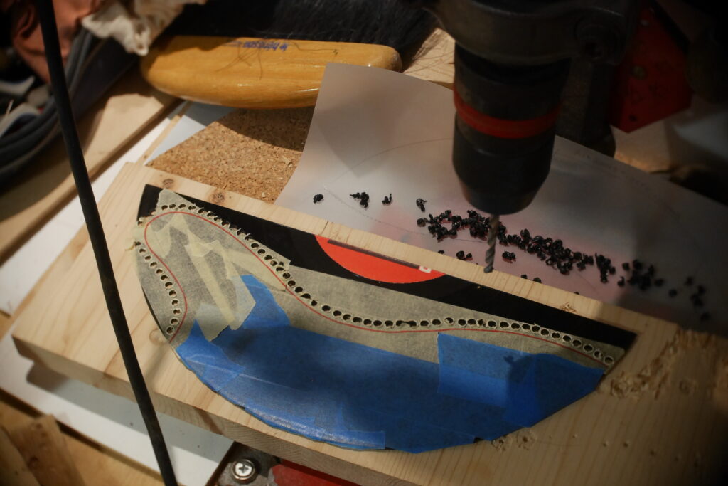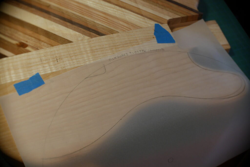 Pour le pickguard, toujours en vinyle, bien épais ce coup-ci, je voulais ne conserver que les sillons pour éviter les remarques sur l’origine de la galette. Je dois dire, et je ne m’en suis rendu compte qu’à la fin, que le rendu est quand même plus classe sans étiquette.