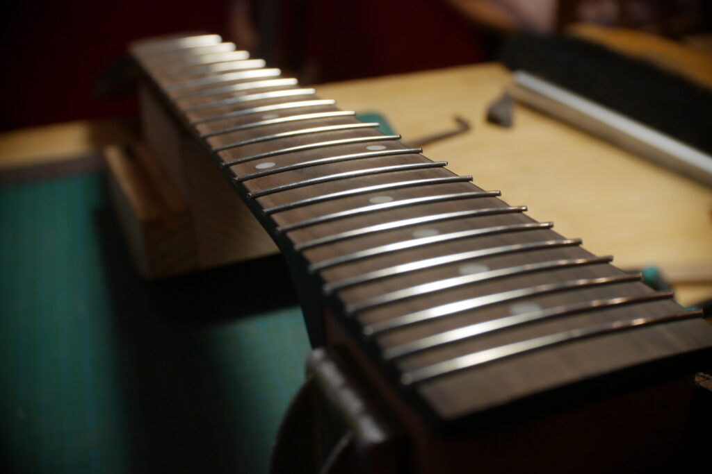 Comme je l’ai dit plus haut, le manche est de récupération, mais neuf. Fabriqué à la chaine et non utilisé. J’ai refait le radius de la touche en 14 pouces, mis de nouvelles frettes Fender standard medium, fais un nouveau sillet en os, un cache-trussrod-logo incrusté en cerisier, poncé le vernis de la tête et posé des mécaniques Gotoh.