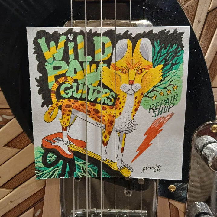 « Pattes de velour pour guitares sauvages » Dessin aux feutres pour logo d’atelier…