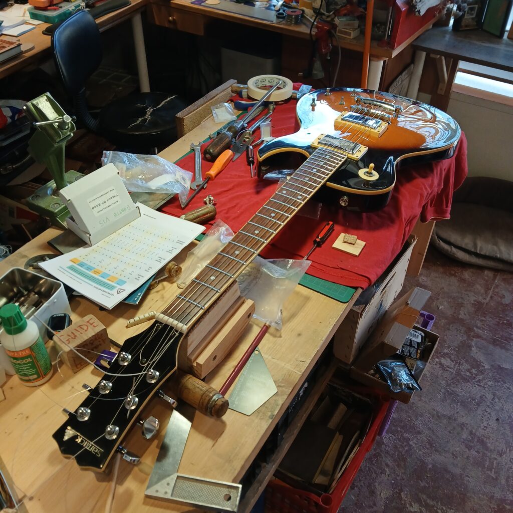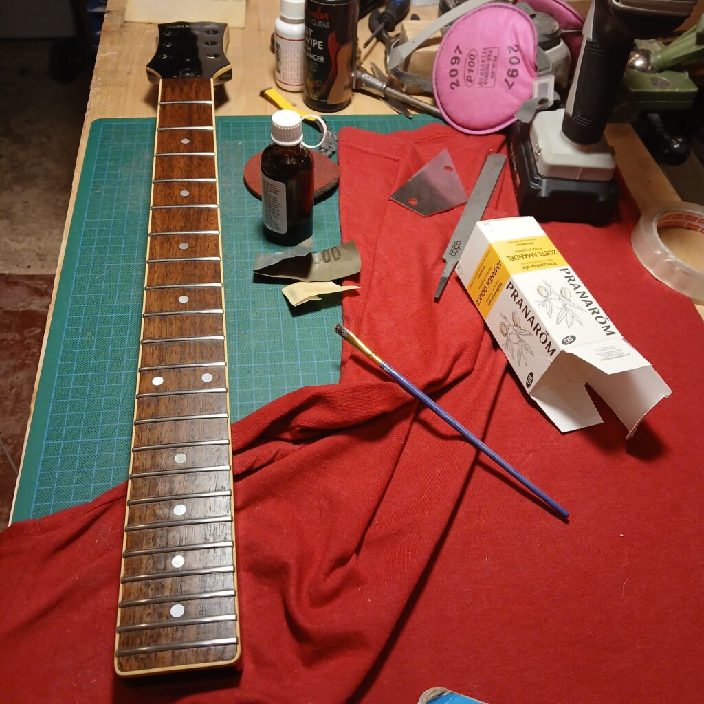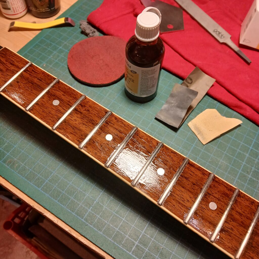 J’ai procédé à un nivellement des frettes, avec rond de frettes et bords de frettes, et nourris la touche à l’huile d’amande douce.