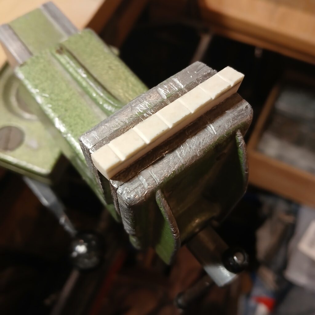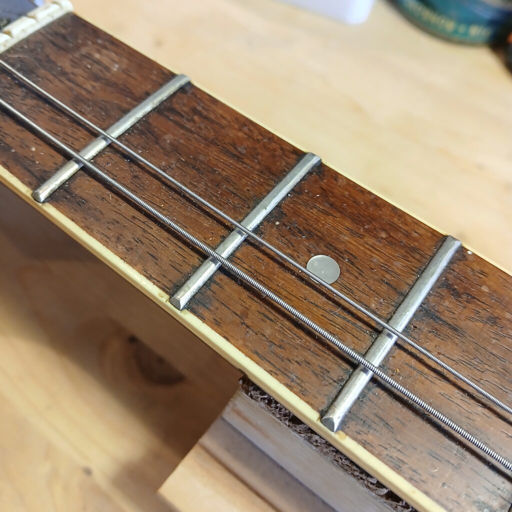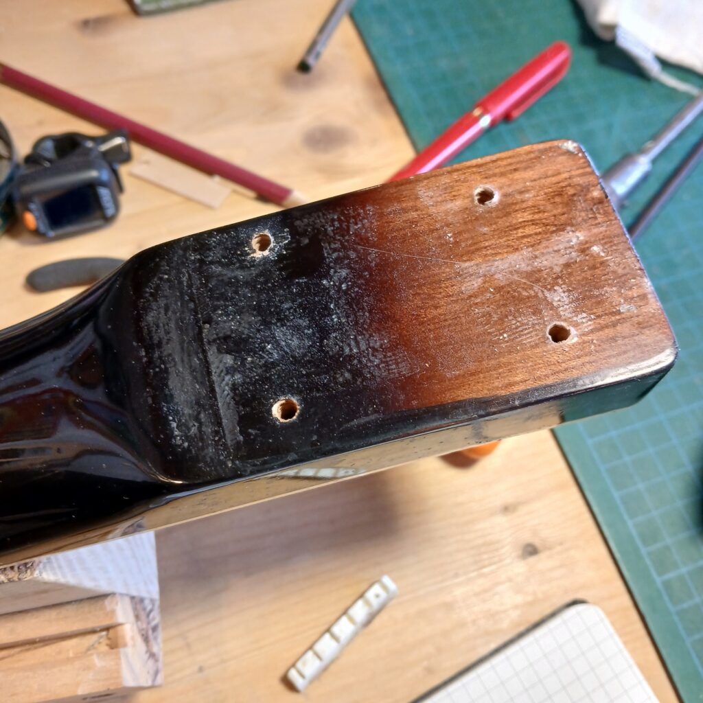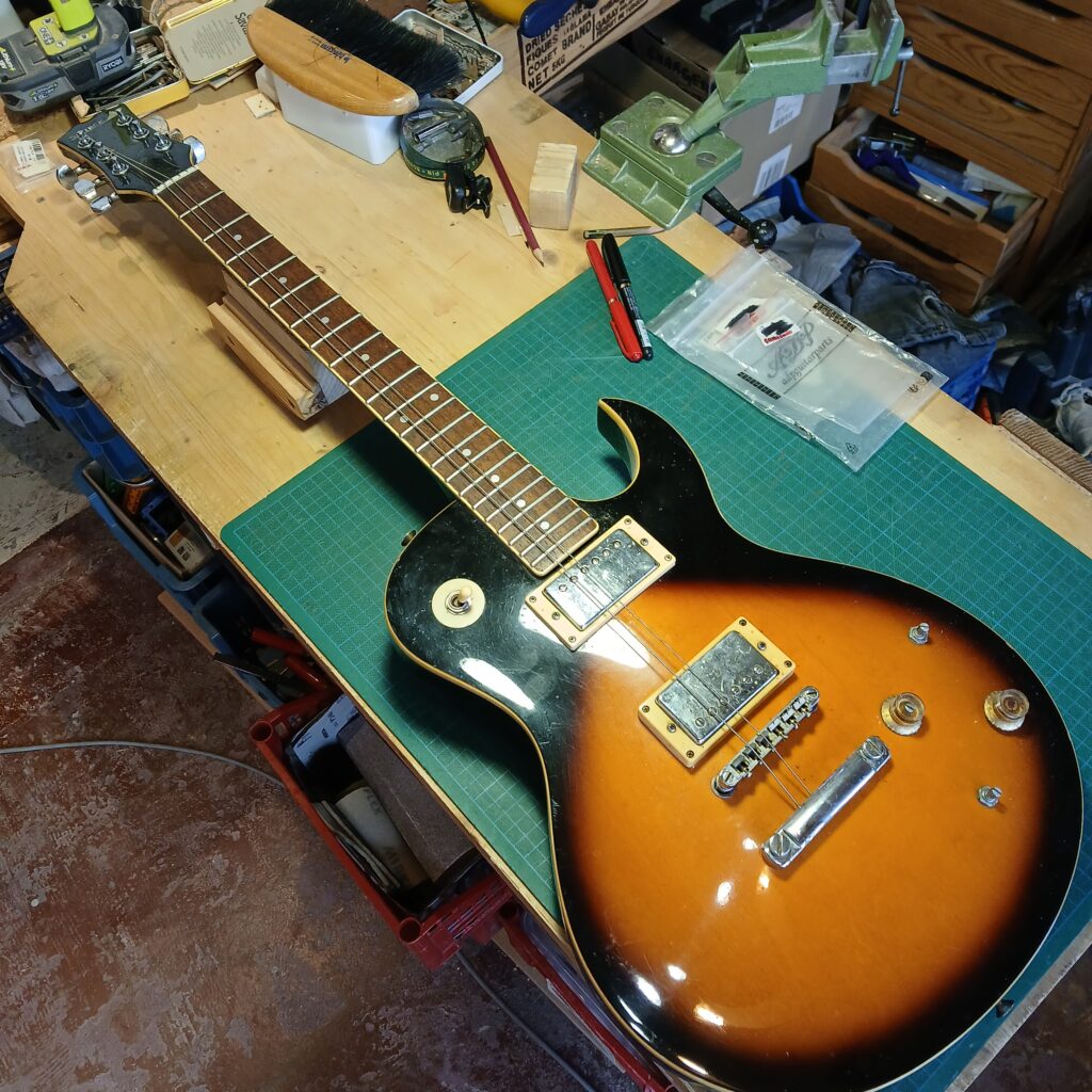 J’ai procédé à un nivellement des frettes, avec rond de frettes et bords de frettes, et nourris la touche à l’huile d’amande douce.