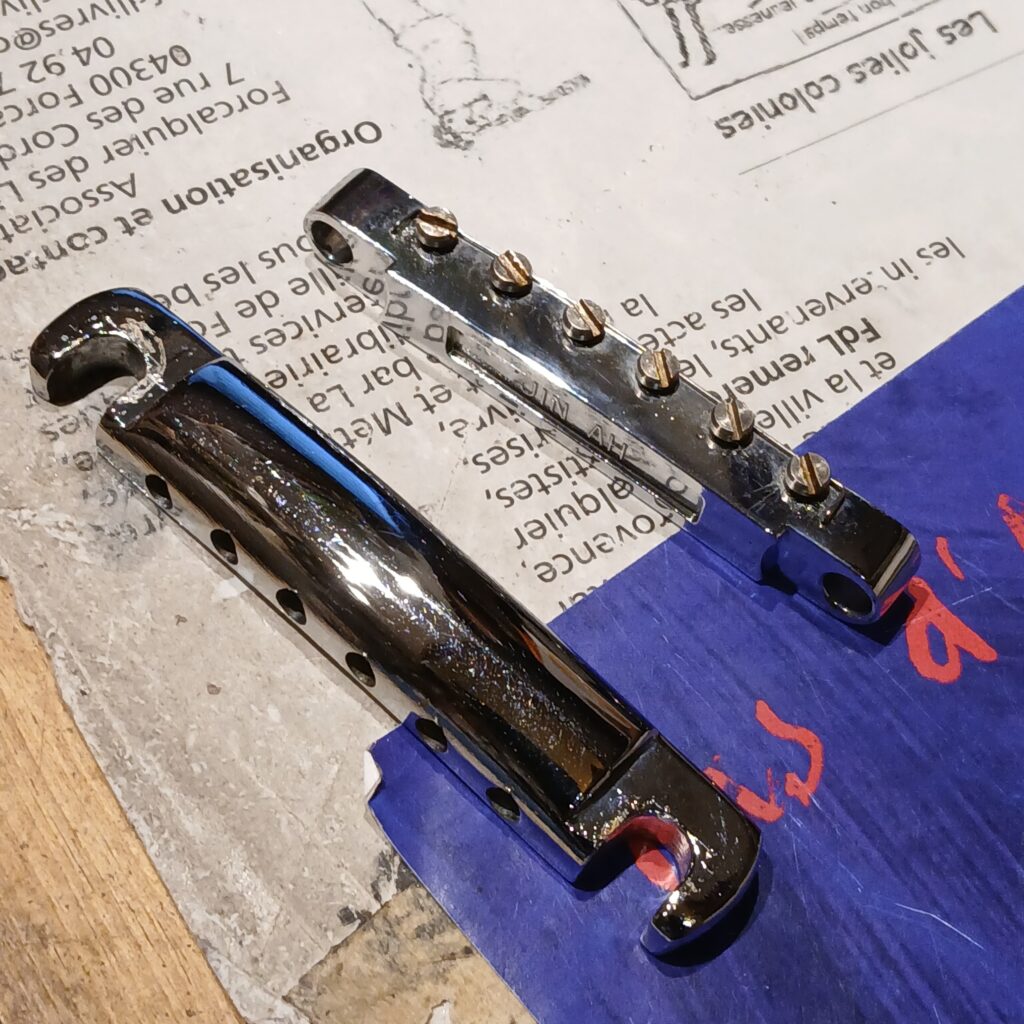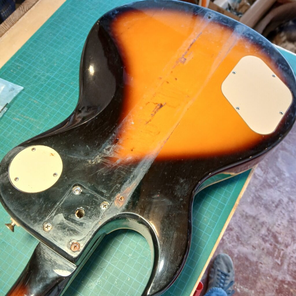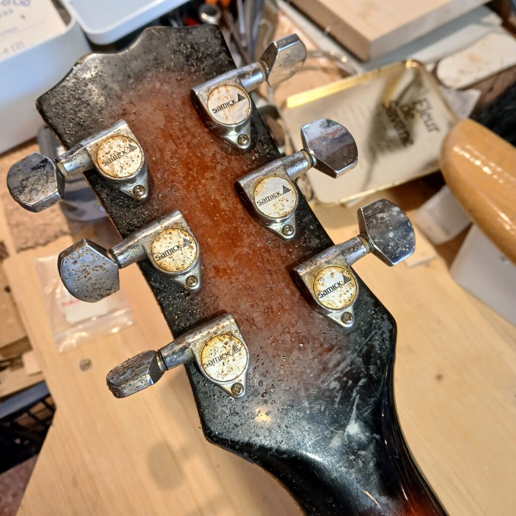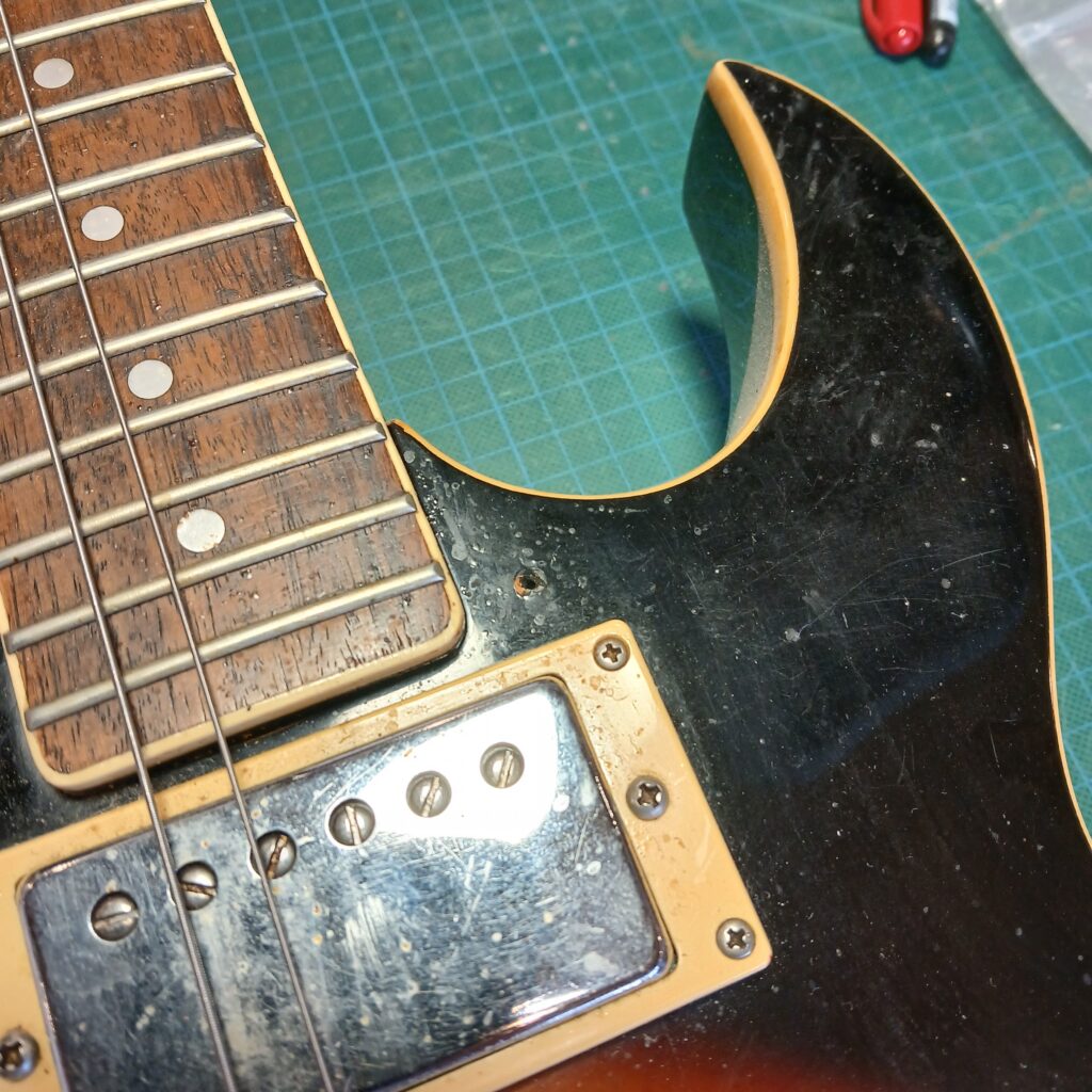 Le gros du travail consistait à bien nettoyer tout le corps. Je n’avais encore jamais vu autant de chiures et c’était bien dégueux : La tête, devant derrière, les mécaniques, les micros et leurs supports, le chevalet et le corps, surtout l’arrière. J’ai ensuite polissé et lustré tout ça. La brillance est revenu, sans effacer l’histoire de cette guitare, qui a quand même 35 ans !