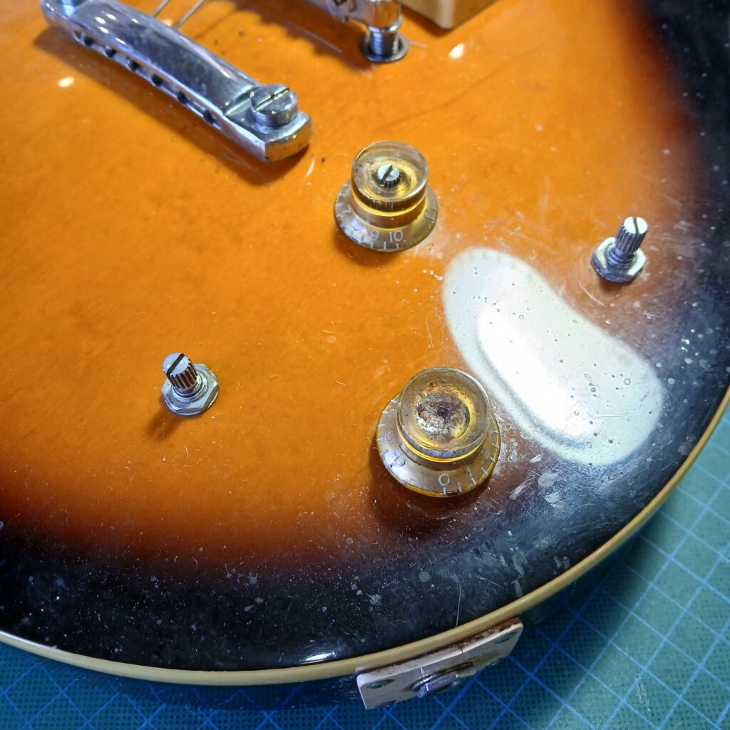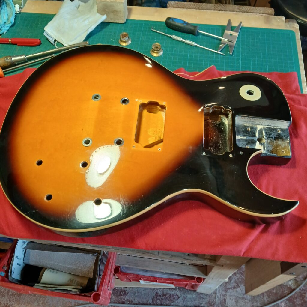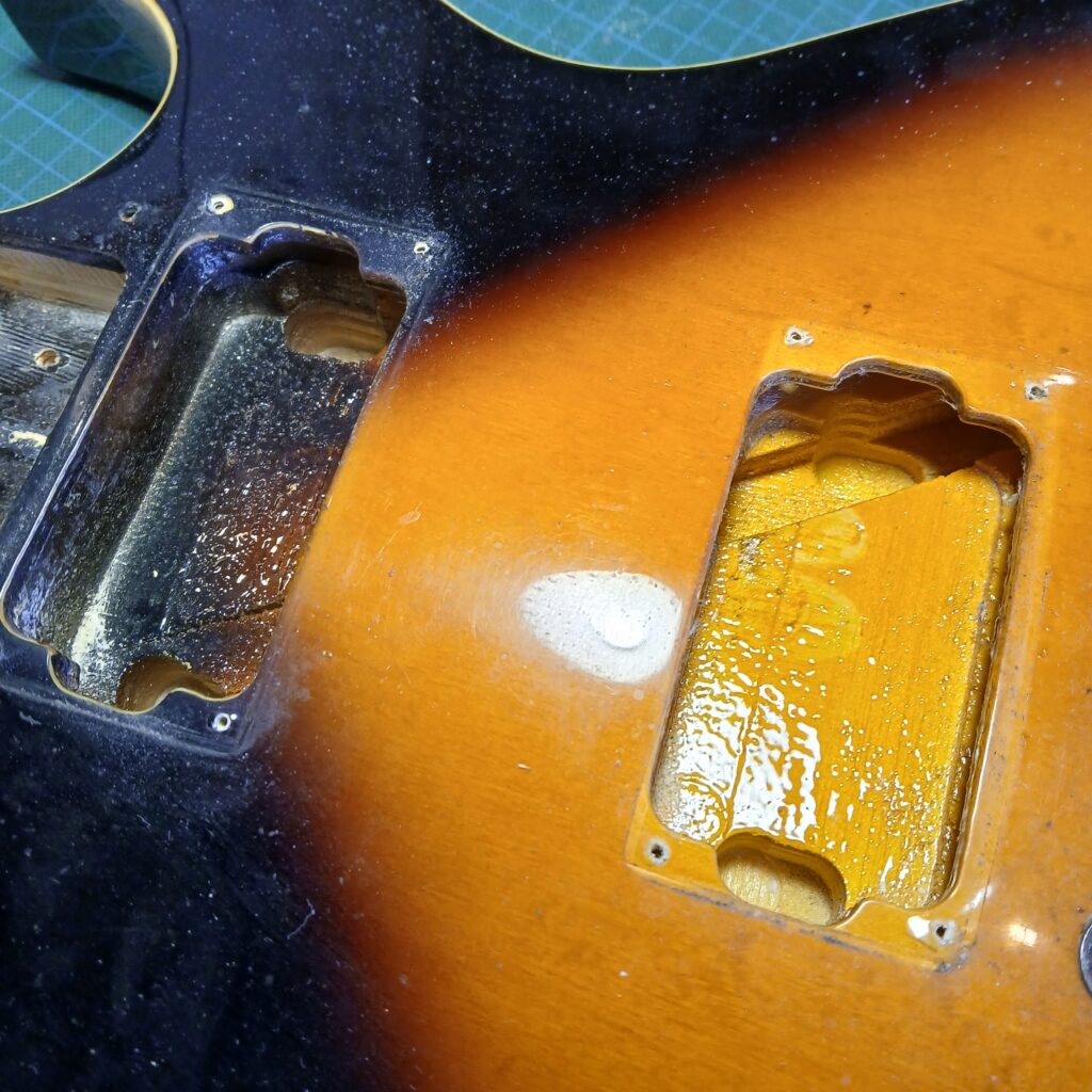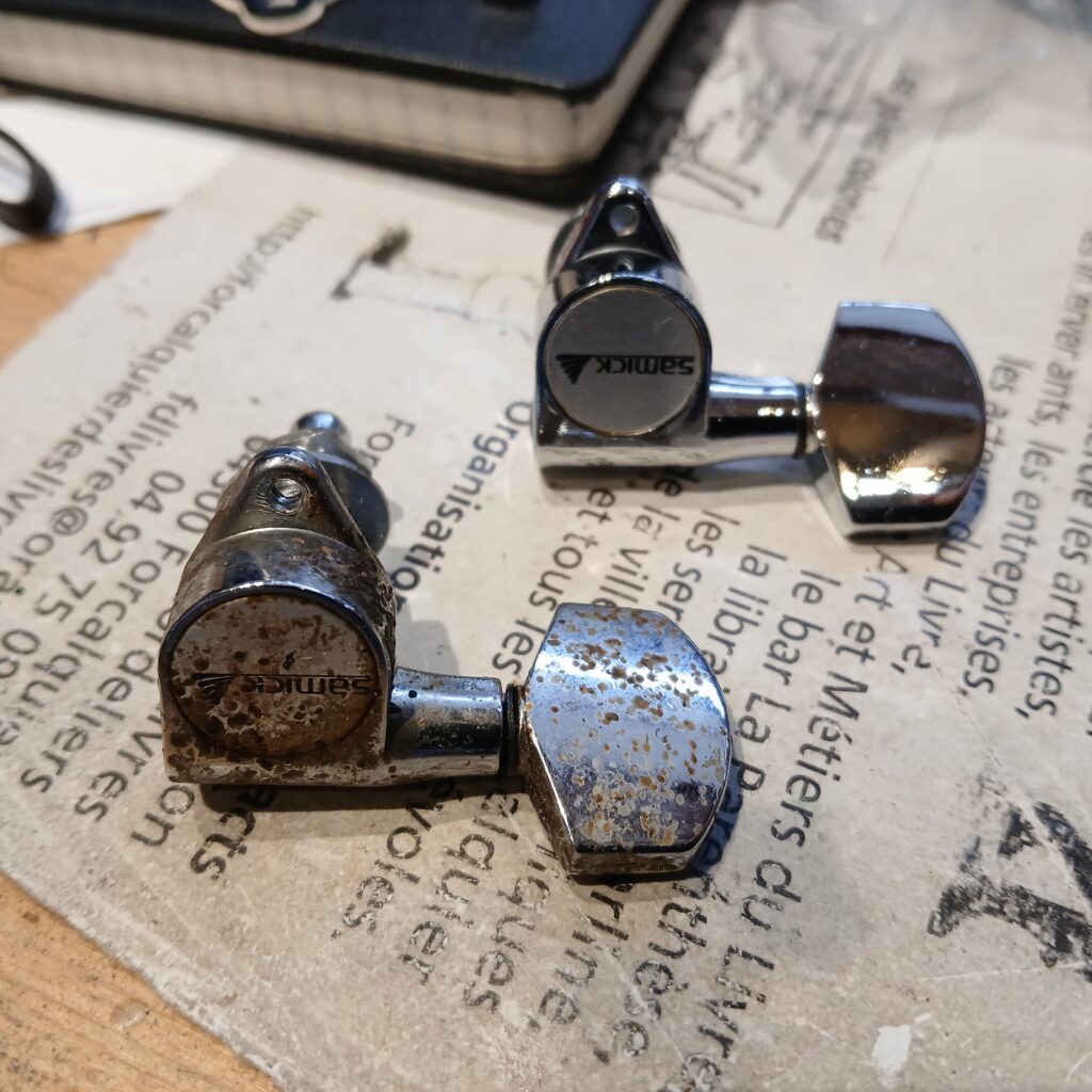 Le gros du travail consistait à bien nettoyer tout le corps. Je n’avais encore jamais vu autant de chiures et c’était bien dégueux : La tête, devant derrière, les mécaniques, les micros et leurs supports, le chevalet et le corps, surtout l’arrière. J’ai ensuite polissé et lustré tout ça. La brillance est revenu, sans effacer l’histoire de cette guitare, qui a quand même 35 ans !