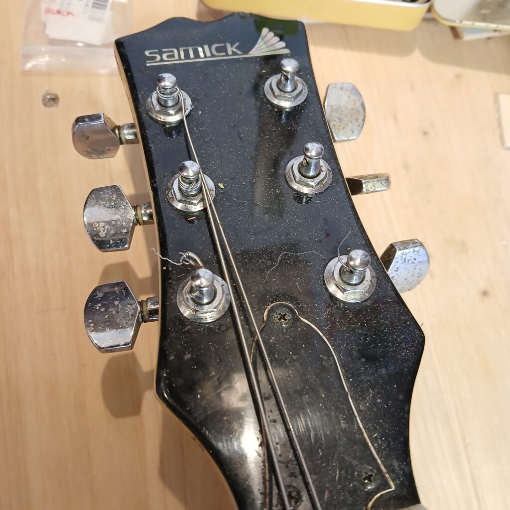 Rénovation d’une guitare de forme Les Paul : Une Samick LSE-450 en golden sunburst de 1991 (fiche technique). Samick, anciennement Hondo, est une usine d’instrument de musique de Corée du sud qui produit aussi Epiphone pour le compte de Gibson à l’époque. Après des copies strictement identique, Gibson a fait pression pour que les productions est leurs propres proportions et headstock. Ainsi est née ce modèle, avec une longue corne pointue que j’aime beaucoup.