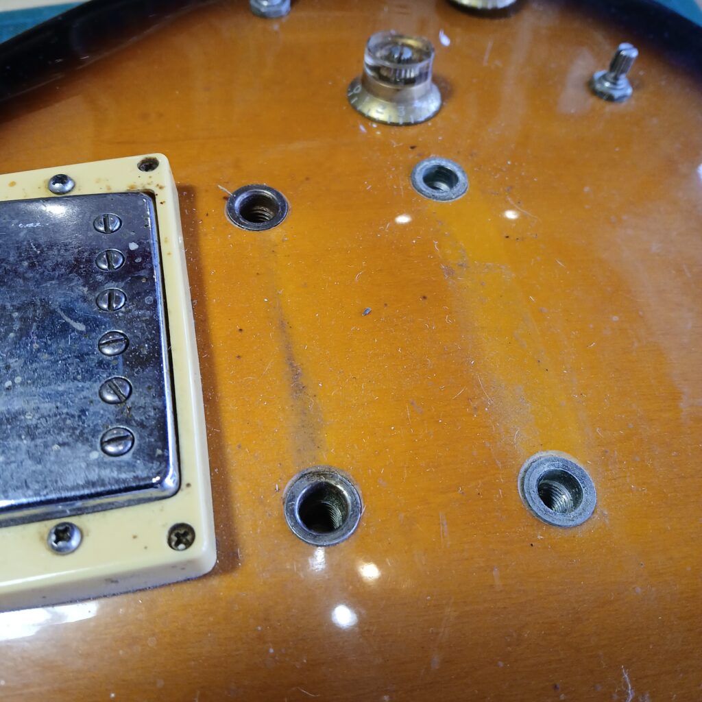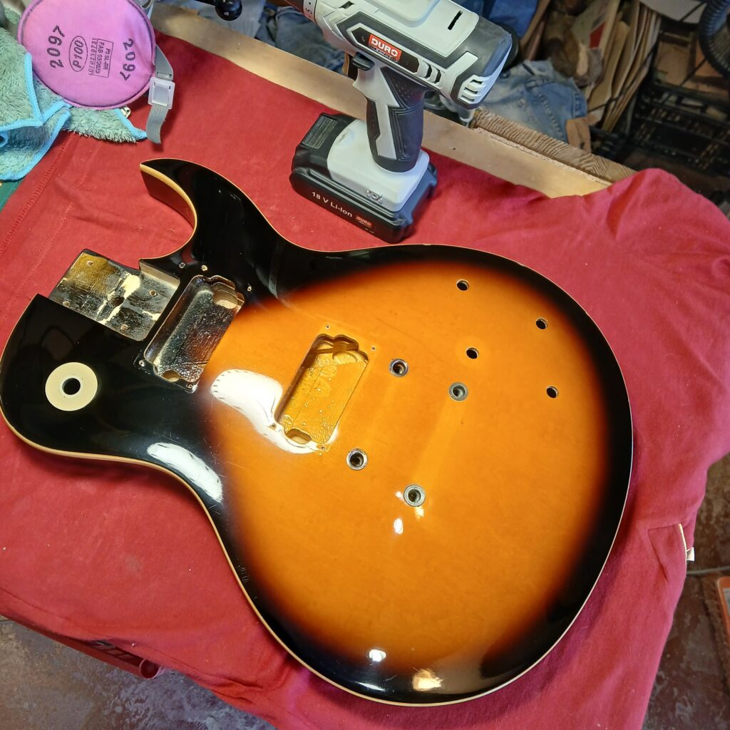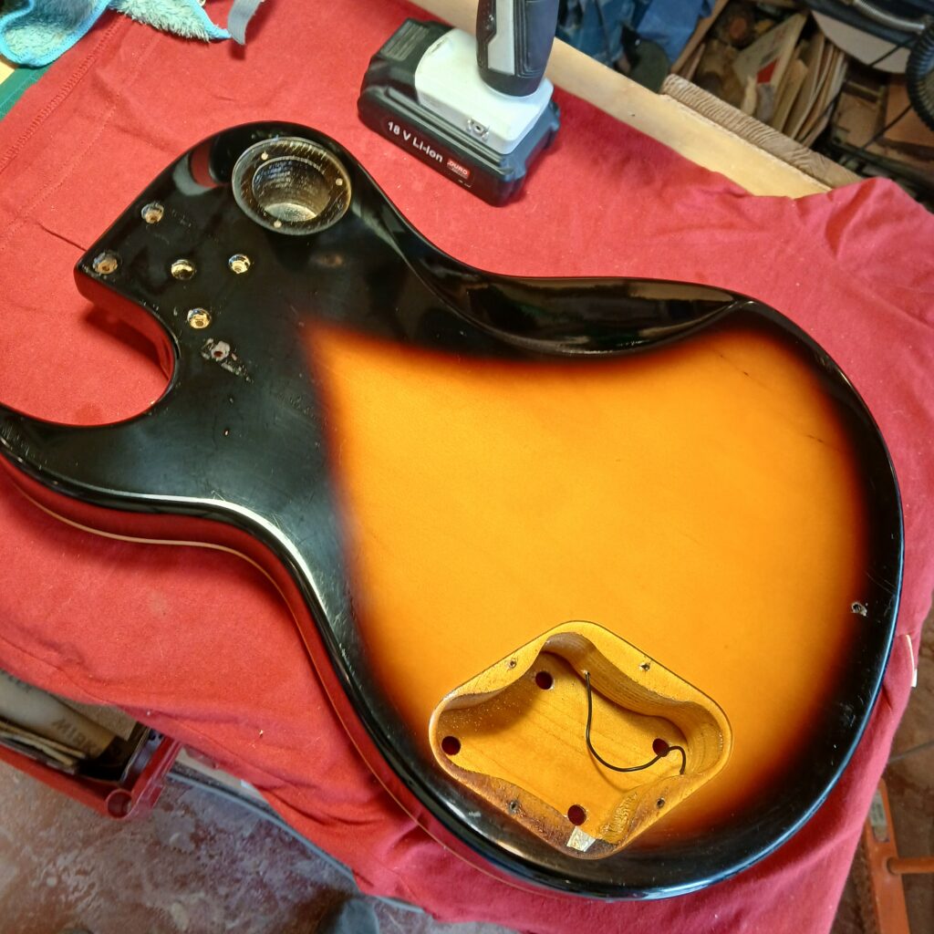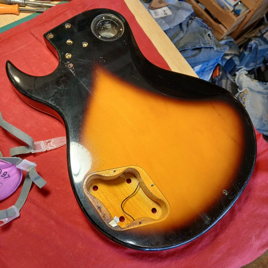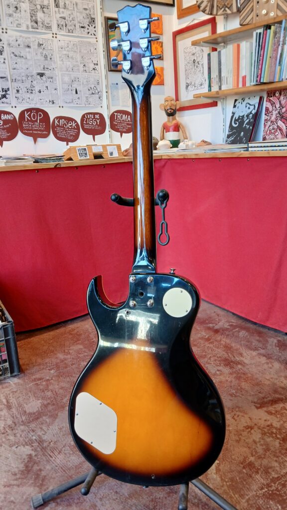 Ce qui saute tout de suite aux yeux, c’est la dégueulasserie de l’instrument. Une colonie de mouches a vécu sur cette gratte! L’électronique est hors service. Le dos est abimé, la plaque du manche est manquante, le corps semble avoir été fixé sur un support, deux trous en attestent. Le manche est en bon état, quelques coups sur la tête, les frettes sont usées. Les deux boutons de potard qu’il reste sont à jeter, il manque le pickguard. Le corps est en contre plaqué avec un galbe de table contraint mécaniquement. Le vernis présente des rayures plus ou moins importantes.