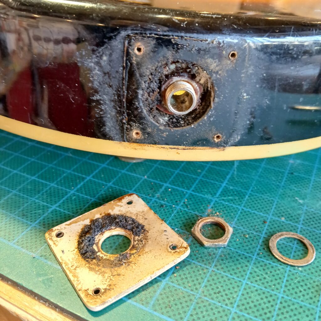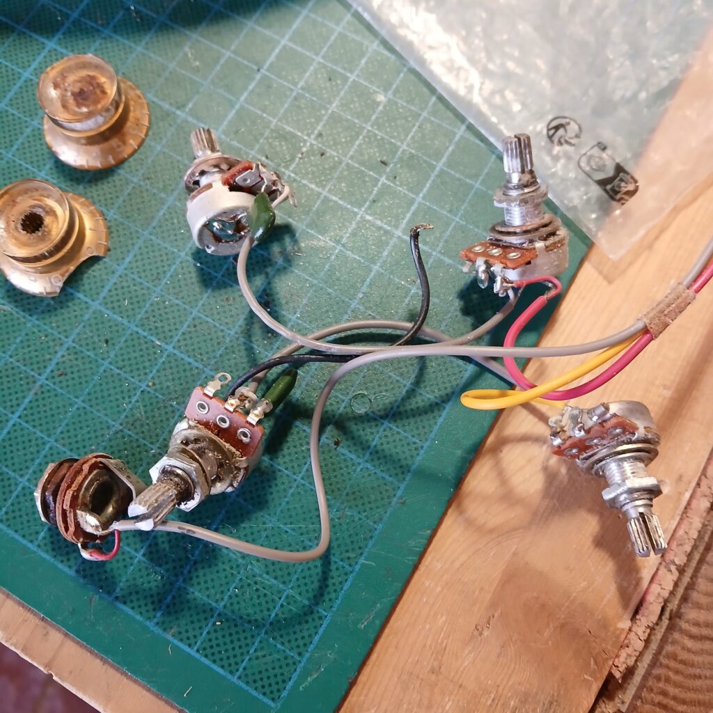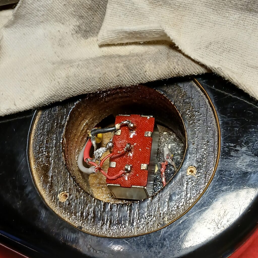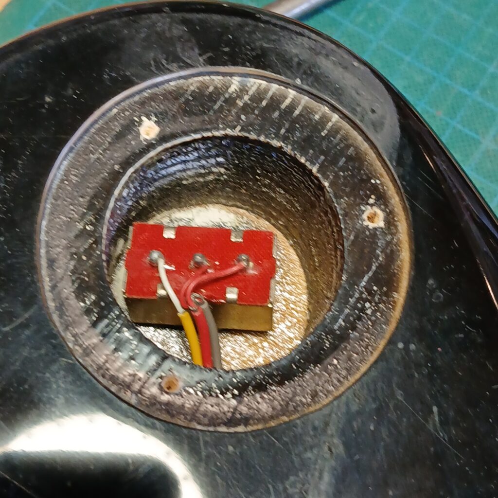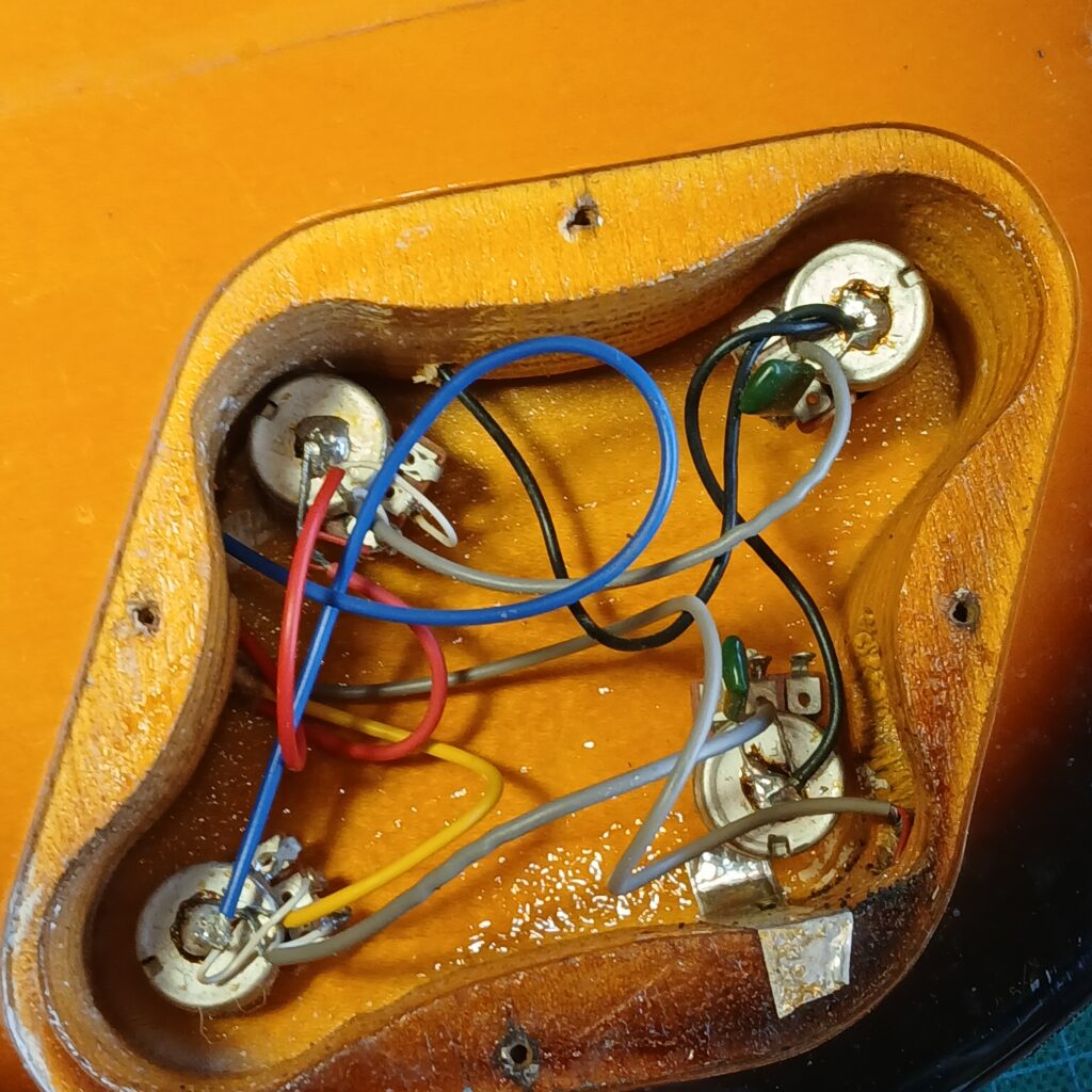 L’électronique était hors service. J’ai testé les micros hors circuit, ils fonctionnaient. Le premier souci venait du switch. Une gaine fondue du fil de sortie faisait que les + et – se touchaient. Après correction, le circuit fonctionnait presque entièrement. Seul un potard de tonalité faisait office de volume. J’ai remplacé le condensateur qui était grillé. J’ai aussi remplacé le jack et la plaque de jack, celle d’origine en plastique était fissurée. Et voilà le circuit de nouveau opérationnel.