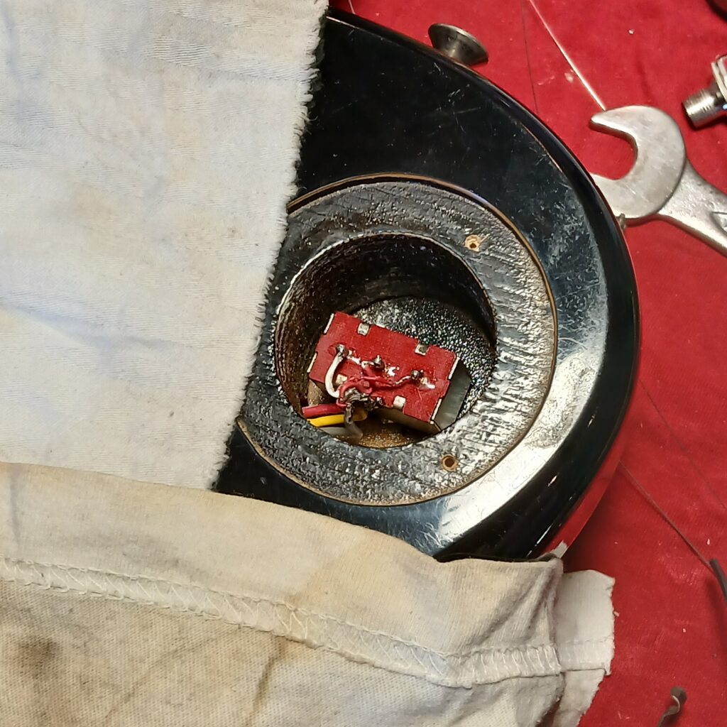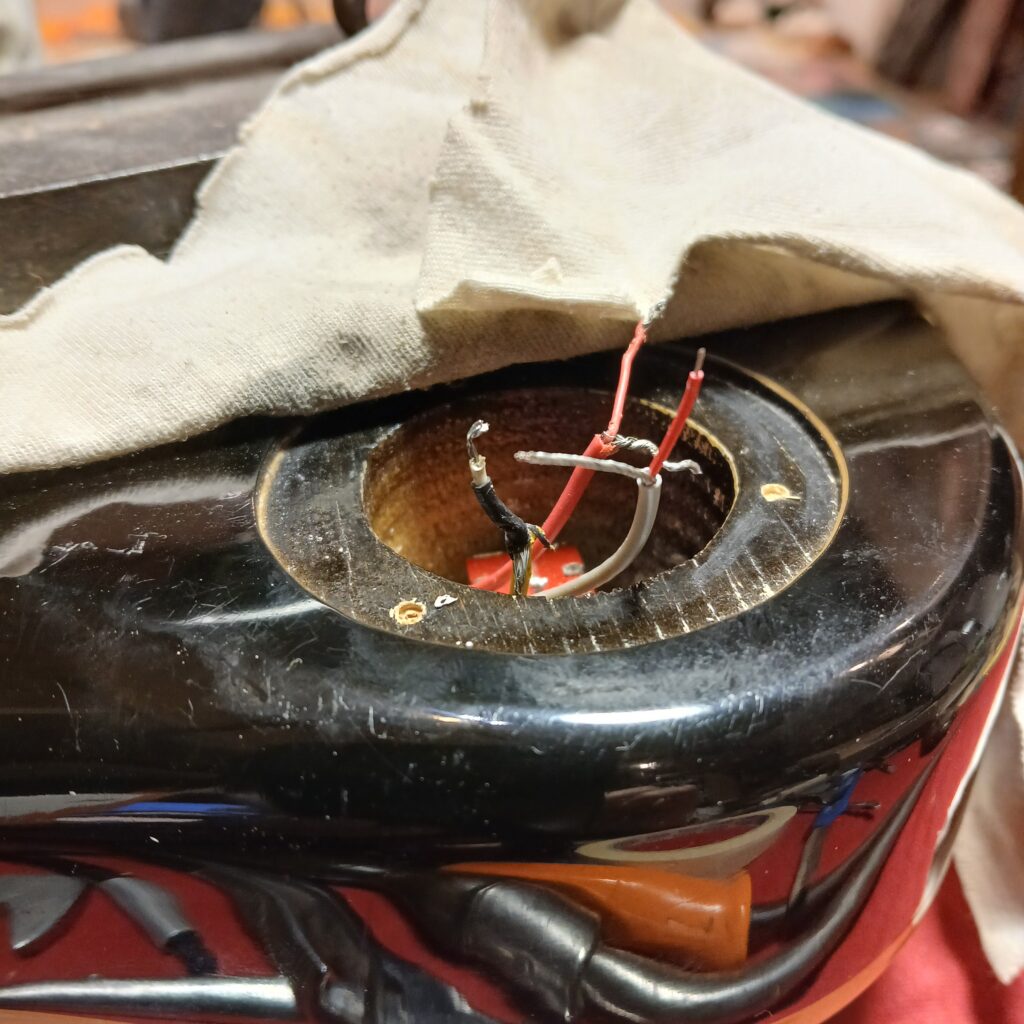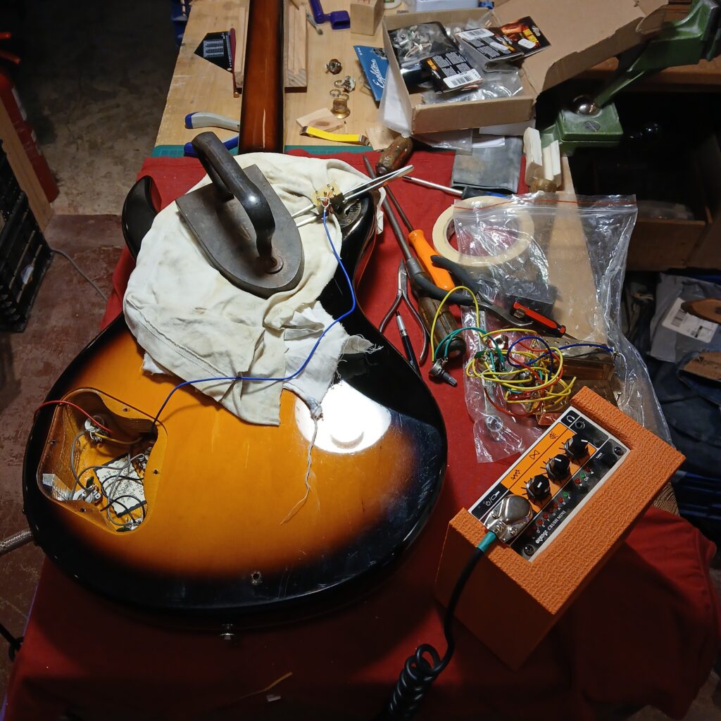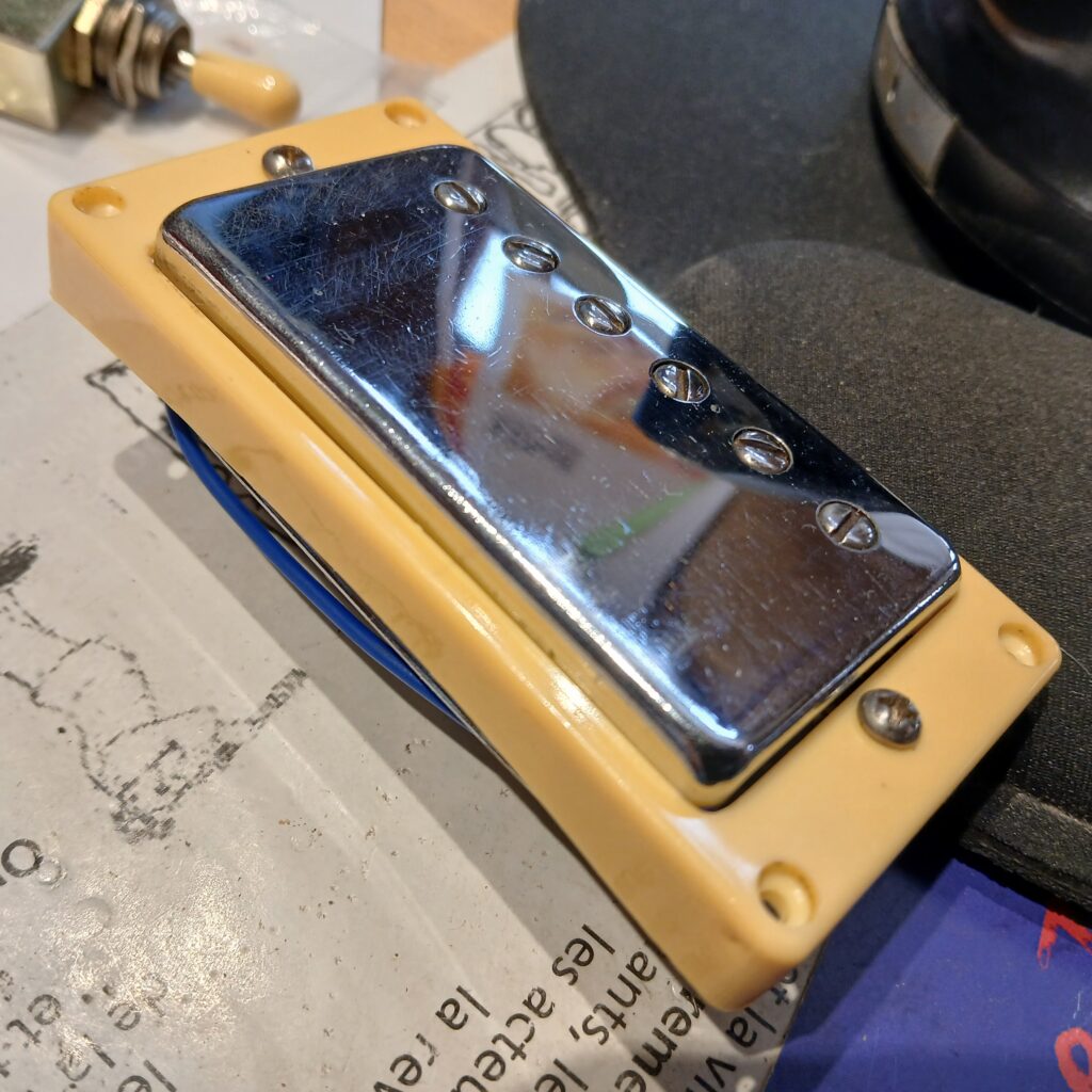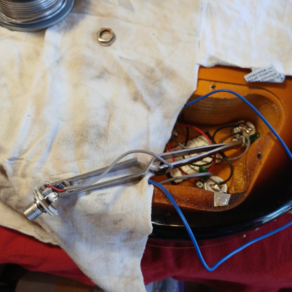 L’électronique était hors service. J’ai testé les micros hors circuit, ils fonctionnaient. Le premier souci venait du switch. Une gaine fondue du fil de sortie faisait que les + et – se touchaient. Après correction, le circuit fonctionnait presque entièrement. Seul un potard de tonalité faisait office de volume. J’ai remplacé le condensateur qui était grillé. J’ai aussi remplacé le jack et la plaque de jack, celle d’origine en plastique était fissurée. Et voilà le circuit de nouveau opérationnel.