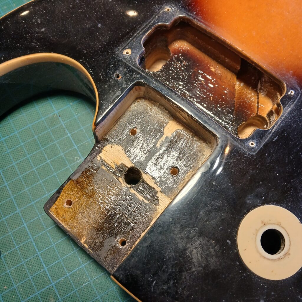 Au démontage, pas de grosse surprise, mis à part la cavité du jack, collée par une quantité de merde de mouche incroyable. Le trussrod fonctionne, le neck pocket est bien ajusté, les cavités sont propres, le sillet est en plastique.