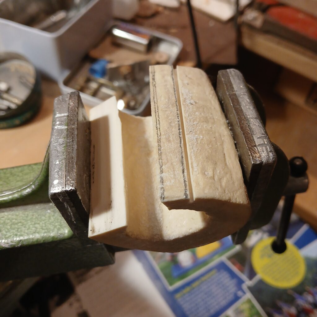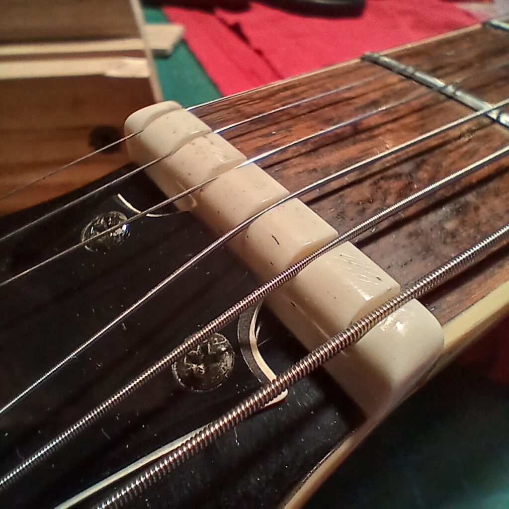 Fabrication d’un nouveau sillet en os, pose, montage des mécaniques, montage des cordes, réglages. L’action est très basse.