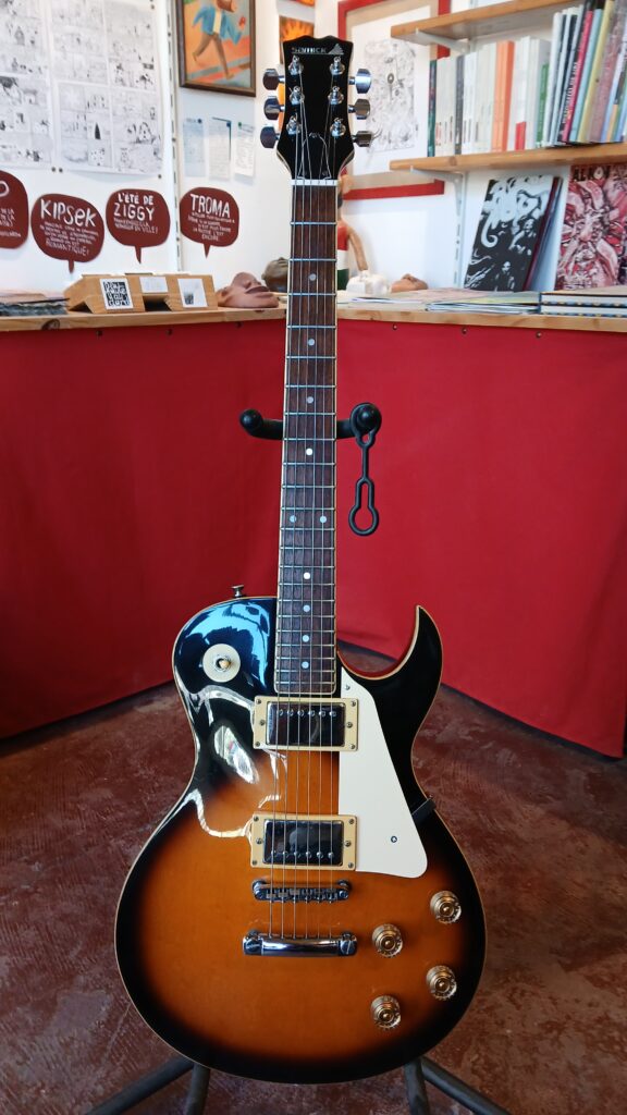 C’est maintenant une guitare parfaitement réglée, avec une action très basse, montée en 10/46. Les micros sont bons, le poids est convenable (3,5kg), et avec un diapason typique Gibson de 62,865 cm. Visuellement, elle a du caractère, du vécu et de l’originalité avec cette corne pointue qui lui donne un côté plus agressif qu’une Les Paul. Cela reste la copie d’une gratte de légende, mais une copie réalisée par le copieur officiel, et sera idéale pour débuter la guitare à moindre frais sur un instrument très confortable, ou comme seconde guitare, de voyage, de répète, ou que sais-je…