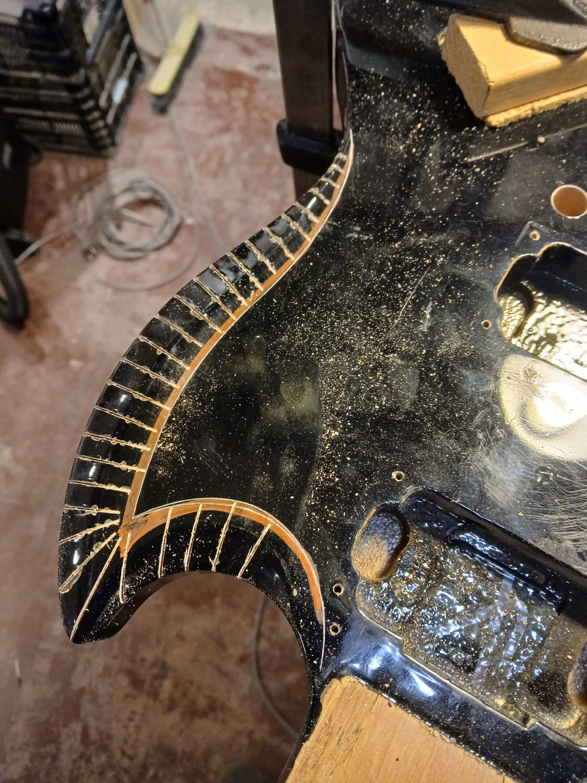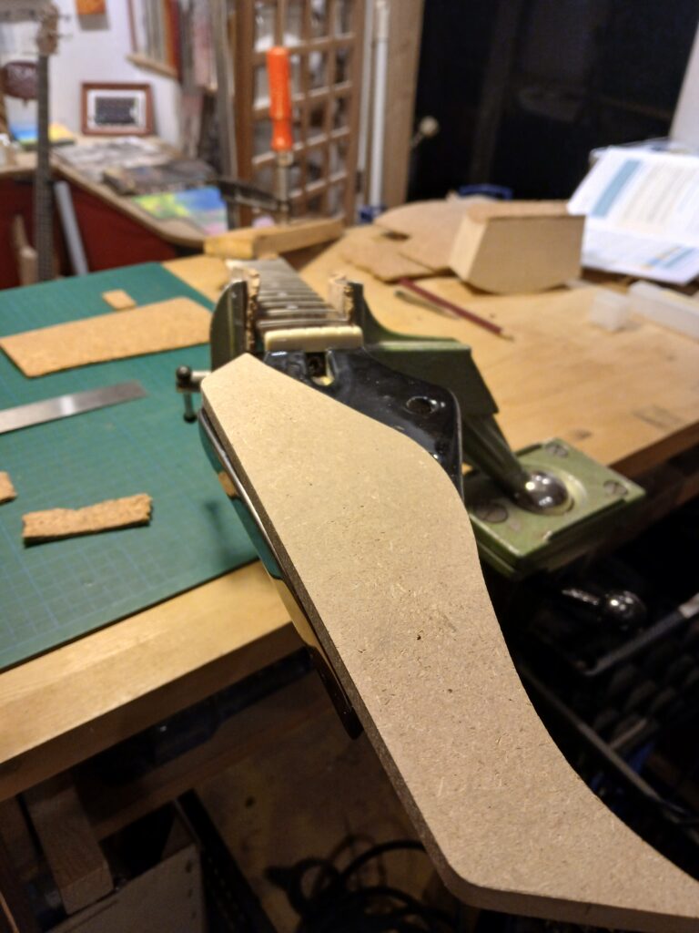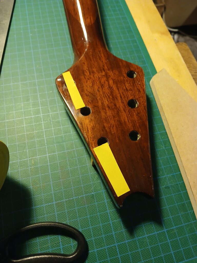 J’ai commencé par affiner la tête (inspirée par la Flying V de Gibson). Ensuite, j’ai rendu tous leur sens aux chanfreins du corps (inspiré par la SG de Gibson).