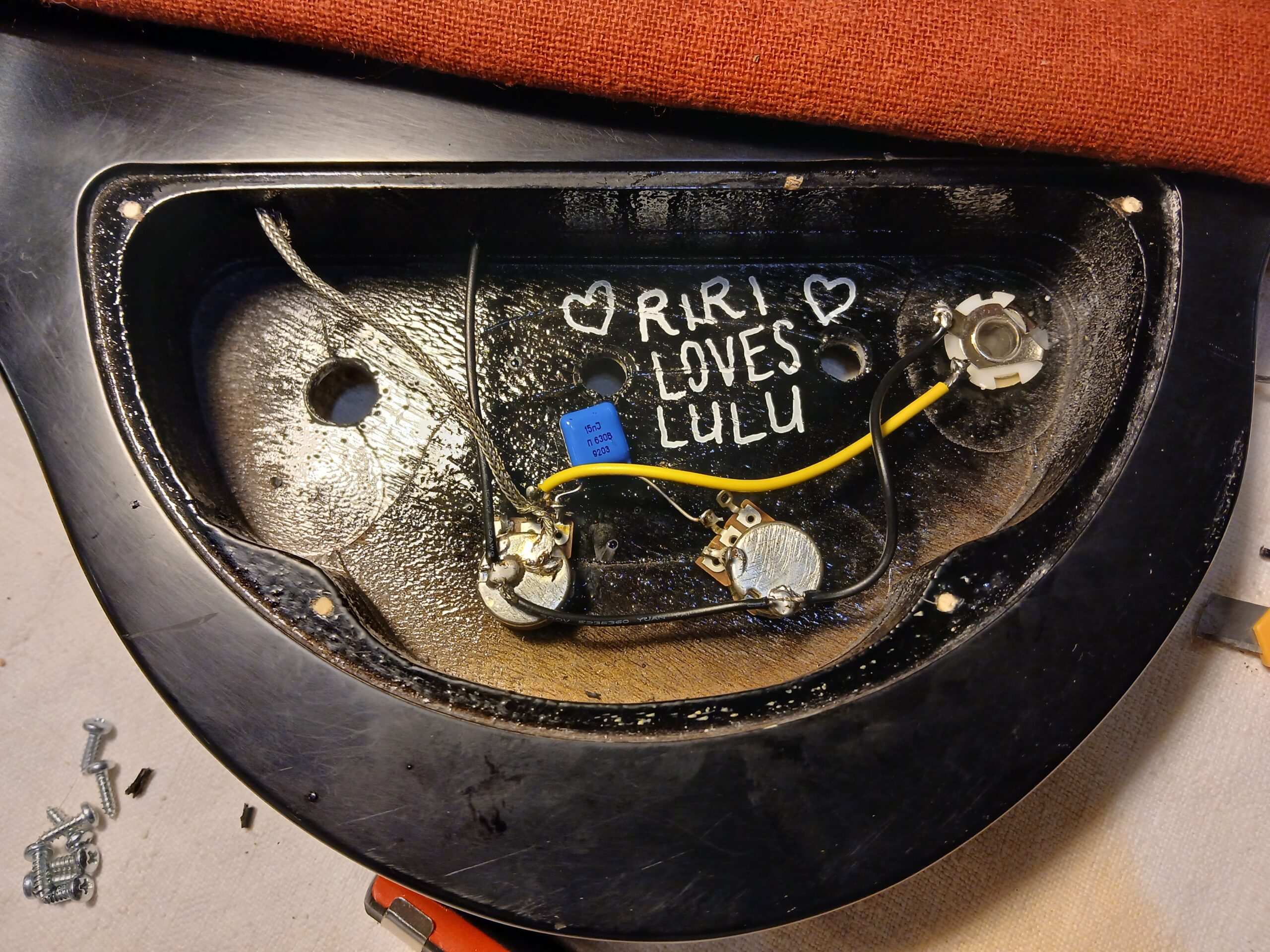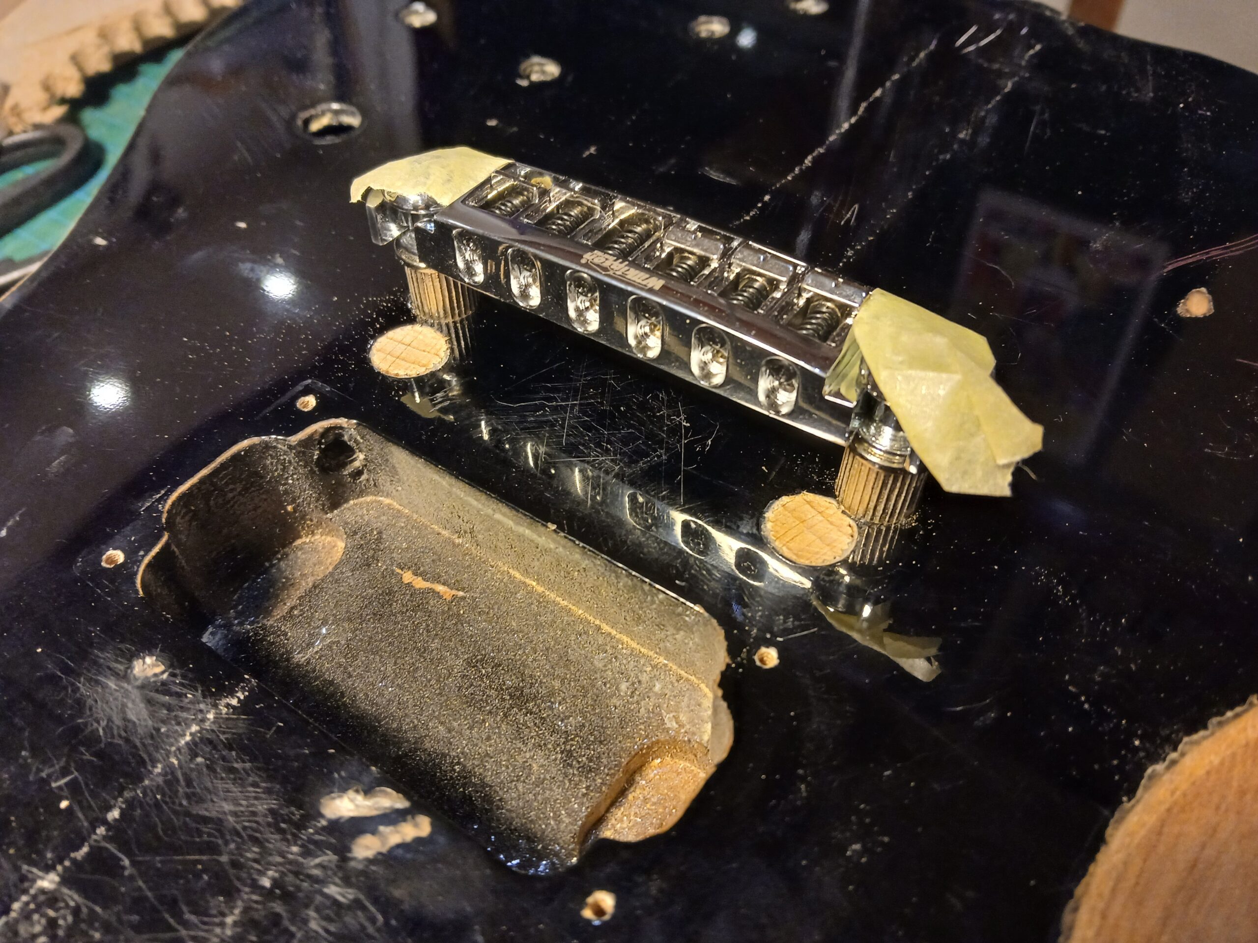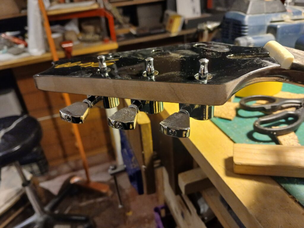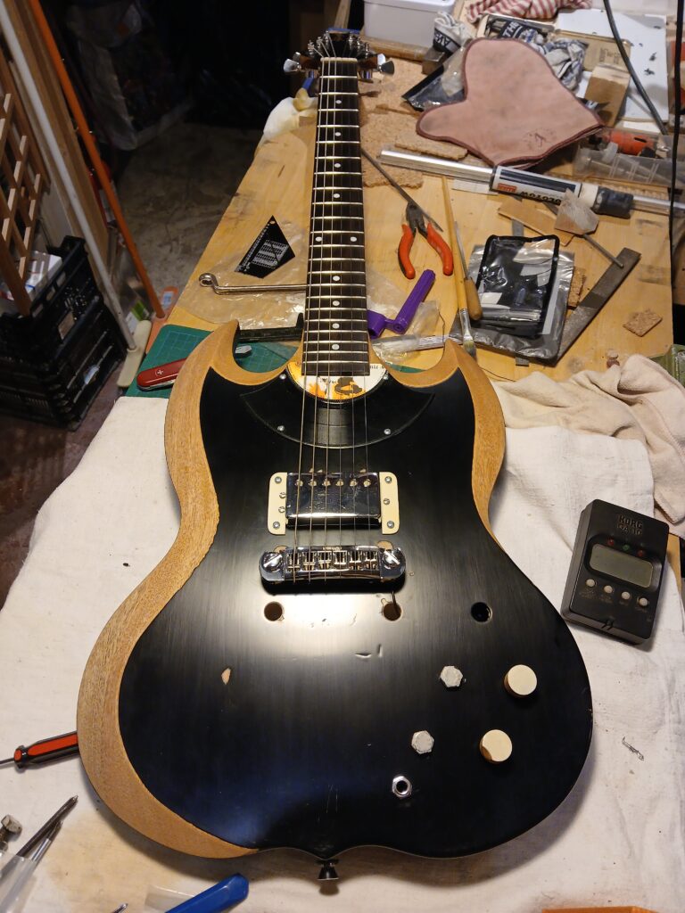 Dans le cadre de ma nouvelle activité de luthier en guitare, je conçois une gratte tout terrain pour passer entre les mains de mes clients, le temps que je répare leur gratte. Elle est composée d’un assemblage de pièces diverses. Le manche et le corps, des pièces Stagg, font partie d’un lot que j’ai échangées contre l’une de mes créations lors de ma formation. Le humbucker équipait autrefois la Old Kraftsman que j’ai restaurée. Les pièces d’accastillage et électriques sont neuves.