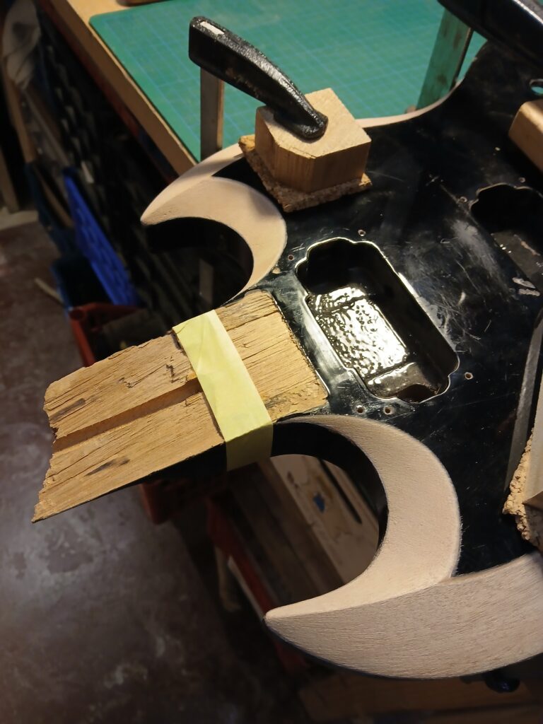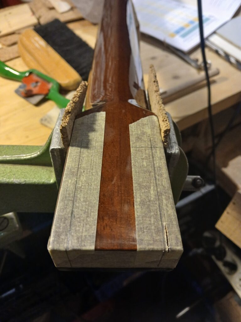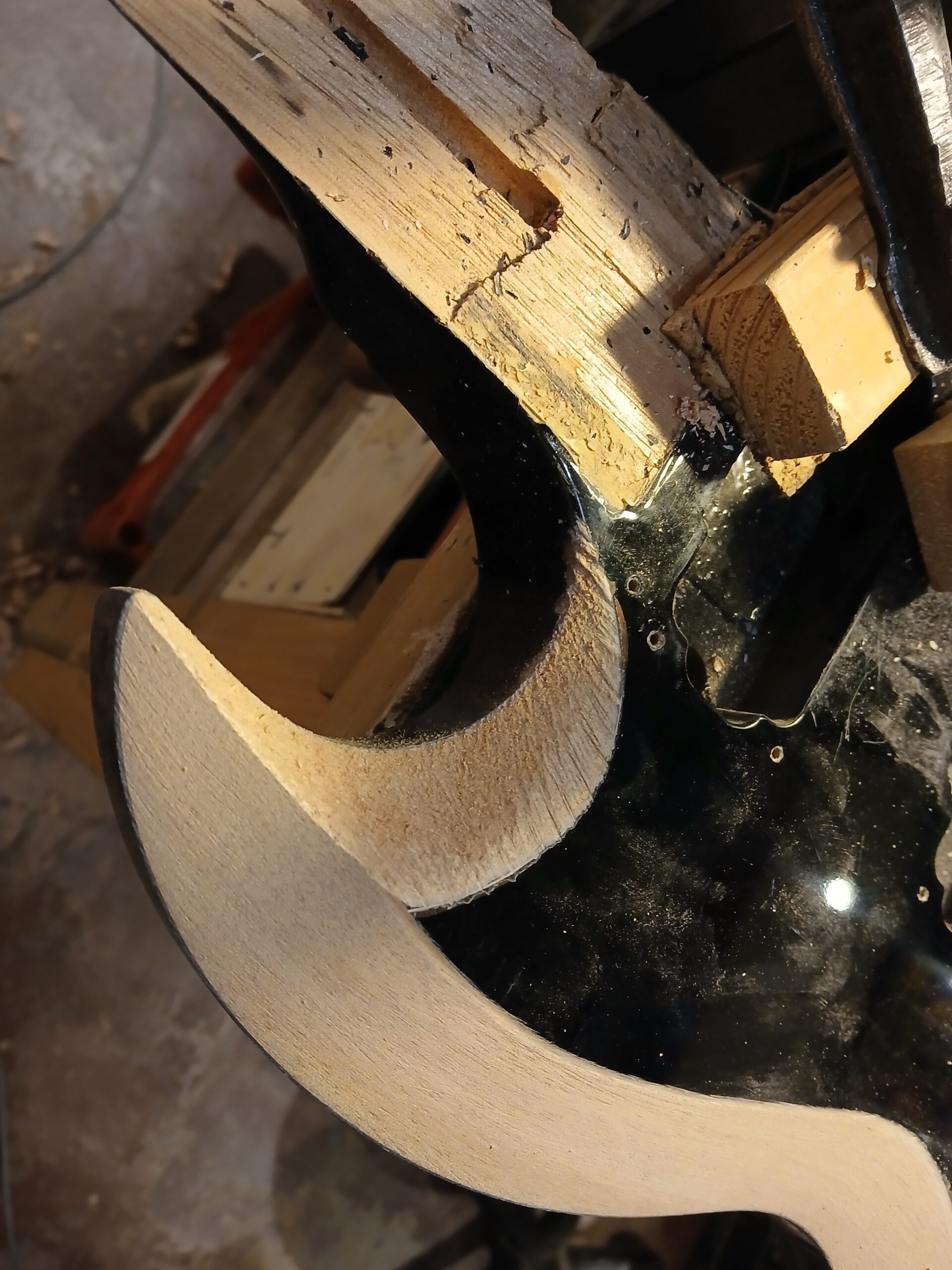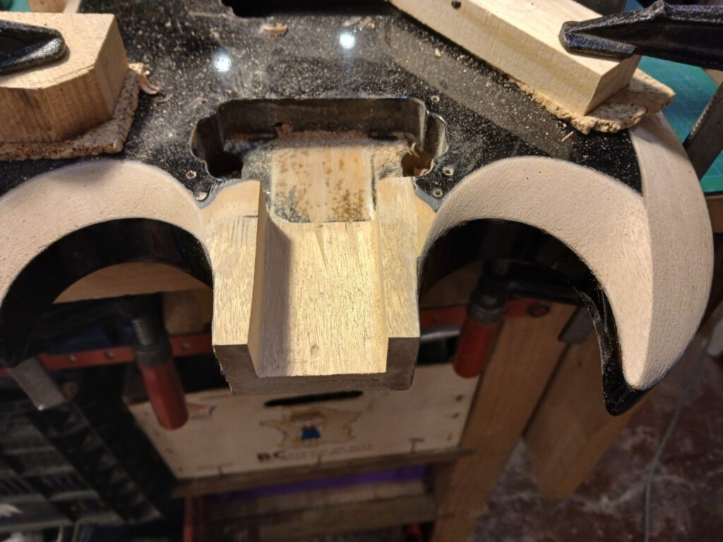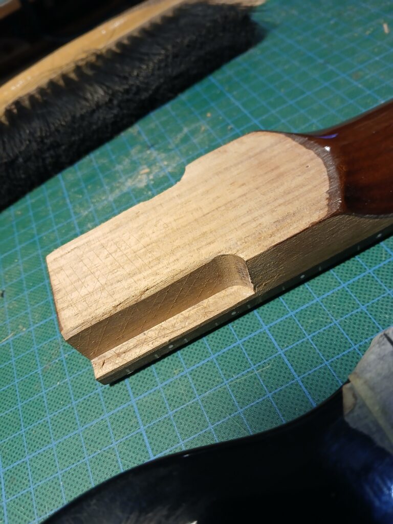 Comme on peut le voir sur la dernière photo, ce manche comptait un manche collé… mal collé, mais ce n’est pas ça qui a causé sa rupture. J’enlève ce qu’il en reste et prépare une nouvelle poche pour le nouveau manche.
