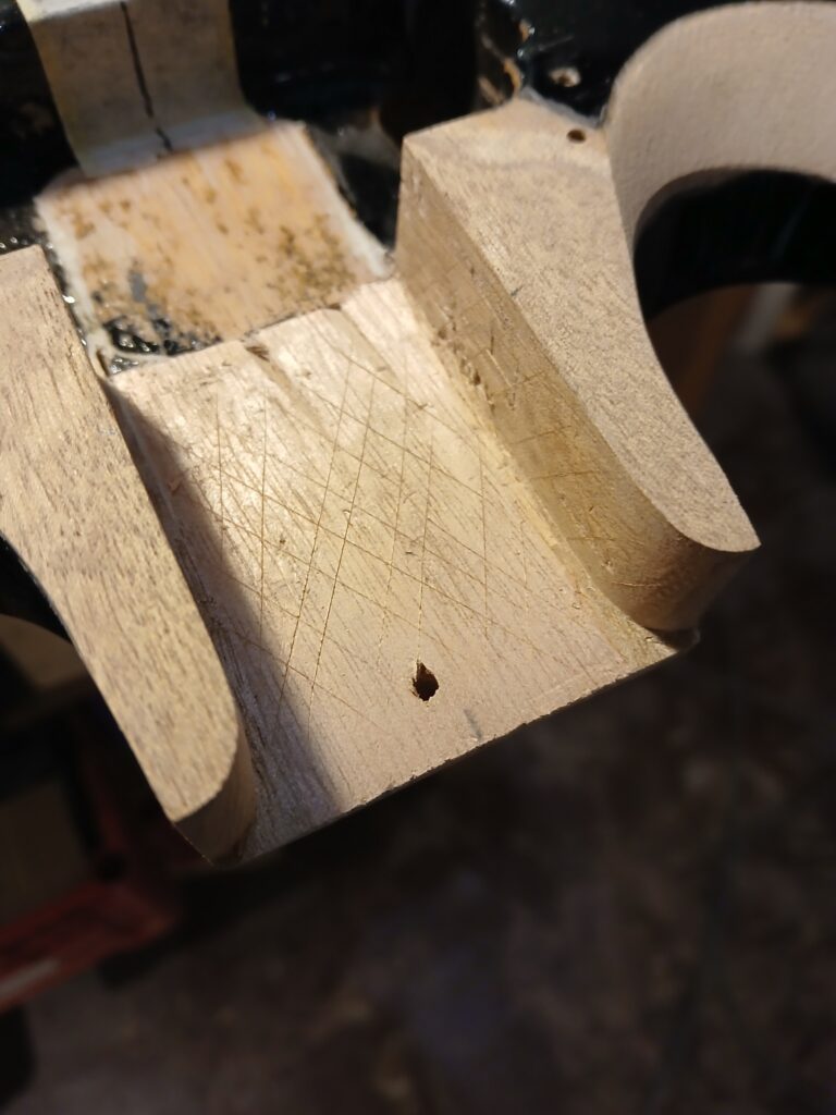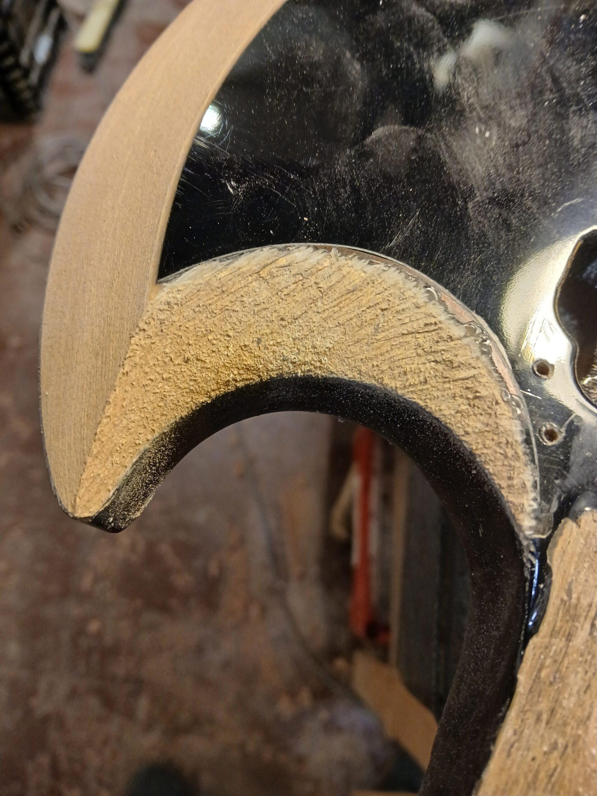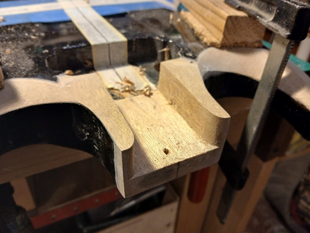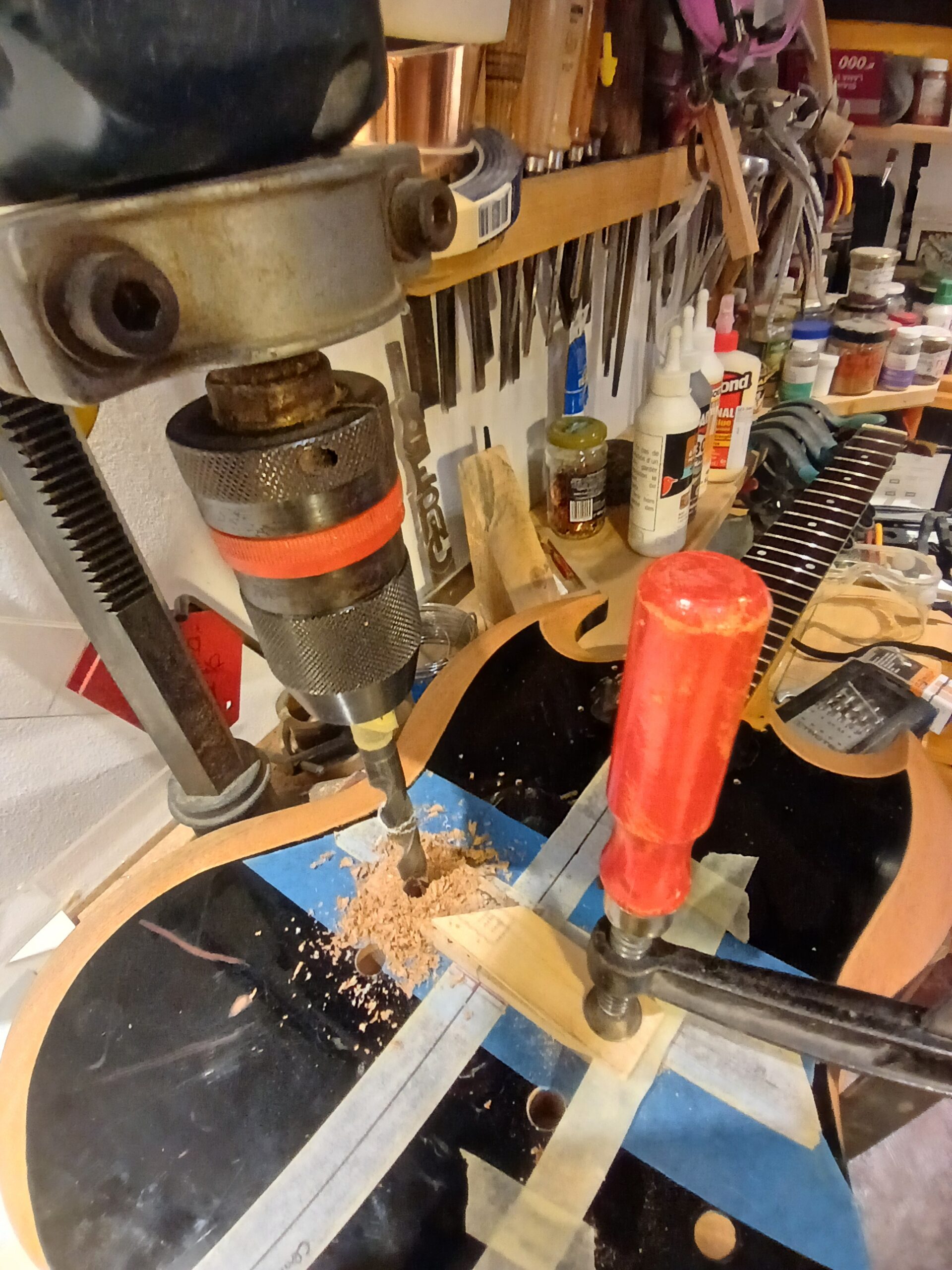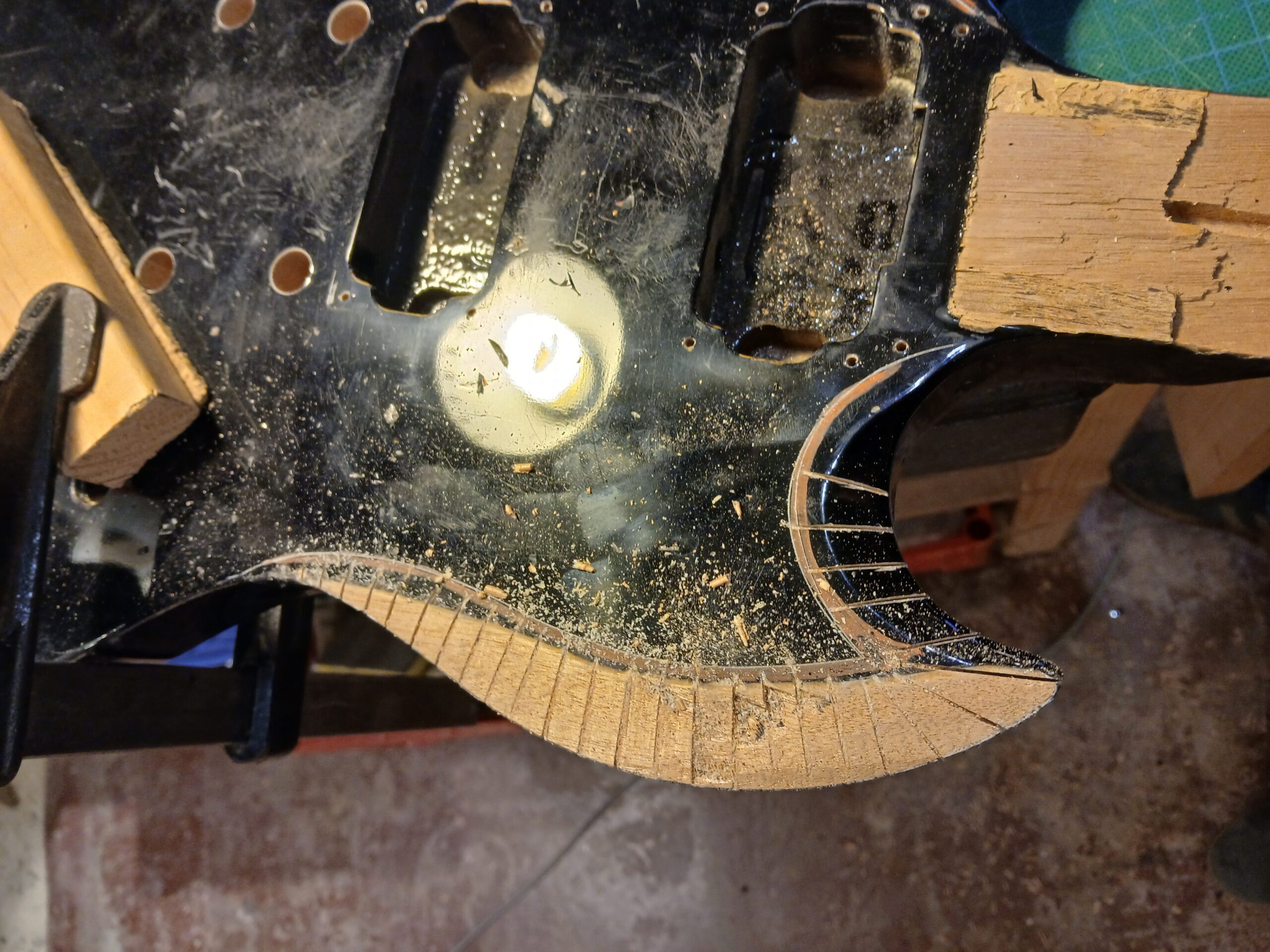 Comme on peut le voir sur la dernière photo, ce manche comptait un manche collé… mal collé, mais ce n’est pas ça qui a causé sa rupture. J’enlève ce qu’il en reste et prépare une nouvelle poche pour le nouveau manche.