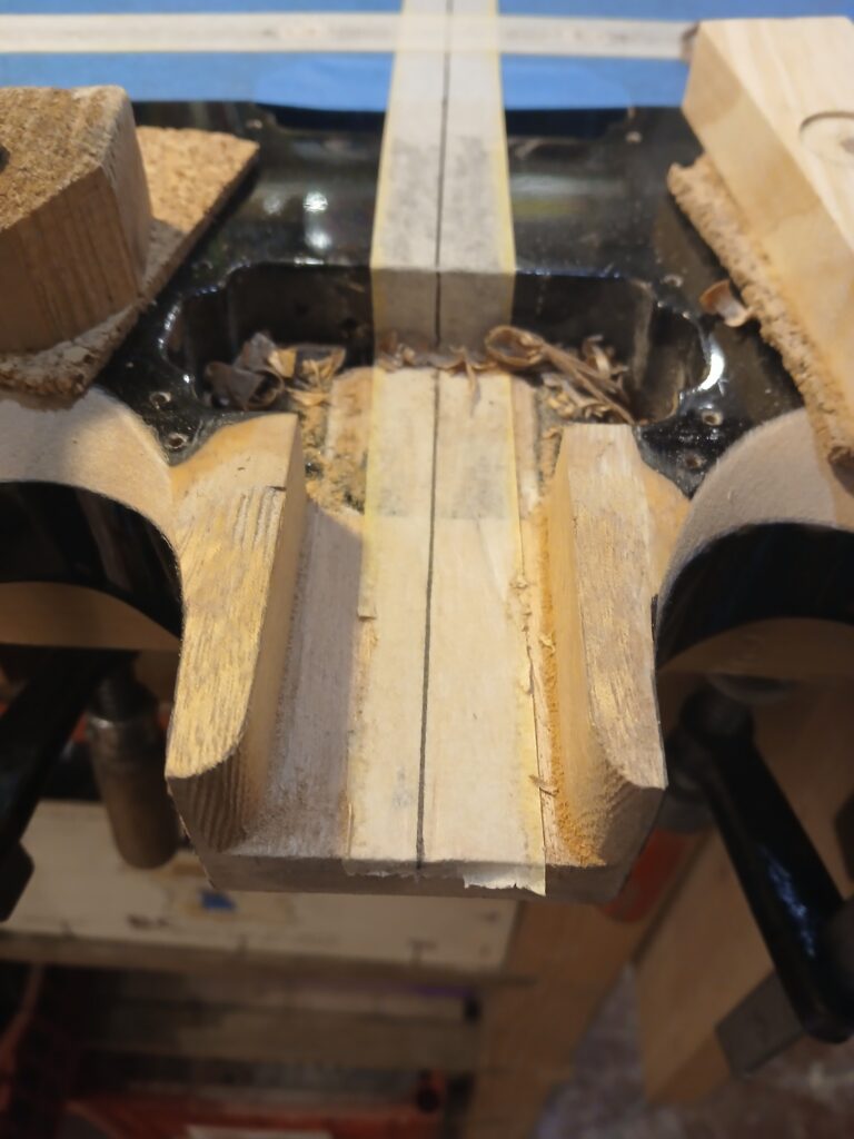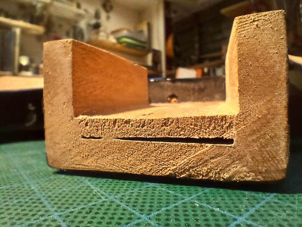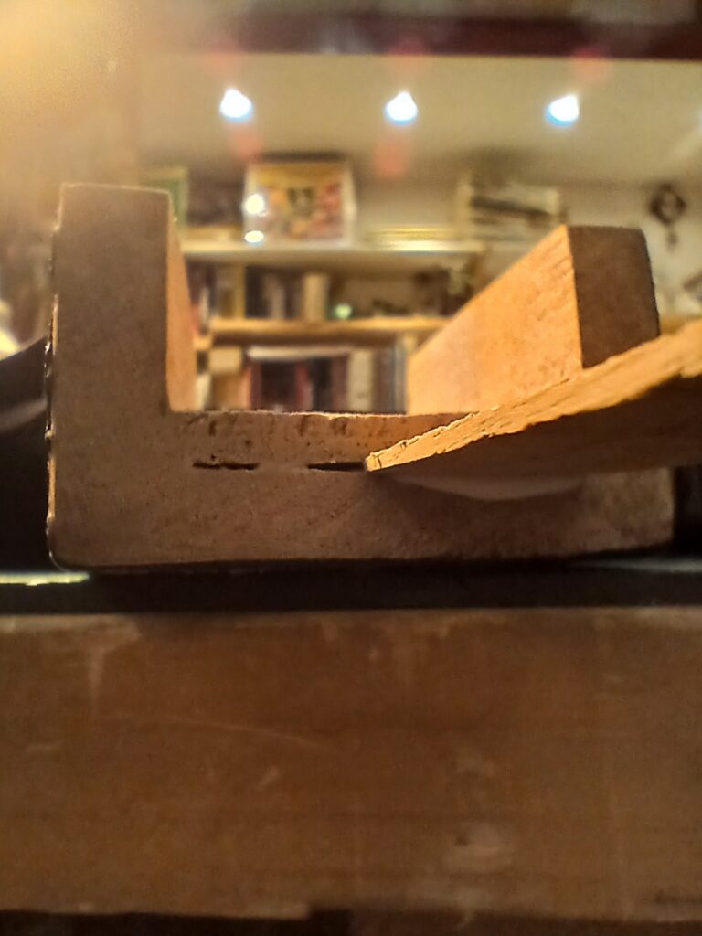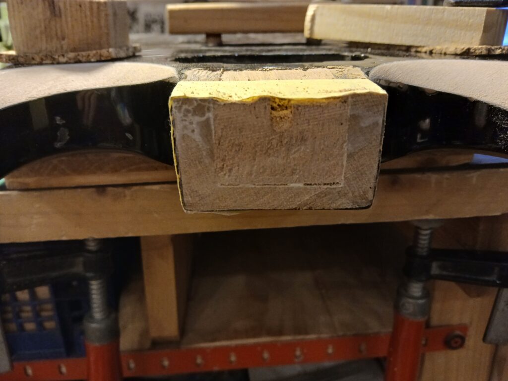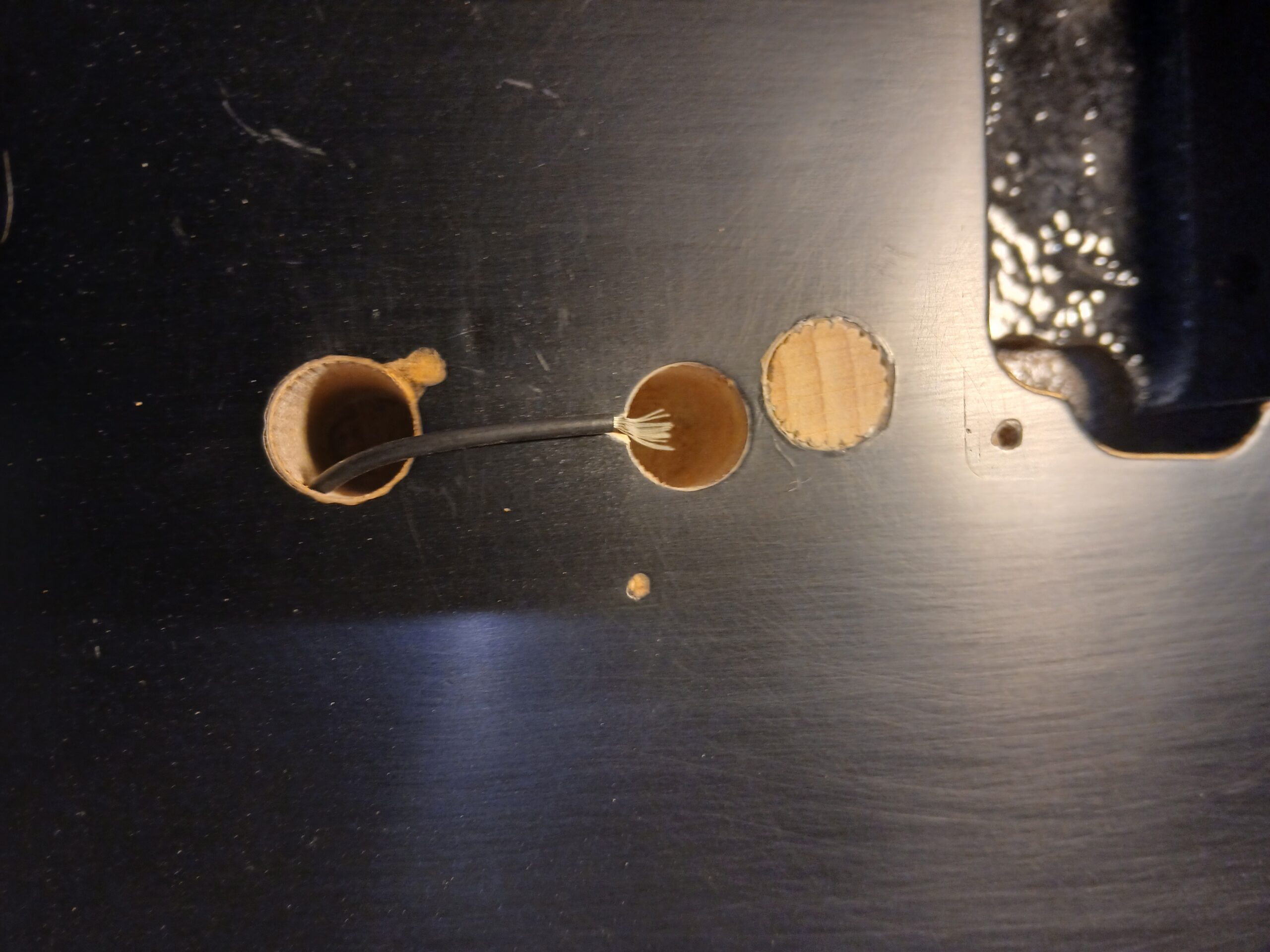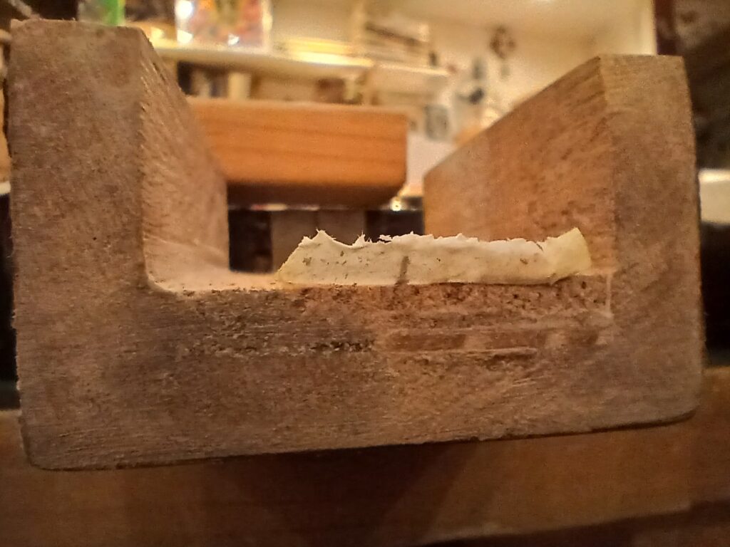 Comme on peut le voir sur la dernière photo, ce manche comptait un manche collé… mal collé, mais ce n’est pas ça qui a causé sa rupture. J’enlève ce qu’il en reste et prépare une nouvelle poche pour le nouveau manche.