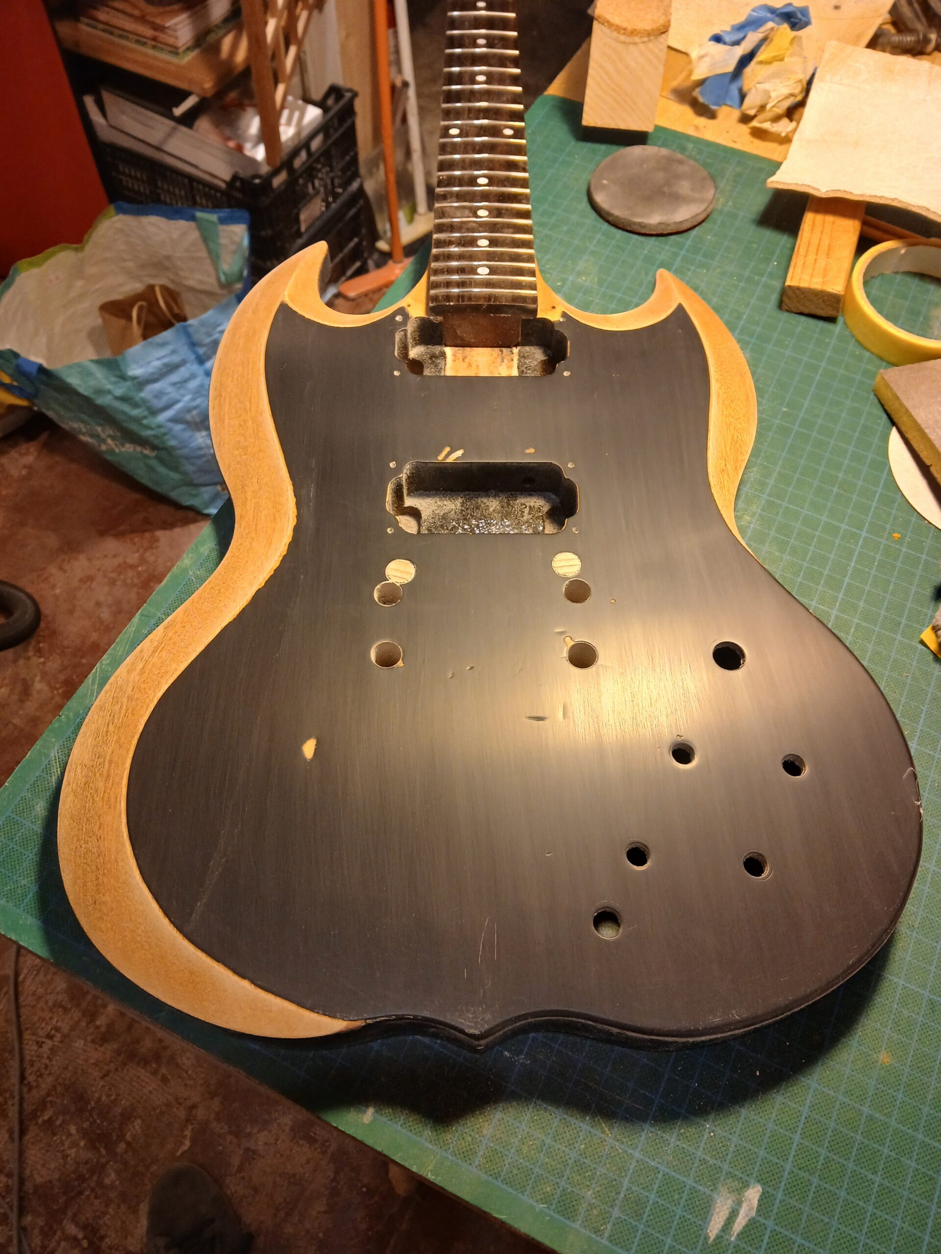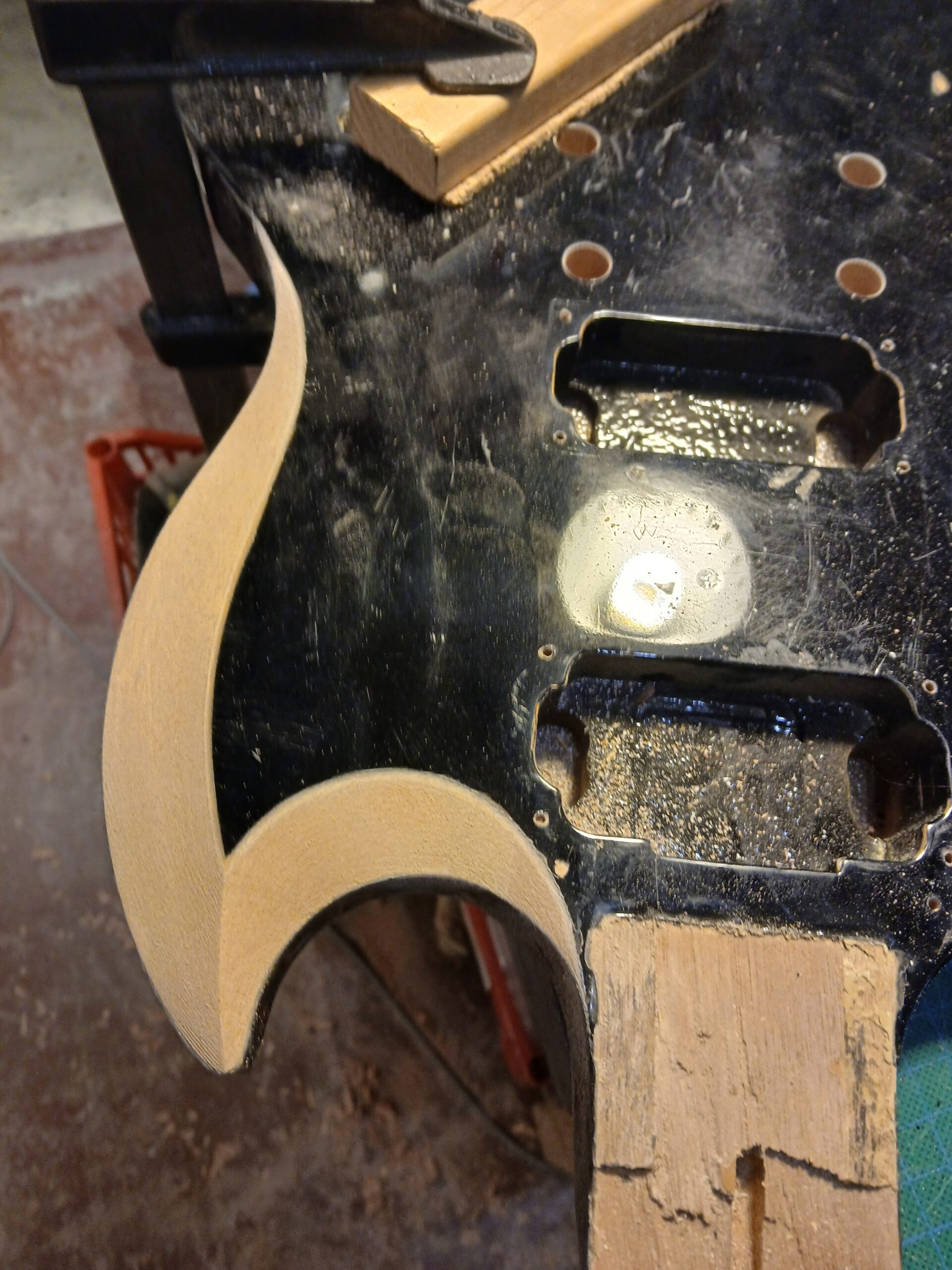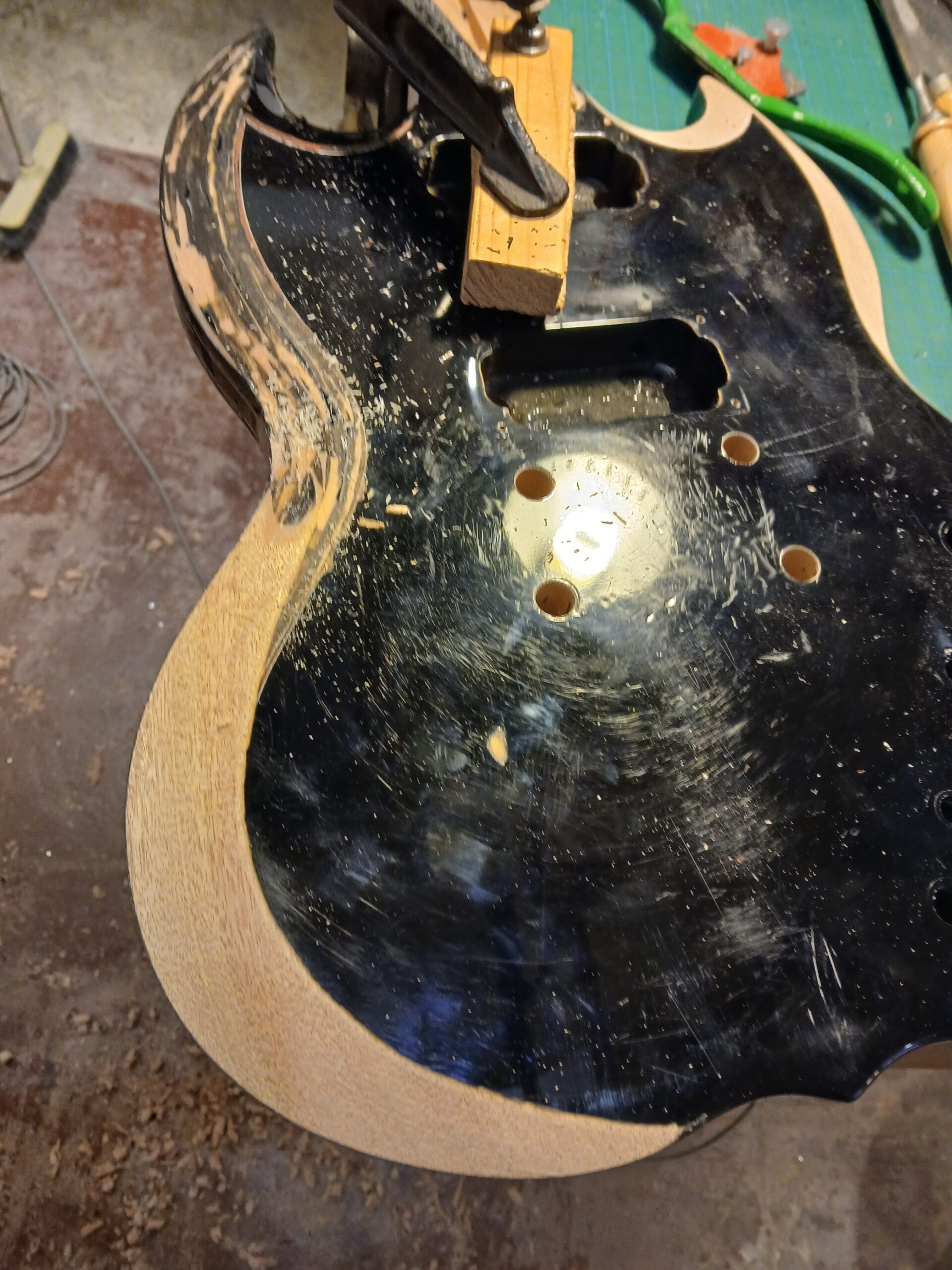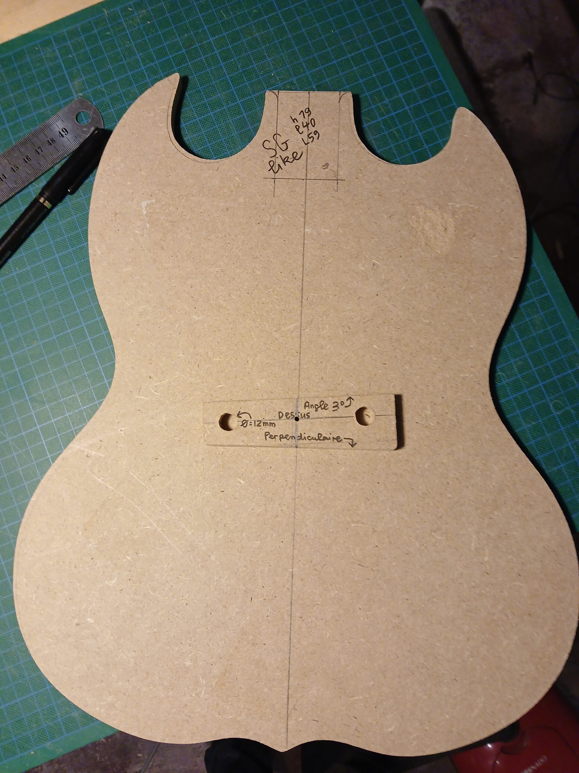 J’en ai profité pour faire des gabarits du corps et du wraparound. C’était une copie de SG, que je transforme en copie de SG junior, et comme elle aura un côté bourlingue, elle s’appelle SG sénior. Avec un micro humbucker capoté, un volume et une tonalité.
