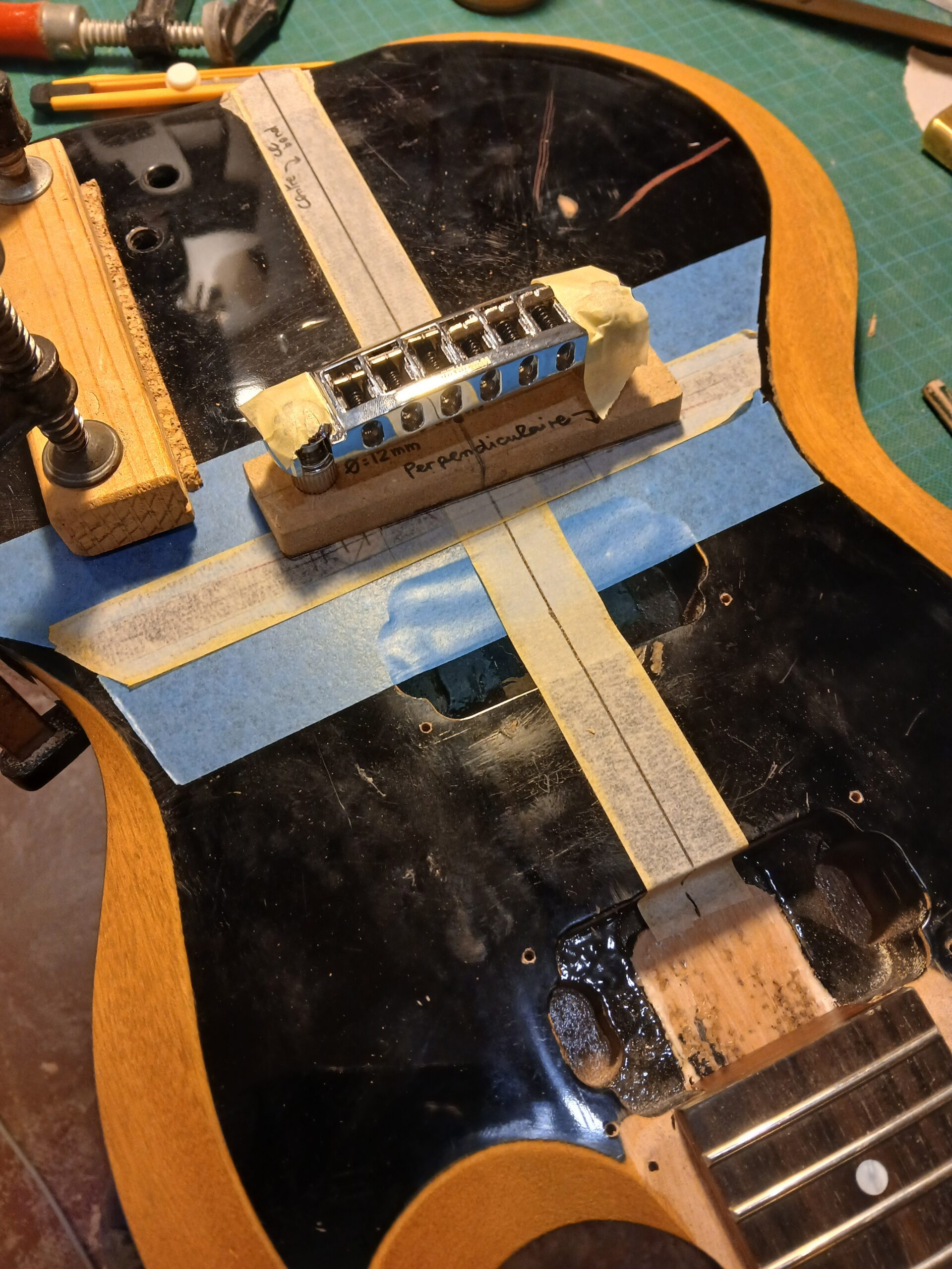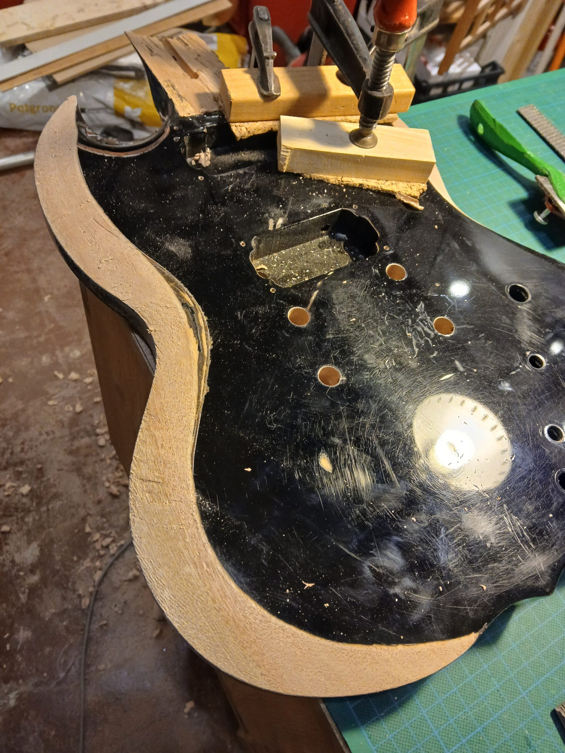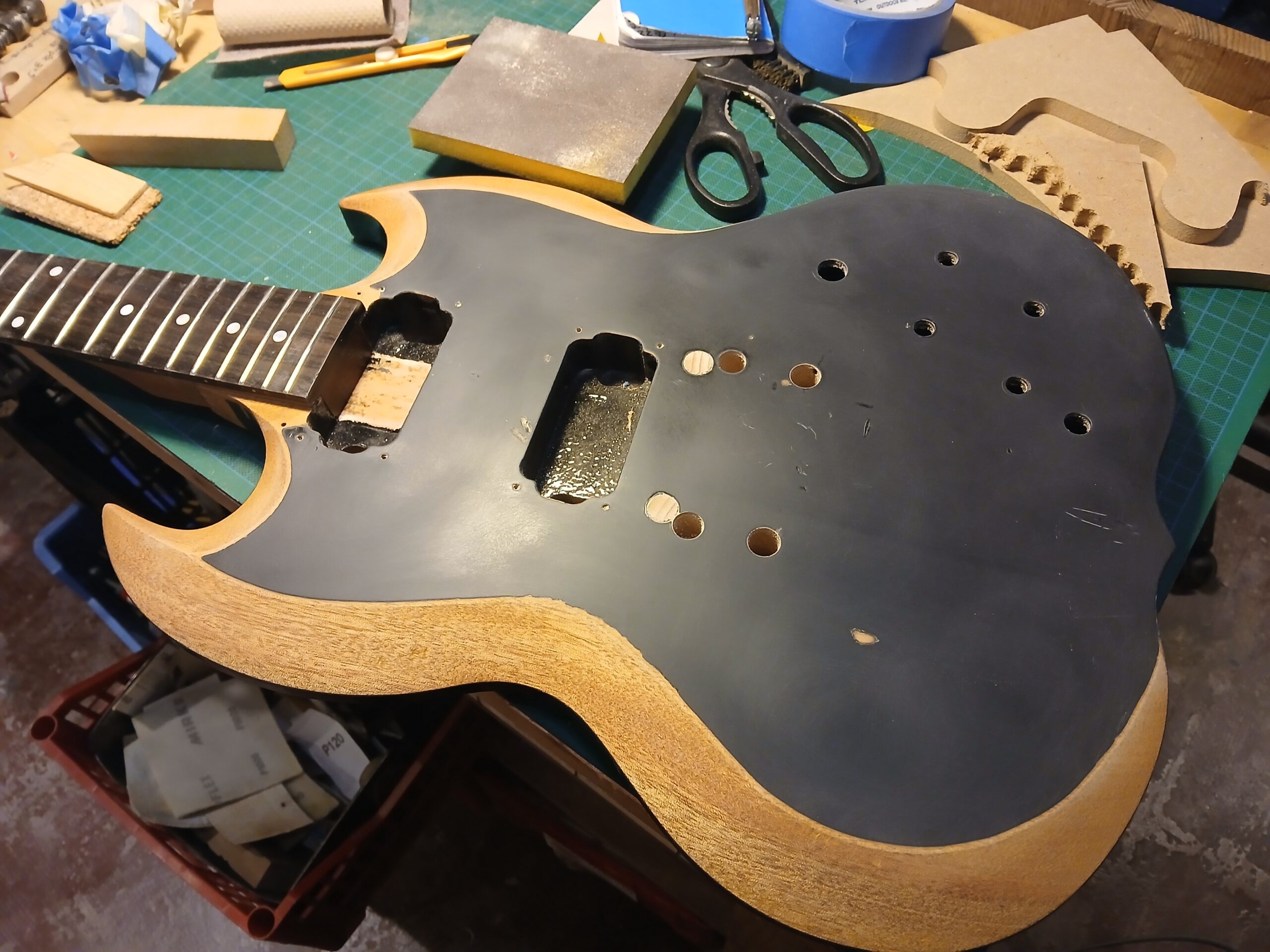 J’en ai profité pour faire des gabarits du corps et du wraparound. C’était une copie de SG, que je transforme en copie de SG junior, et comme elle aura un côté bourlingue, elle s’appelle SG sénior. Avec un micro humbucker capoté, un volume et une tonalité.